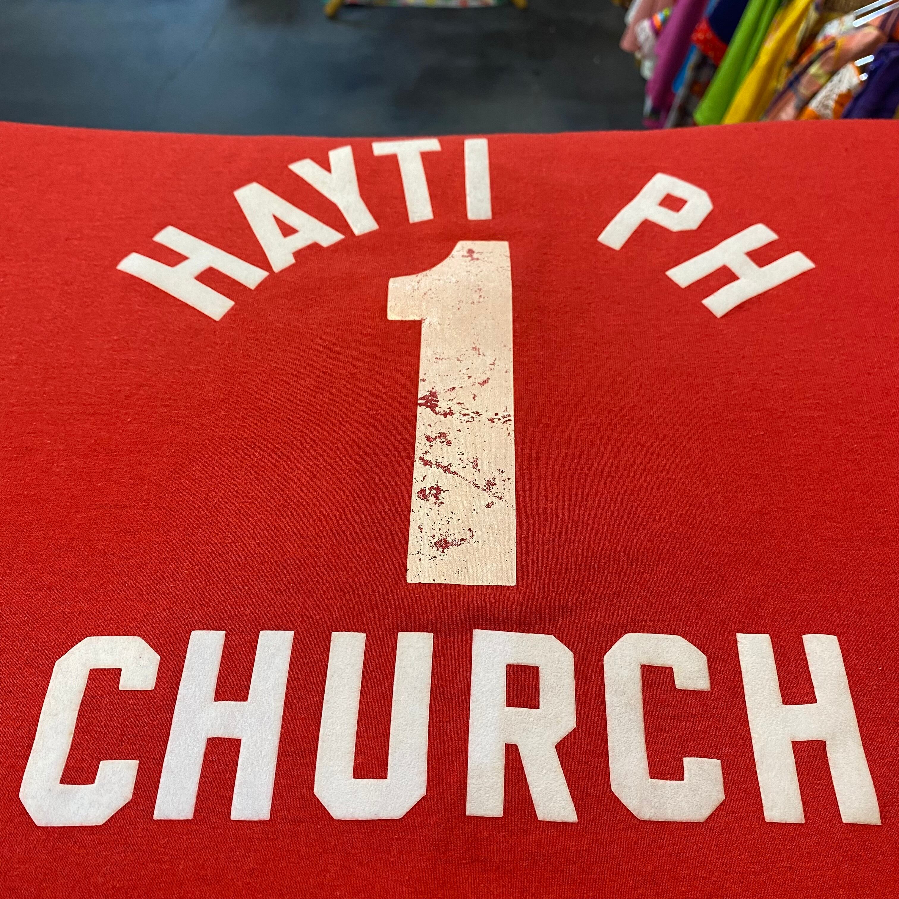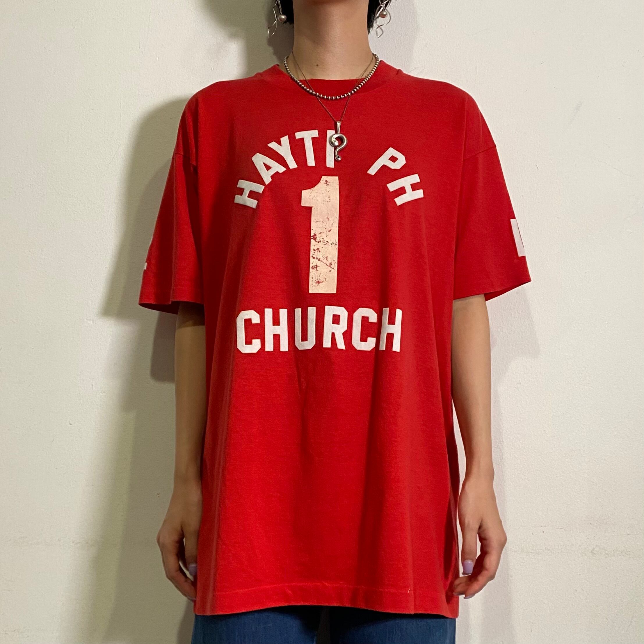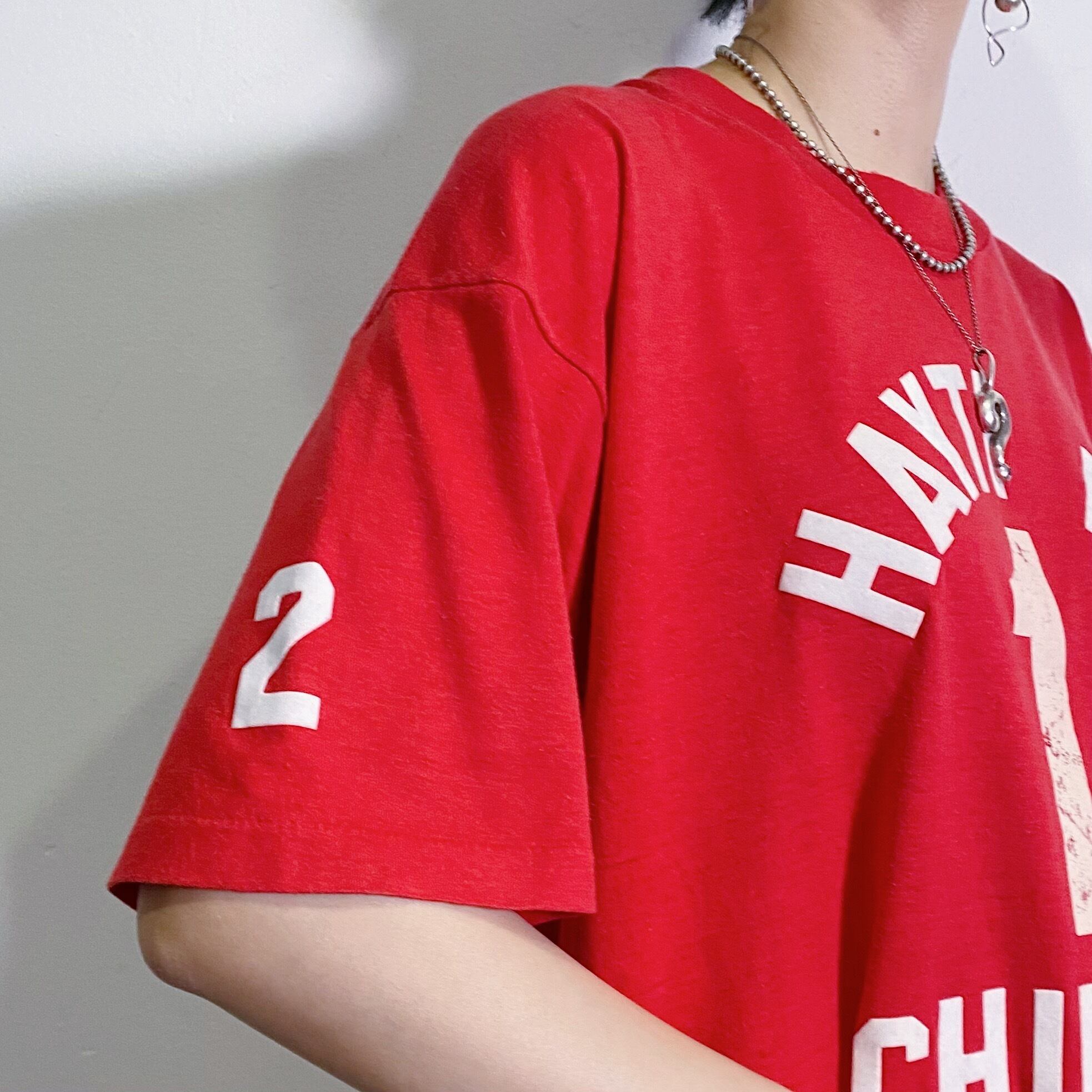 真っ赤なボディに白のプリントが映える、80年代のナンバリングTです。