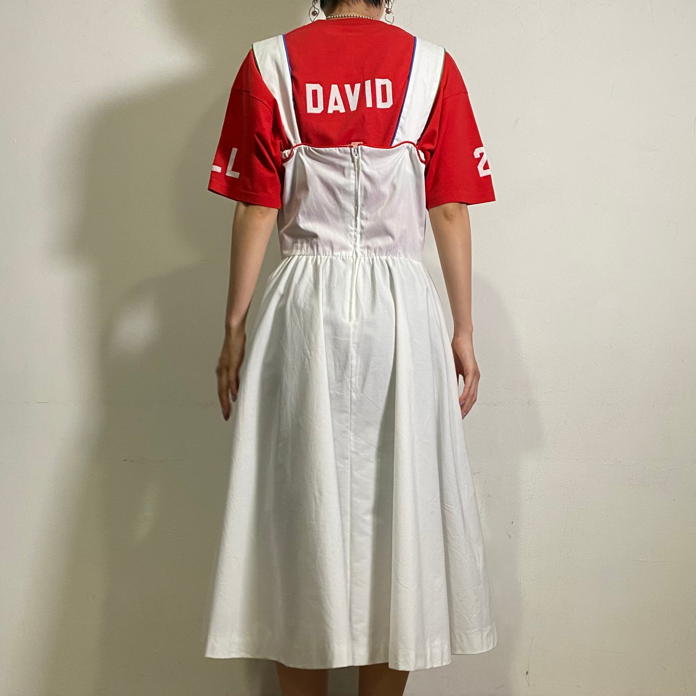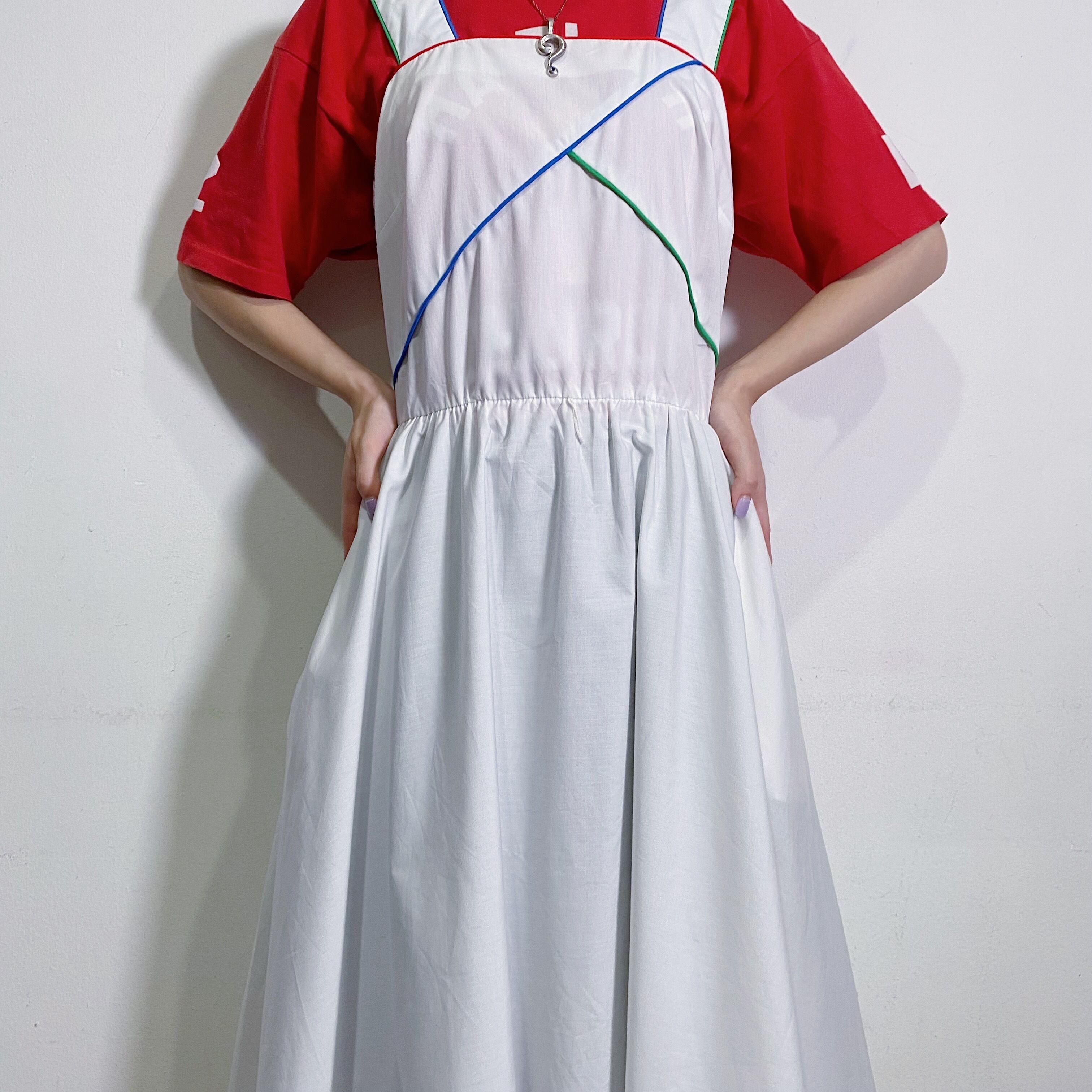 ホワイトベースに赤青緑のパイピングが可愛い、70年代のノースリーブワンピースです。