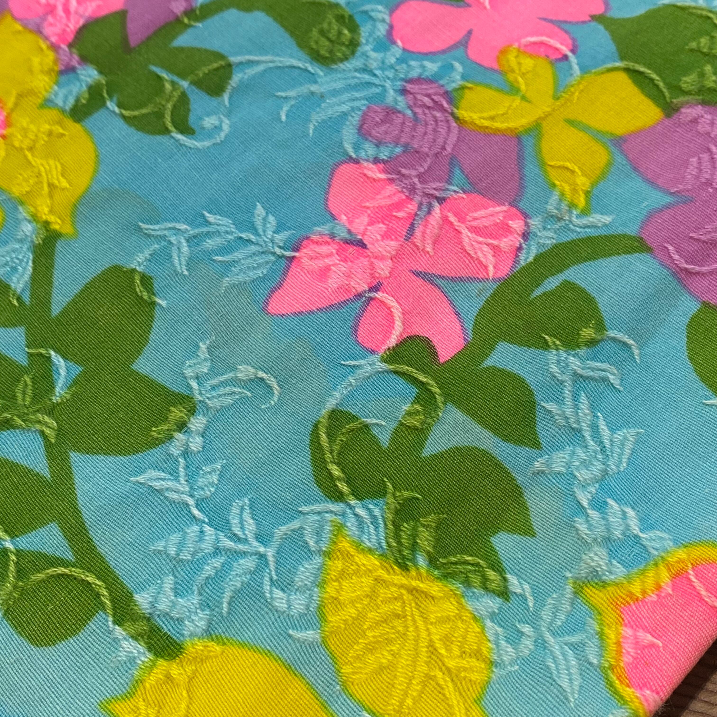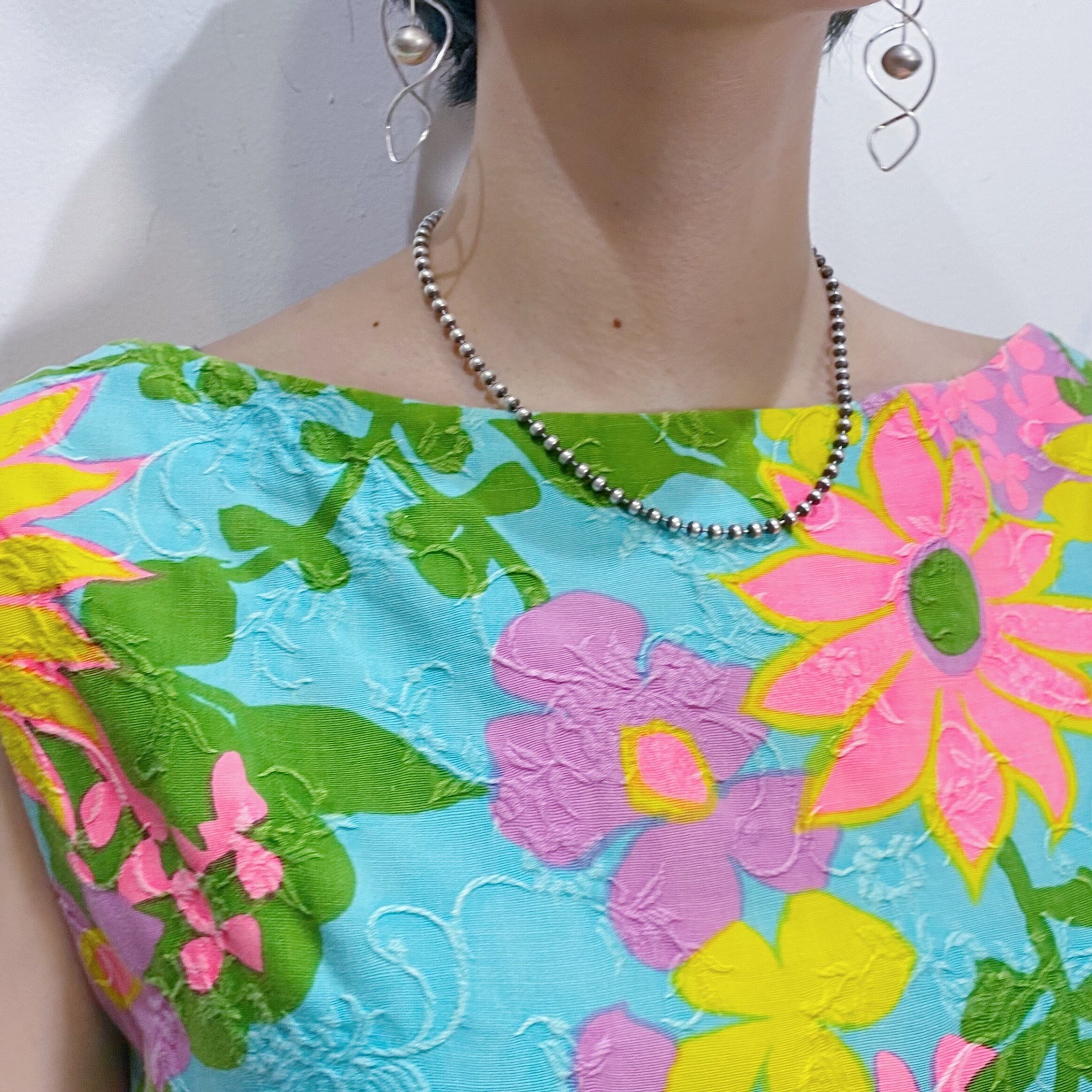 サックスブルーベースにピンクやイエローなどのハッピーな色合いの花柄が可愛い、60~70年代のハワイアンワンピースです。