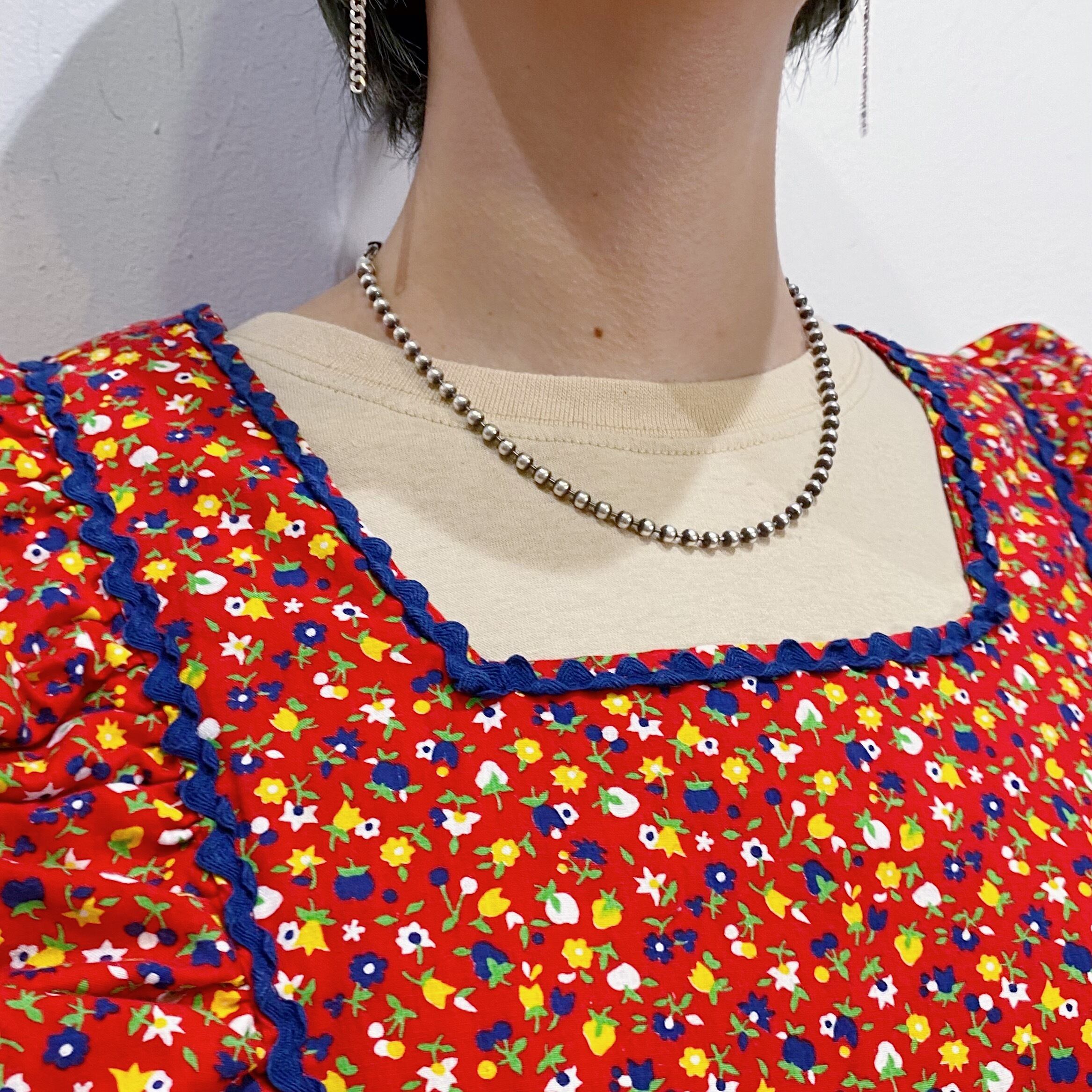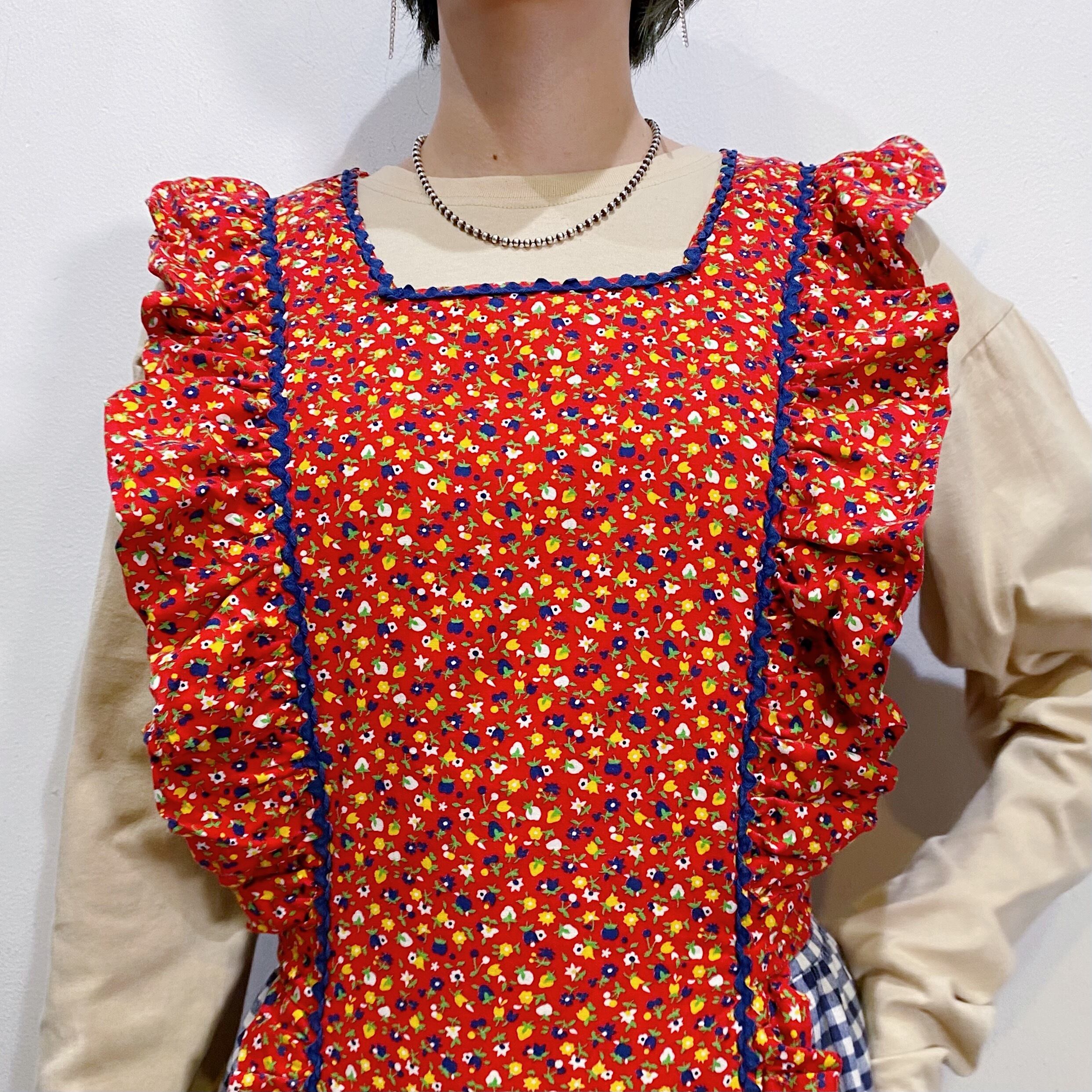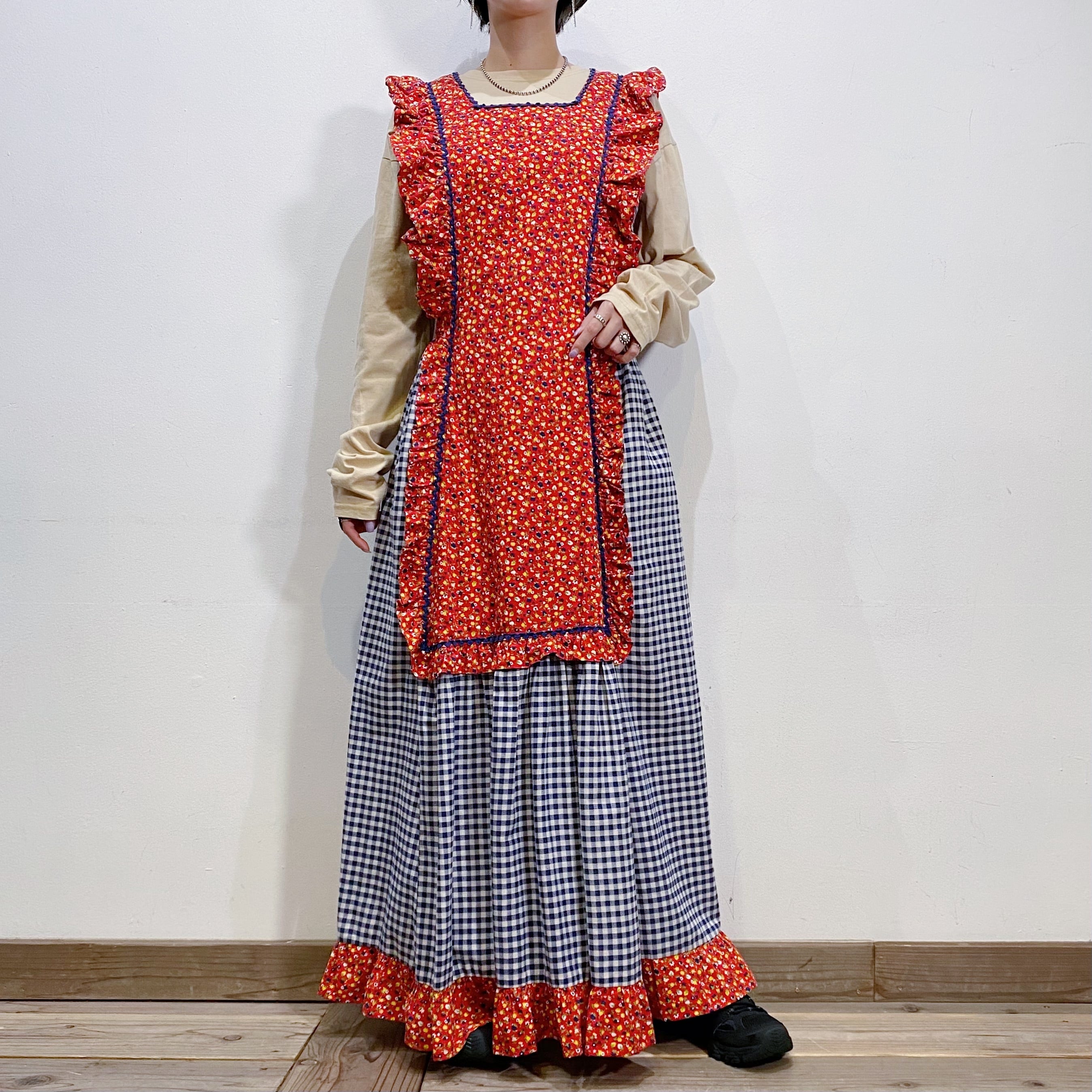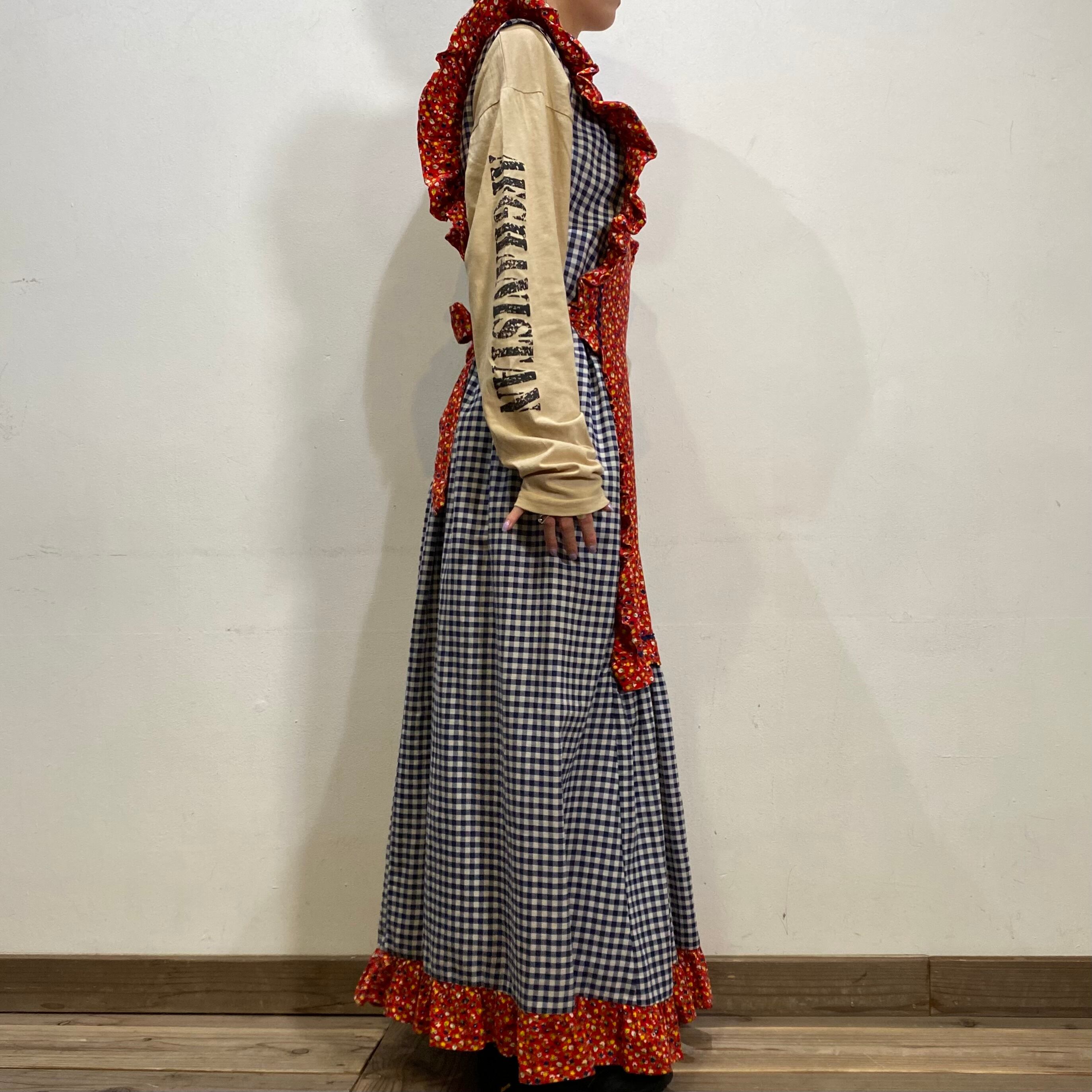 花柄とギンガムチェックの切り替えが可愛い、70年代のワンピースです。