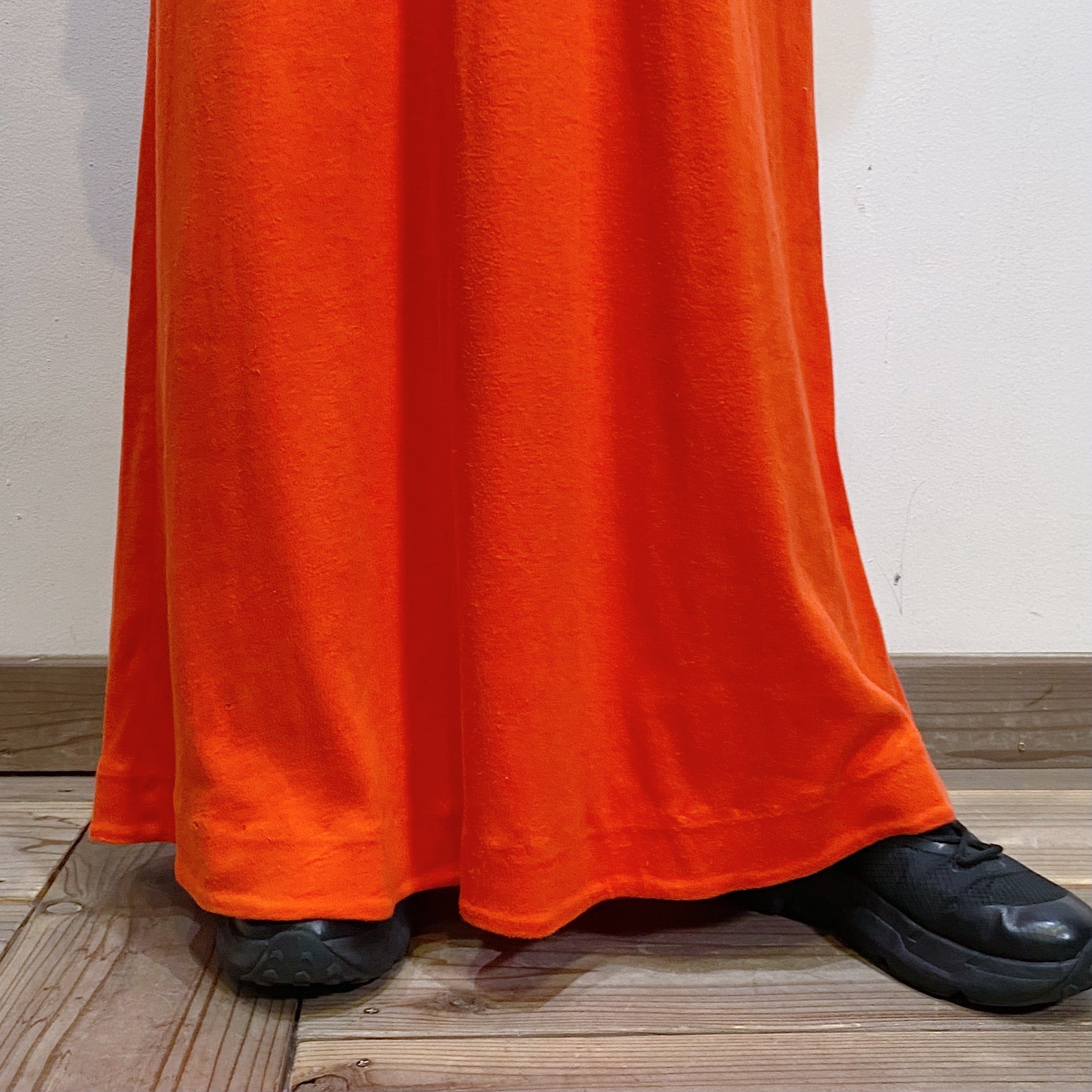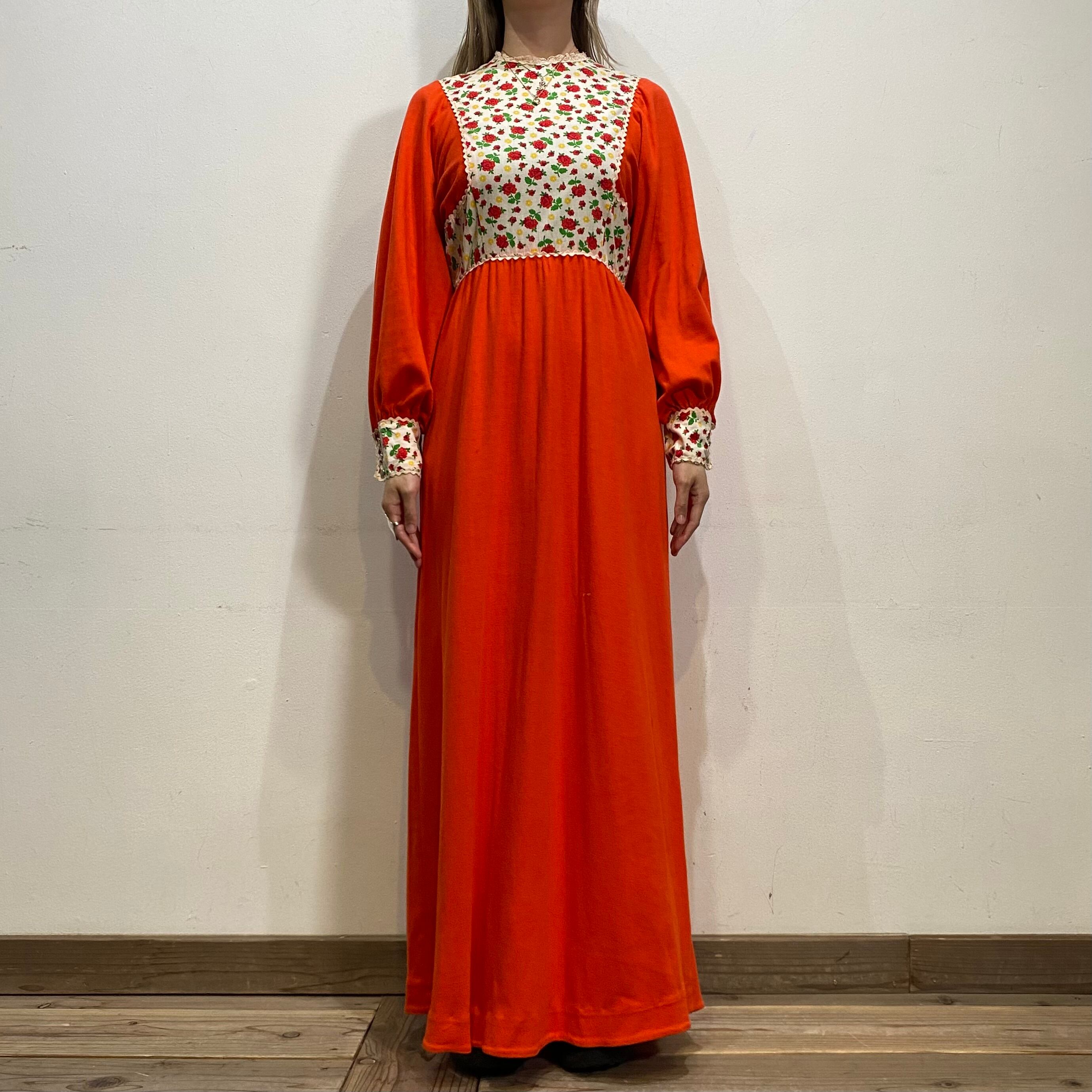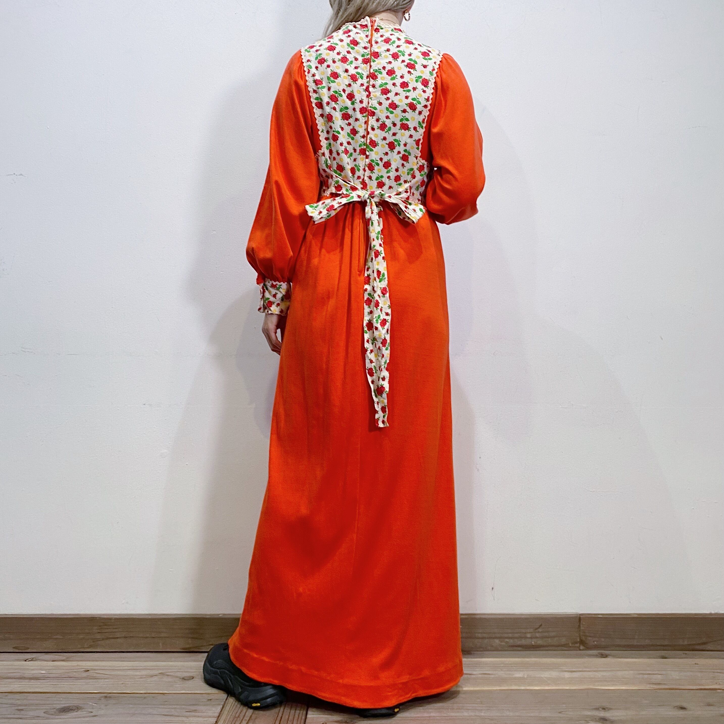 色鮮やかなオレンジと花柄の切り替えデザインが可愛い、70年代のロングワンピースです。