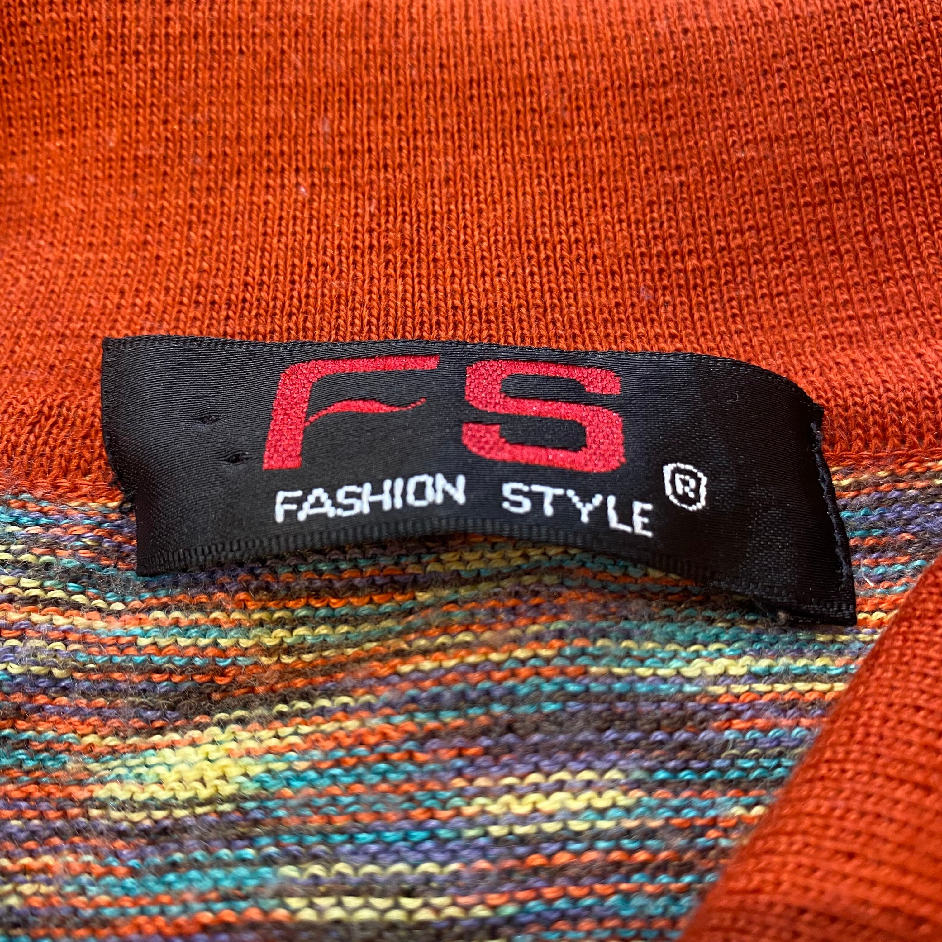 オレンジやイエロー、ブラウンなどのマーブルの糸で編まれた、薄手のセーターです。