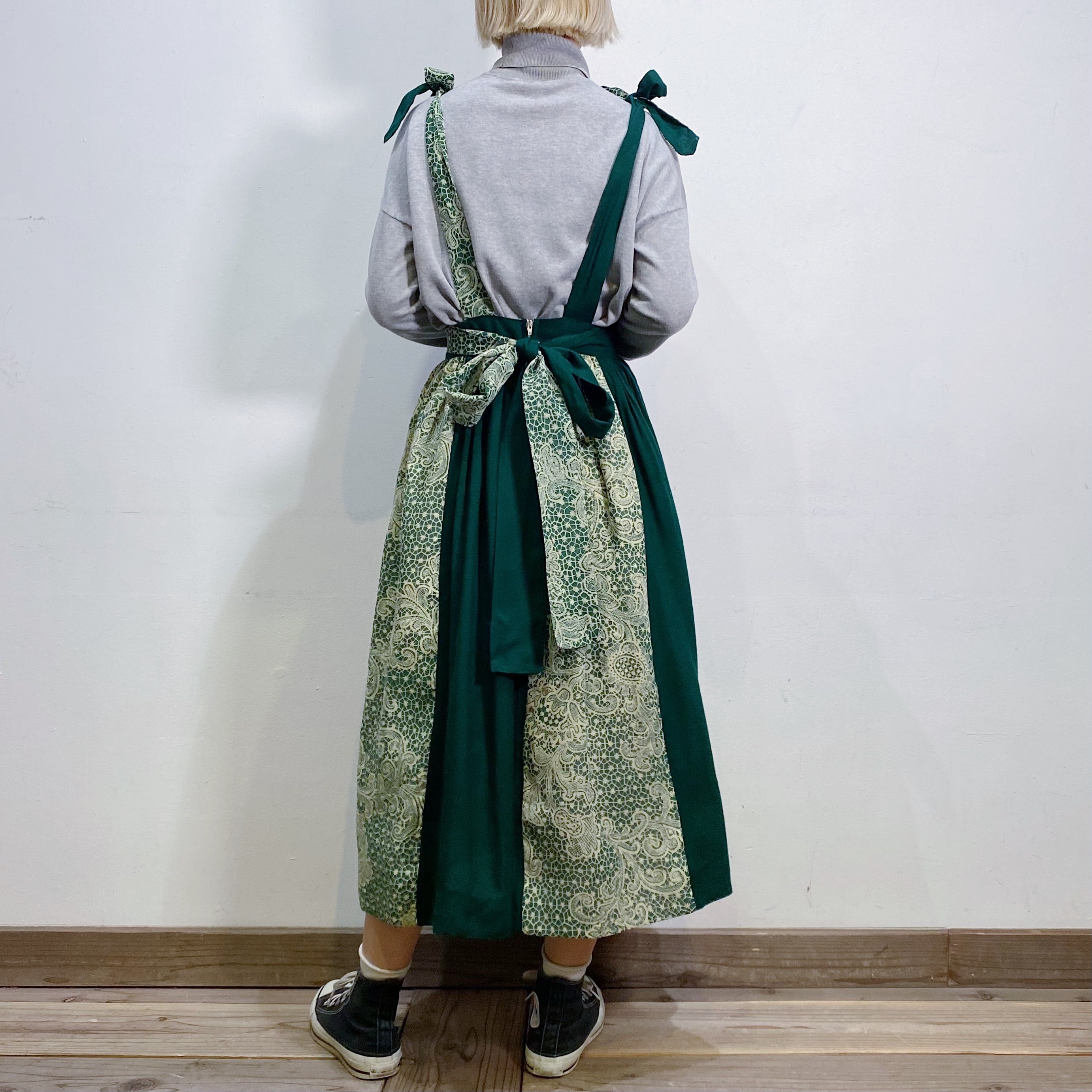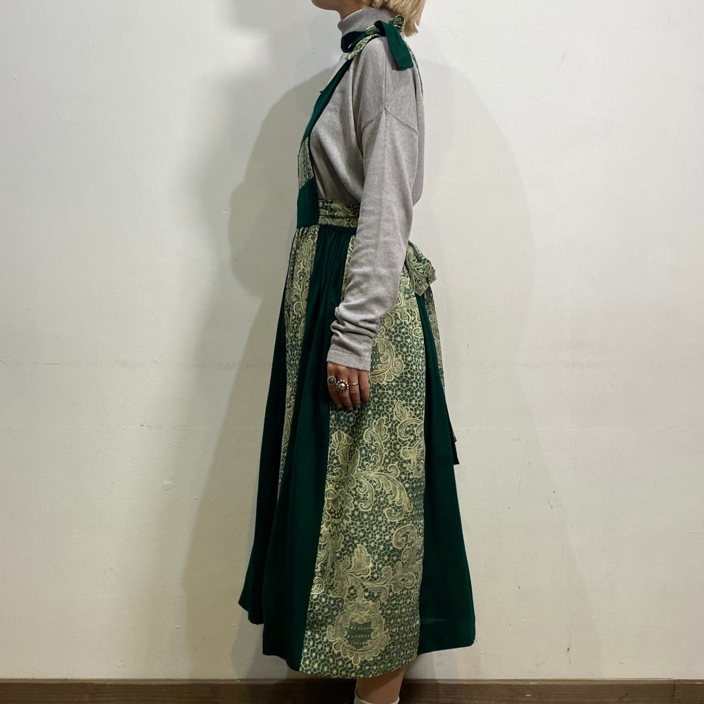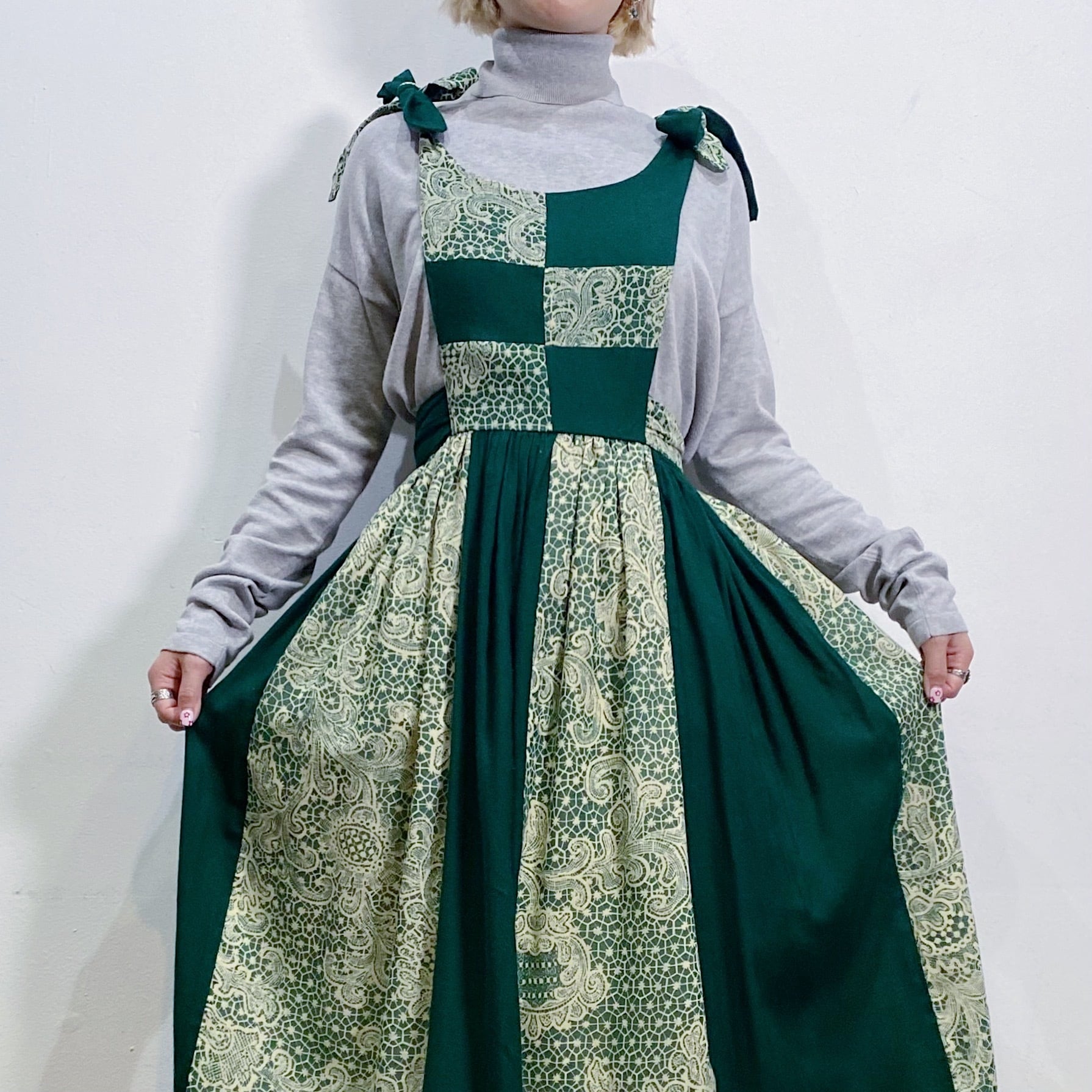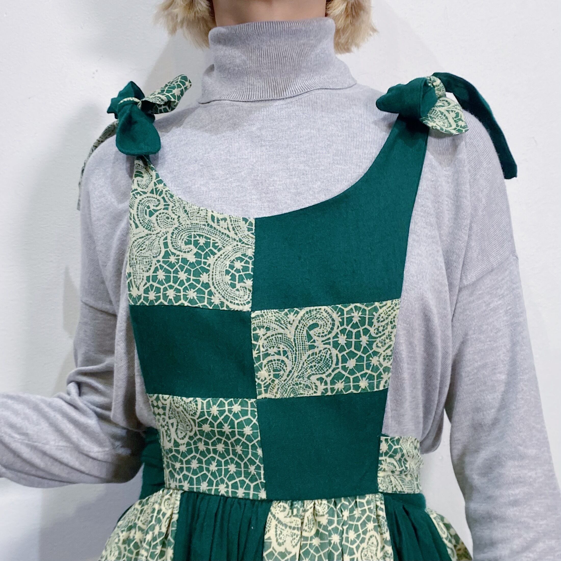 こっくりグリーンのパッチワークが可愛い、ジャンパーワンピースです。