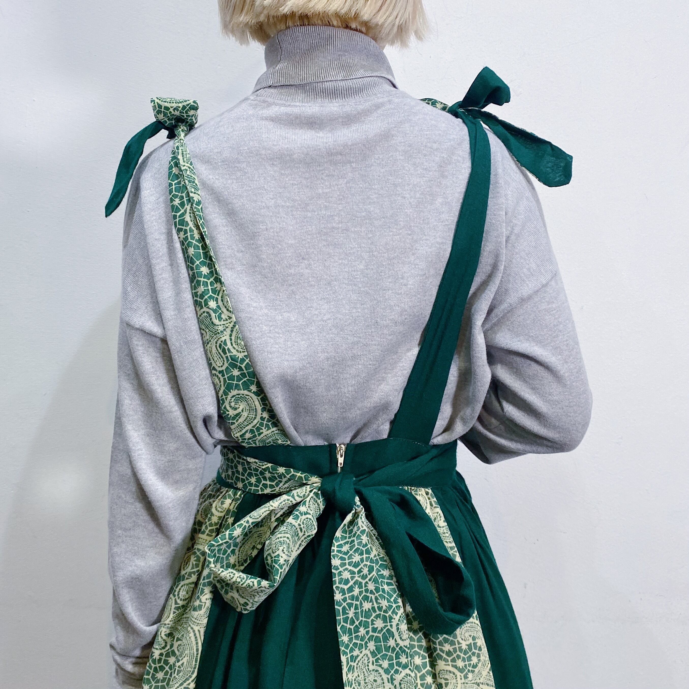 エプロンワンピースのようなデザインで、肩ひもの結び具合によって長さを変えて楽しめますよ。