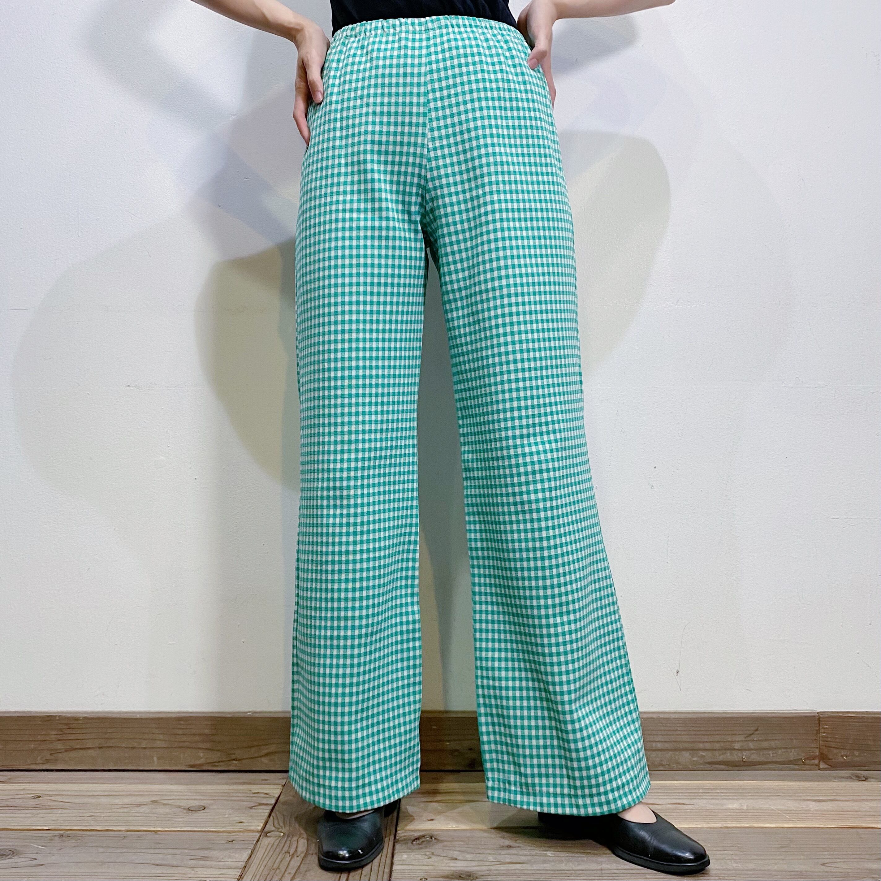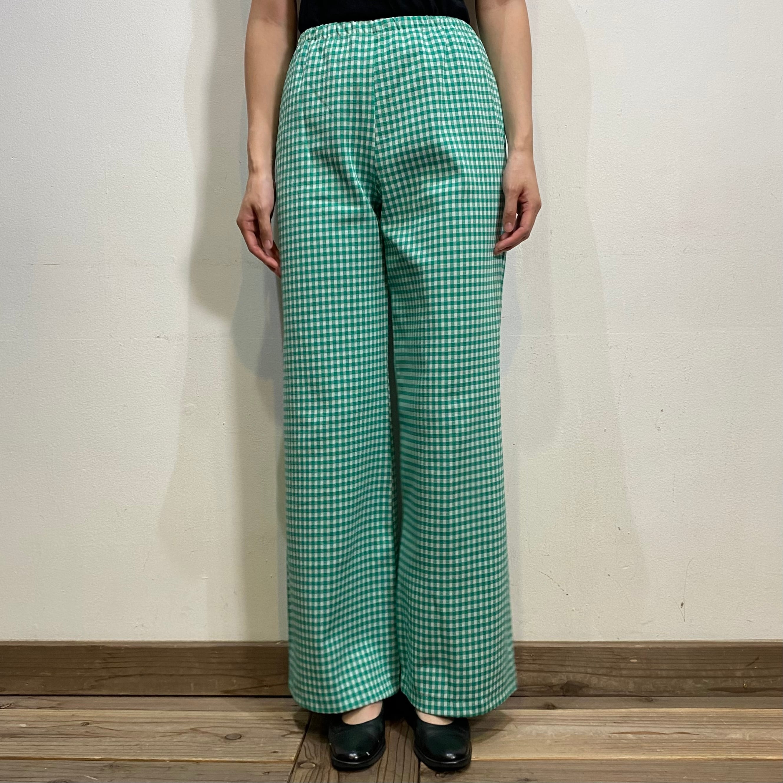 グリーン×ホワイトのギンガムチェック柄が可愛い、70年代のフレアパンツです。