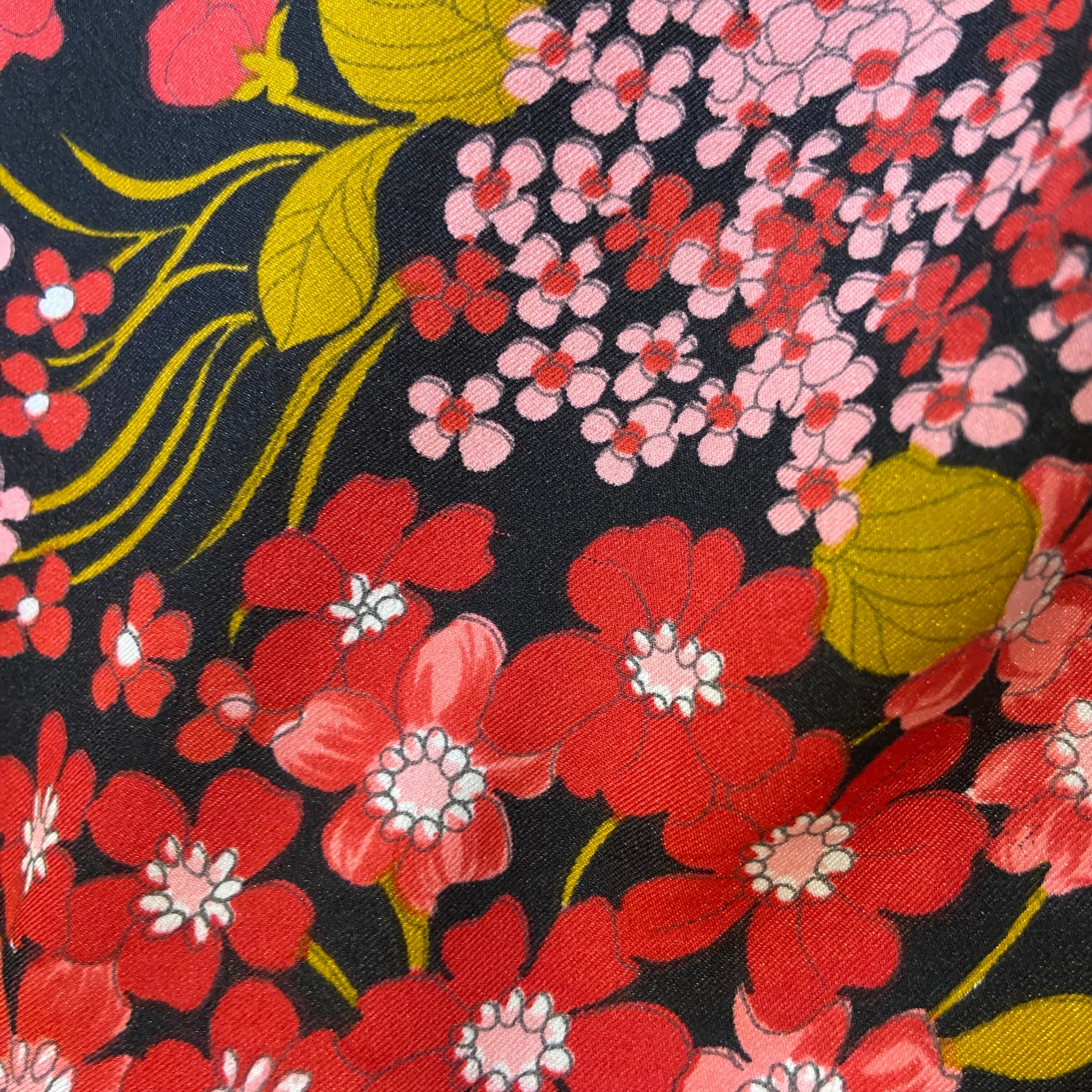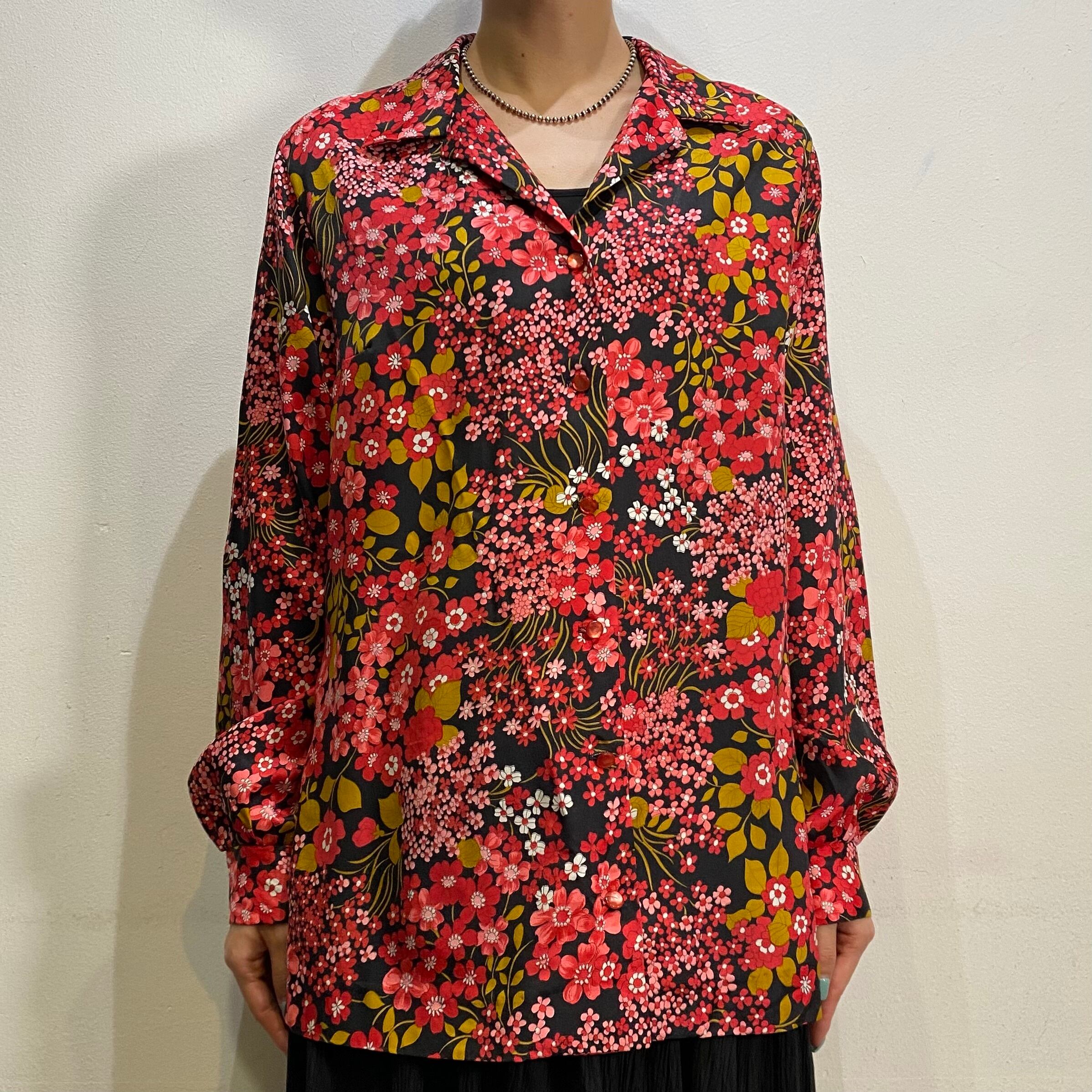 赤やピンクのお花がびっしりとプリントされた、70年代の長袖シャツです。