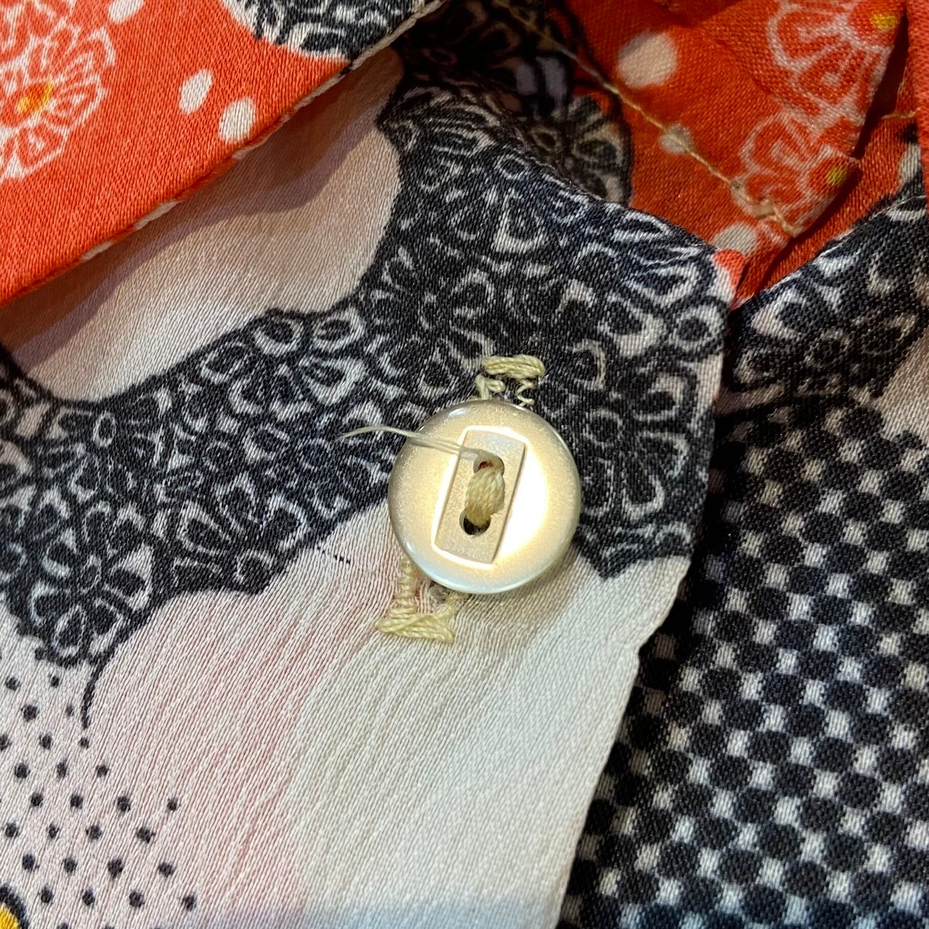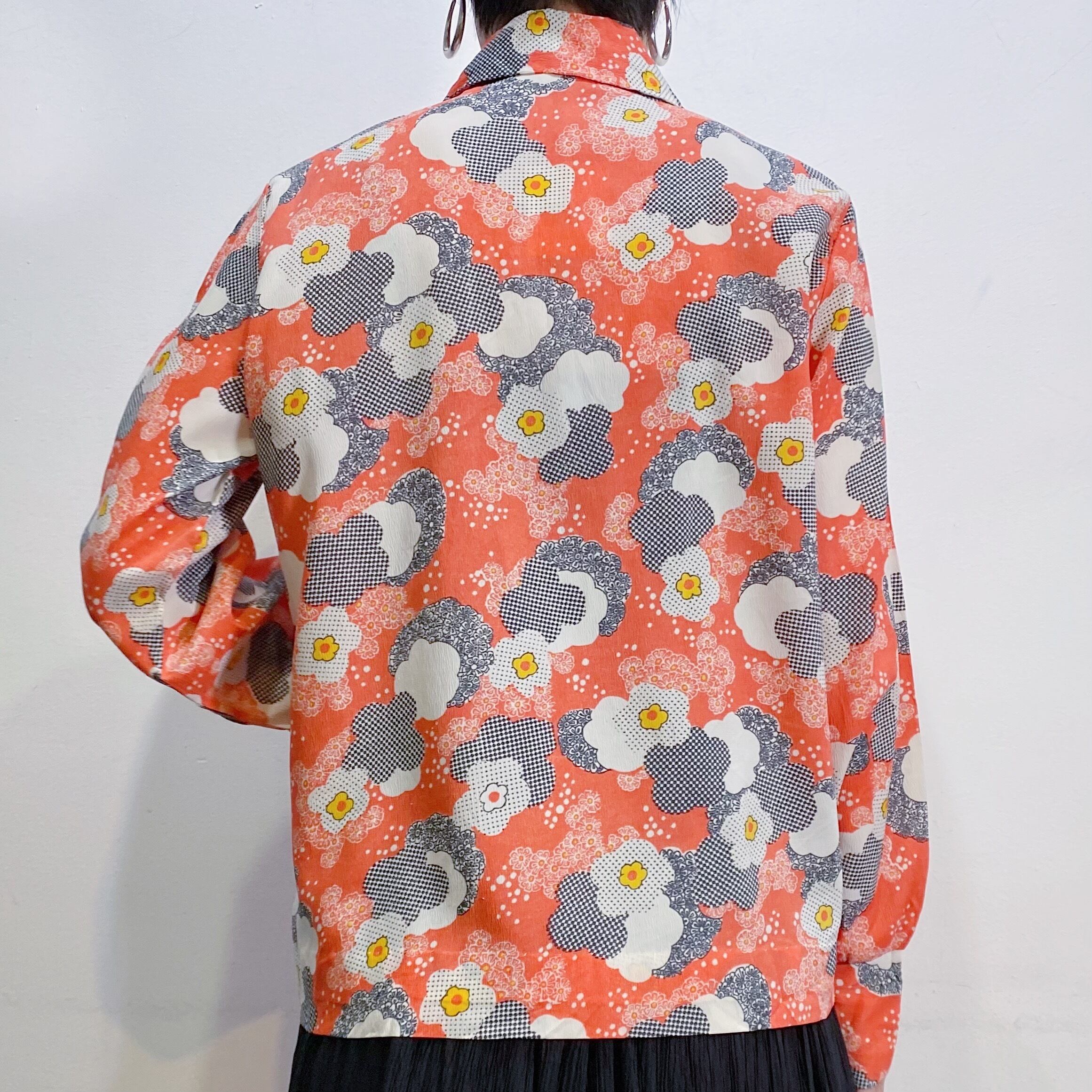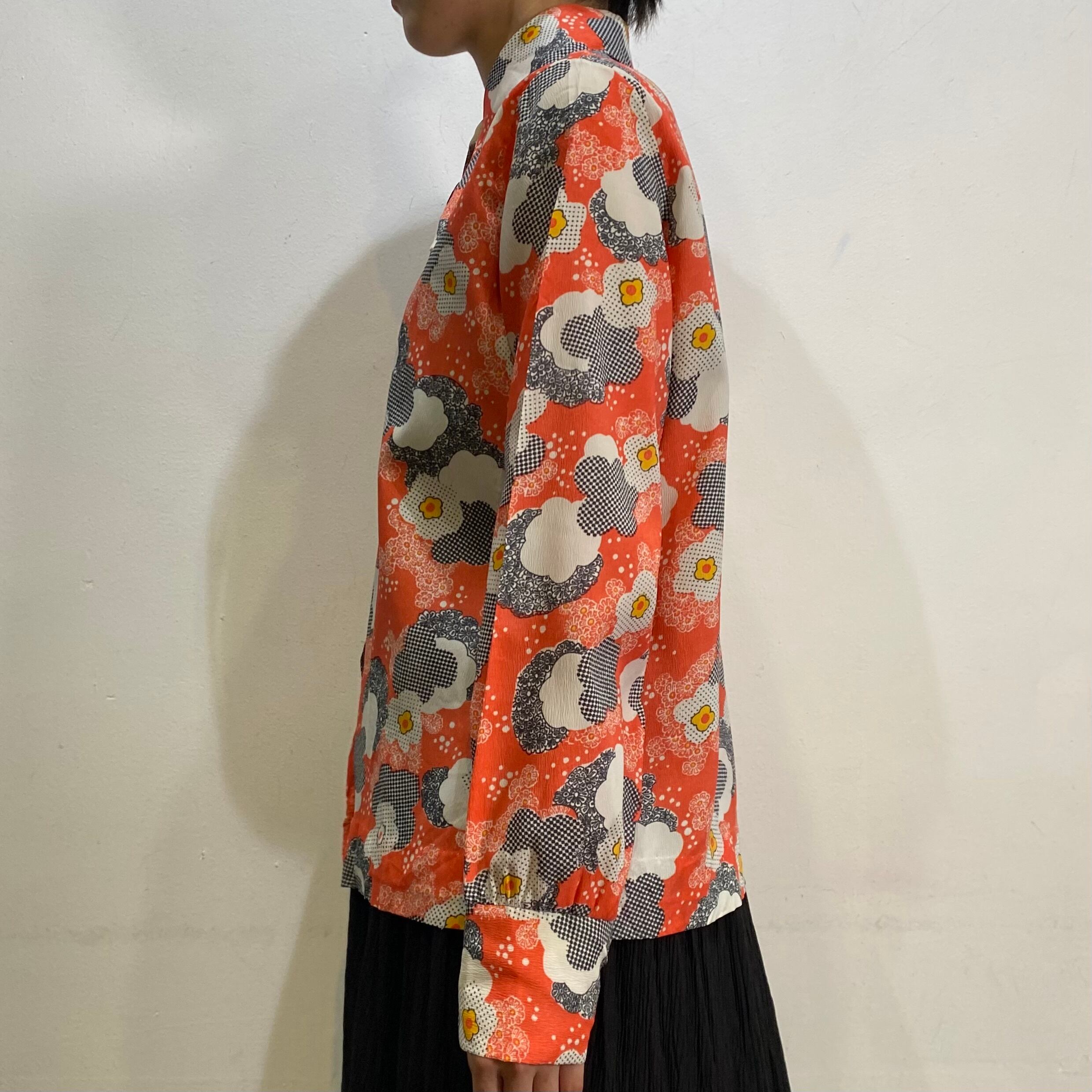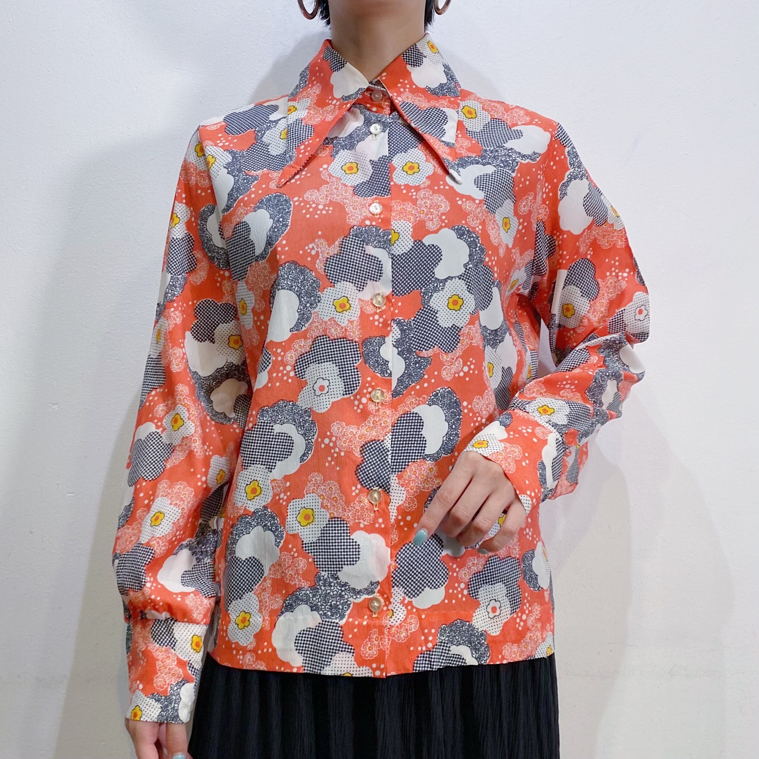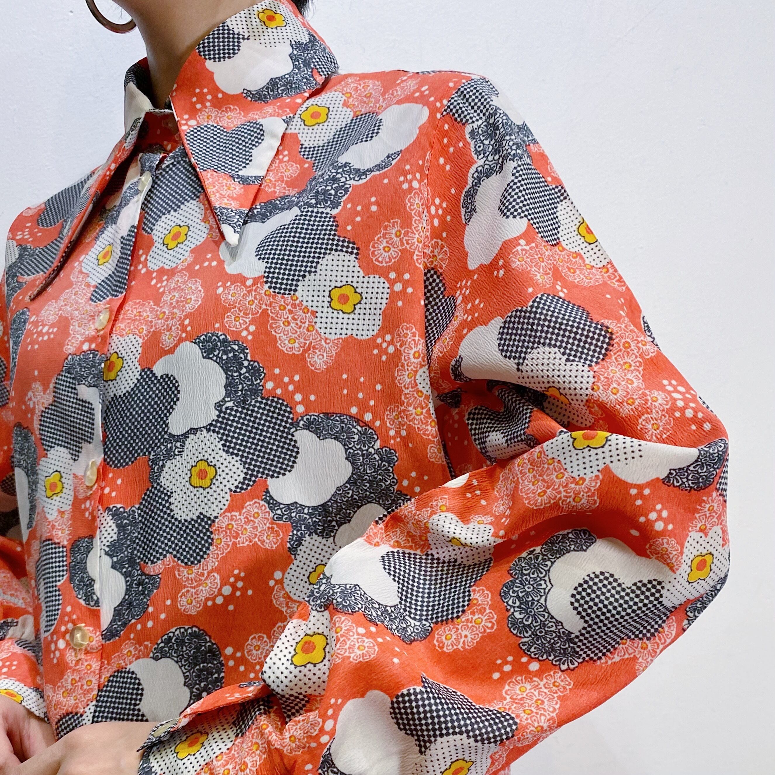 赤ベースにモノトーンカラーの花柄が可愛い、70年代の長袖シャツです。