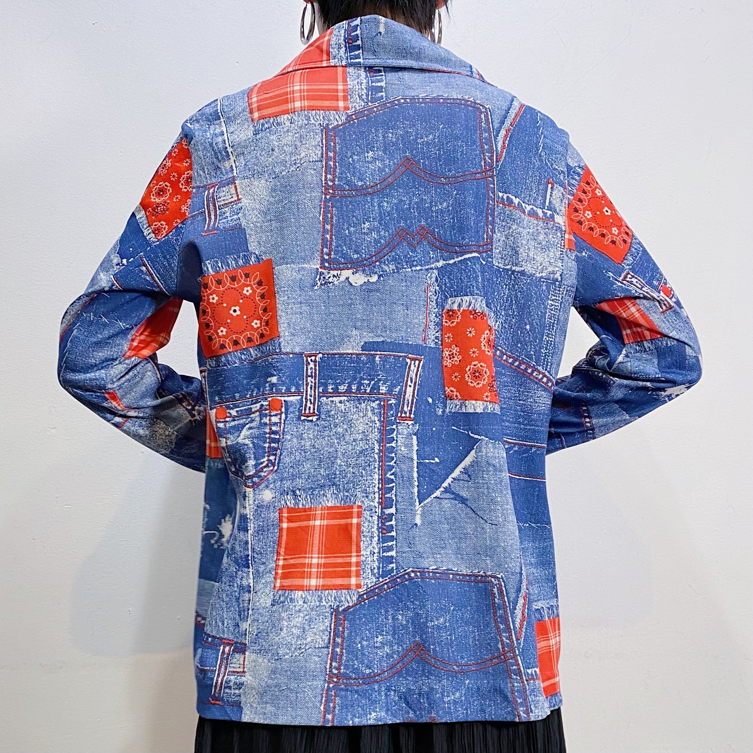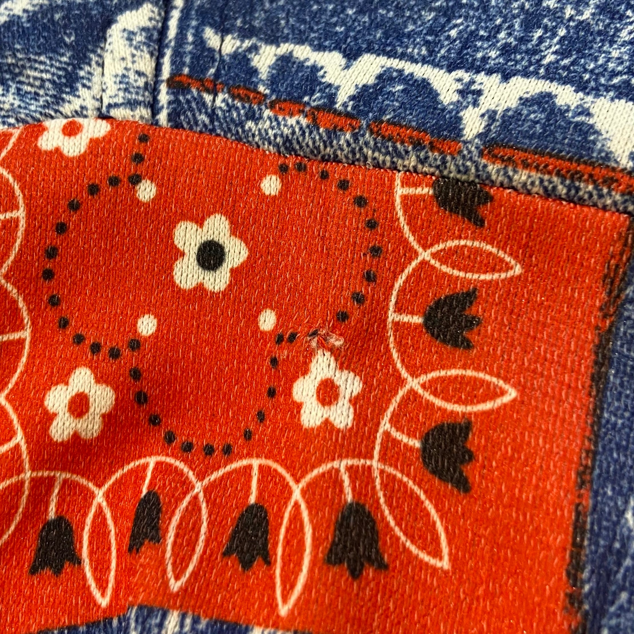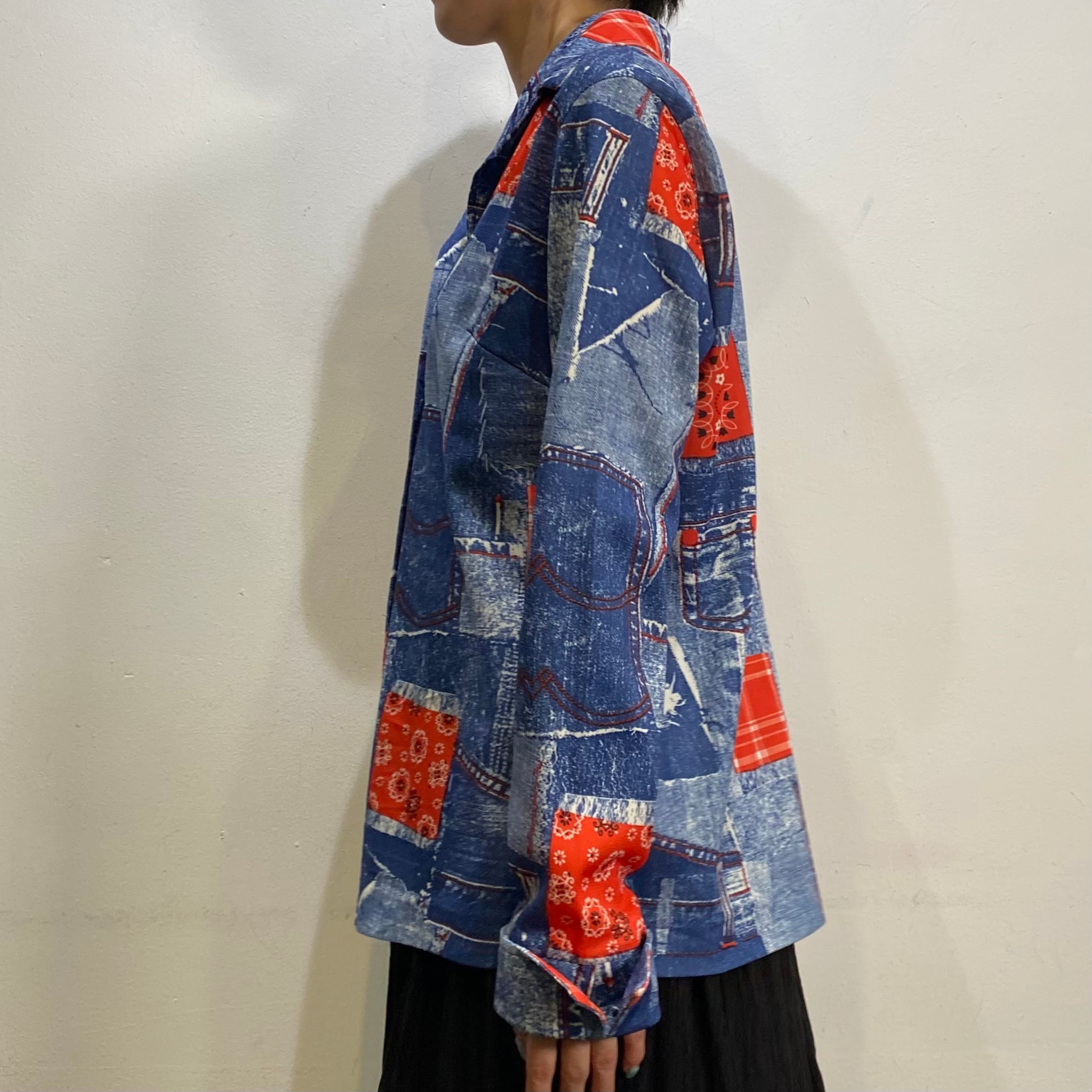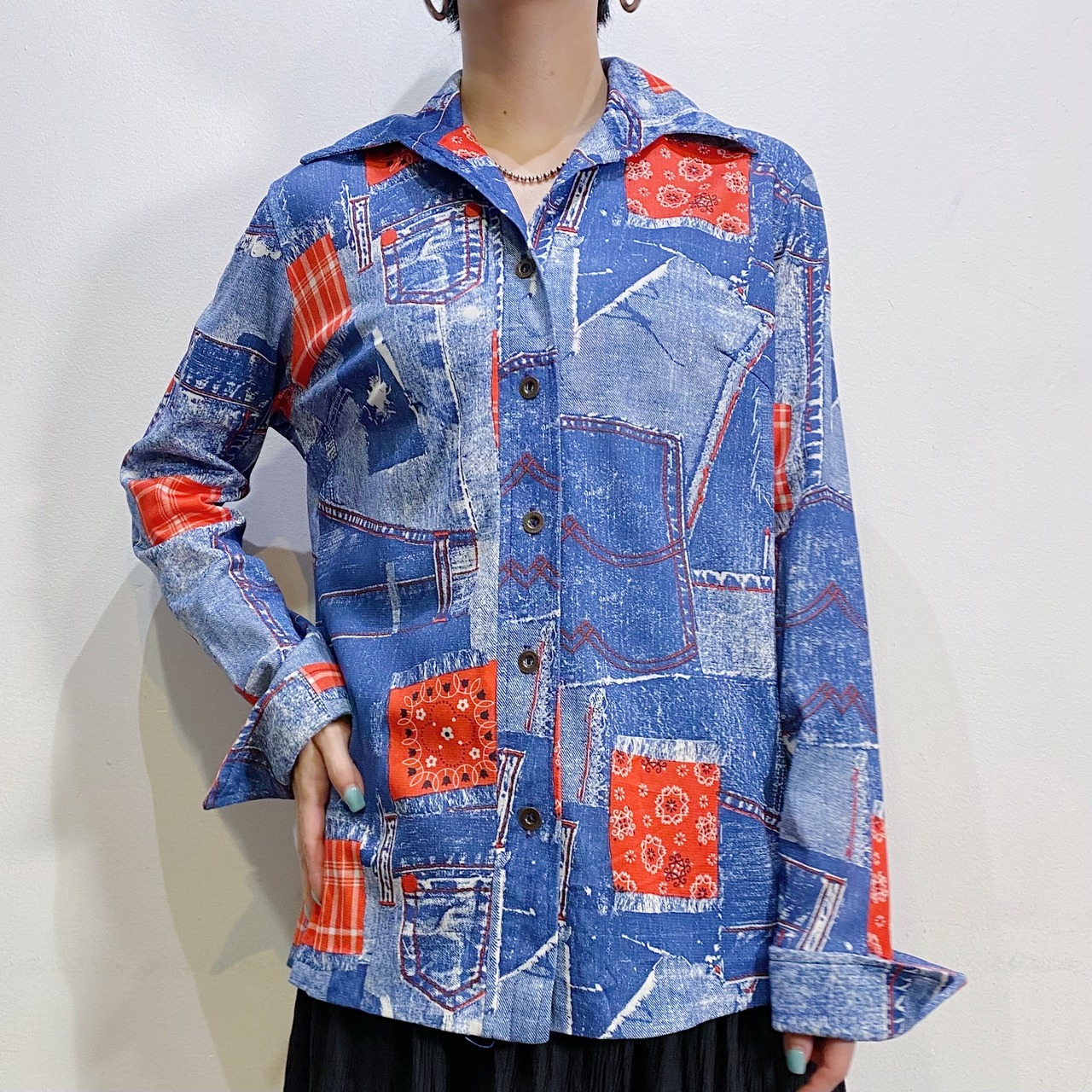 デニムとバンダナのパッチワークプリントが可愛い、70年代の長袖シャツです。