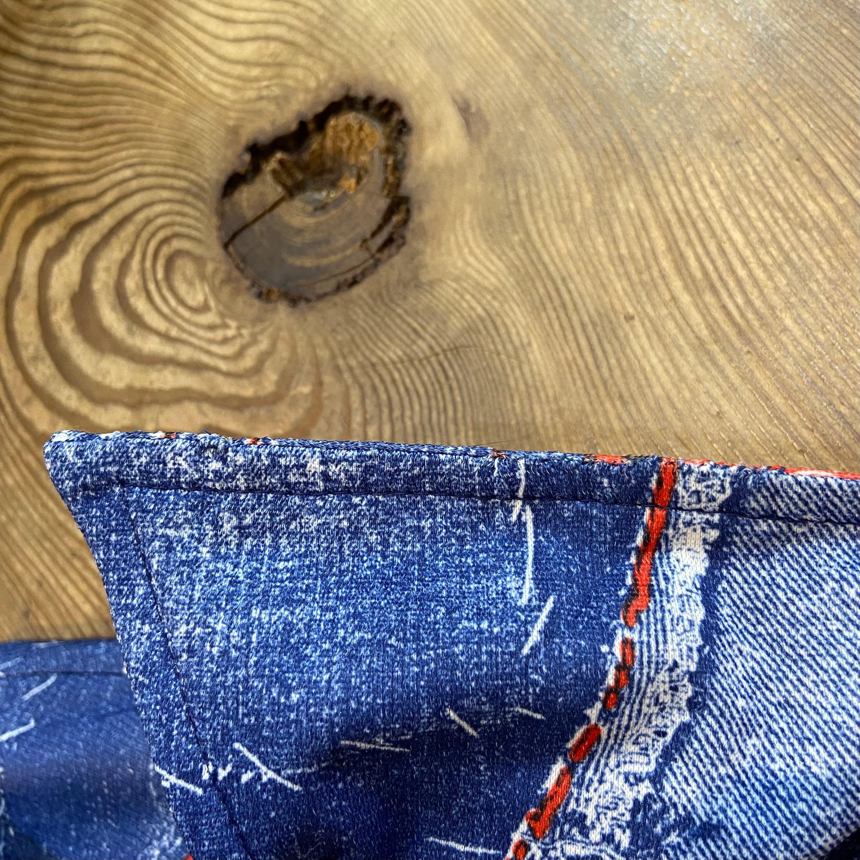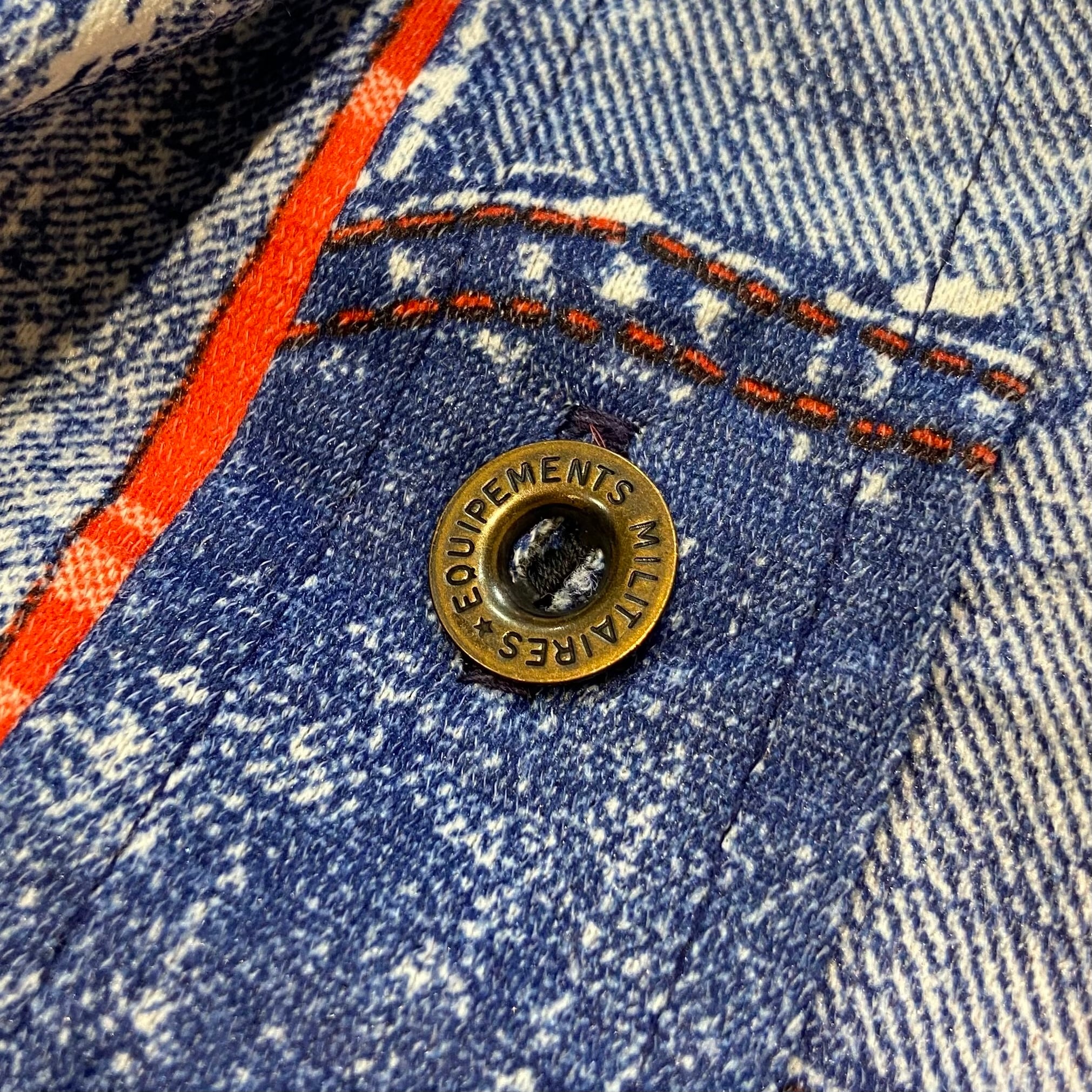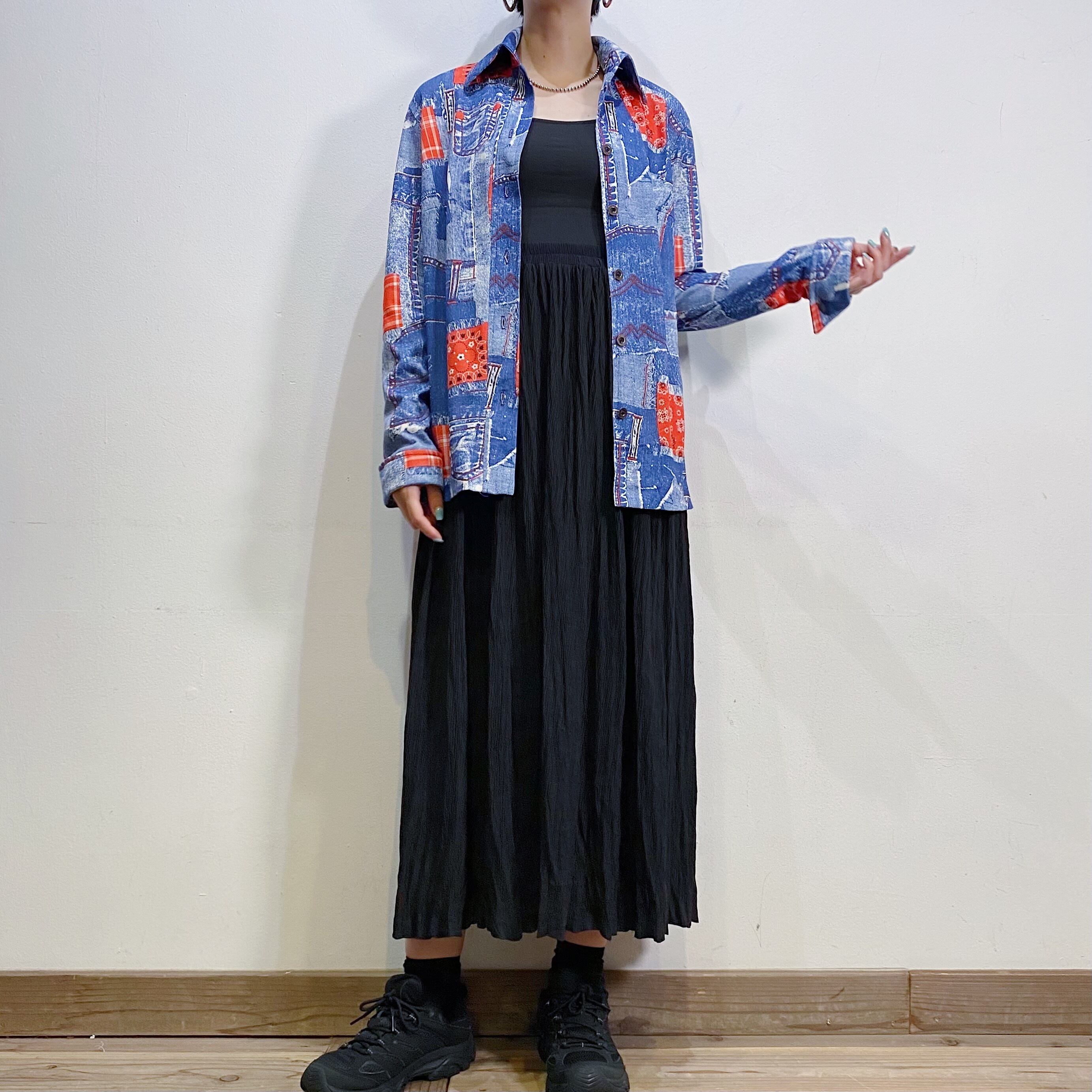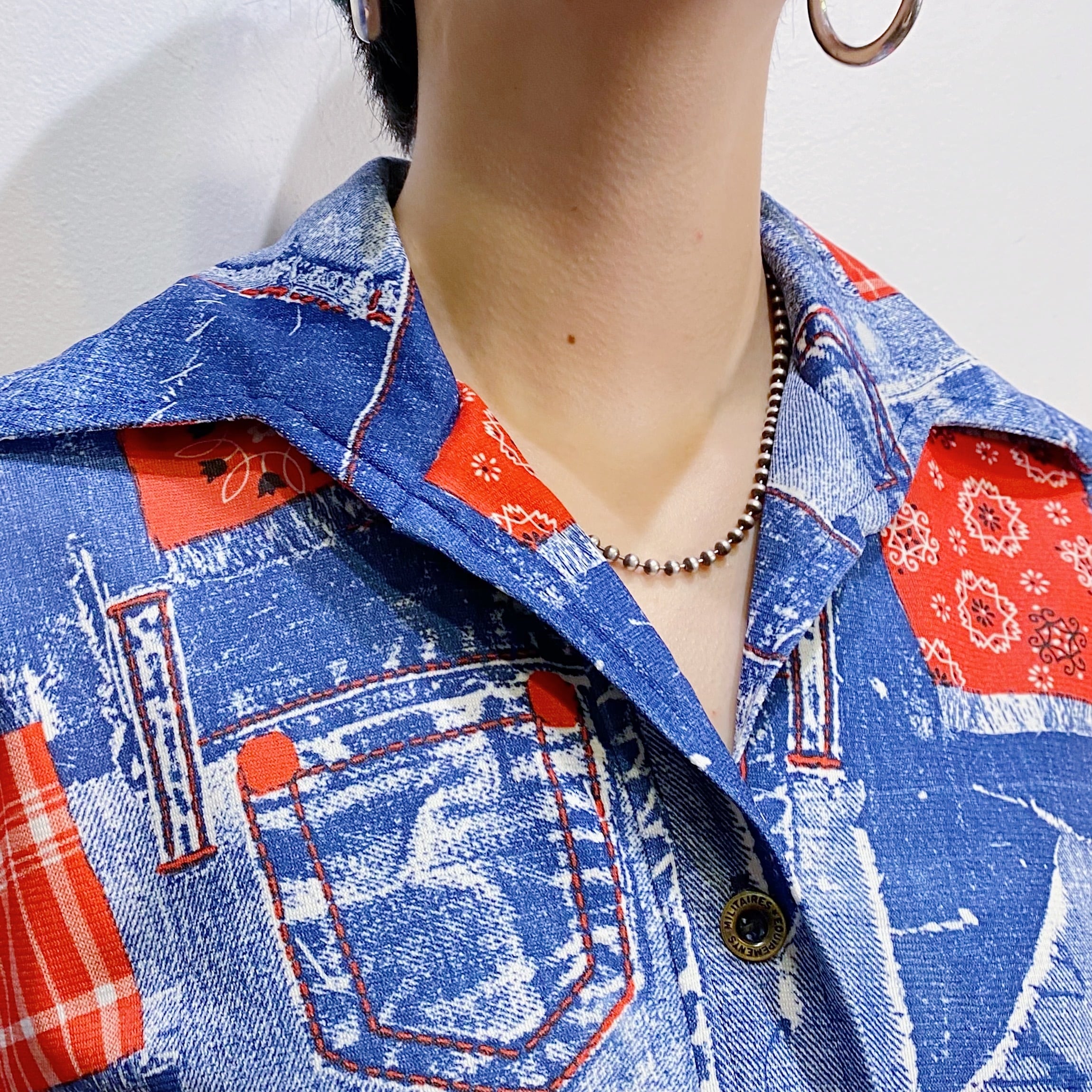 デニムとバンダナのパッチワークプリントが可愛い、70年代の長袖シャツです。