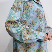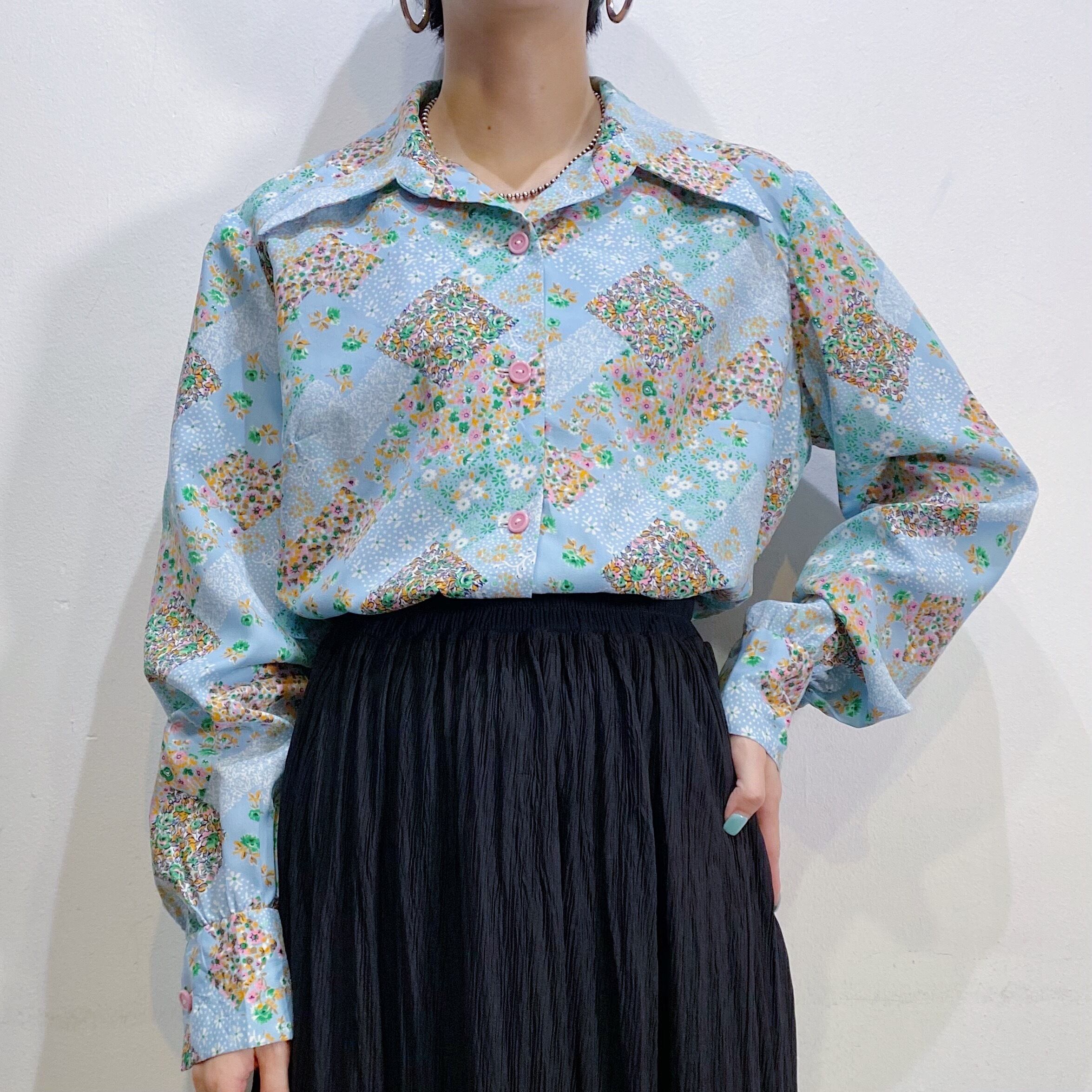 サックスブルーベースにパッチワークプリントのような花柄が可愛い、70年代の長袖シャツです。