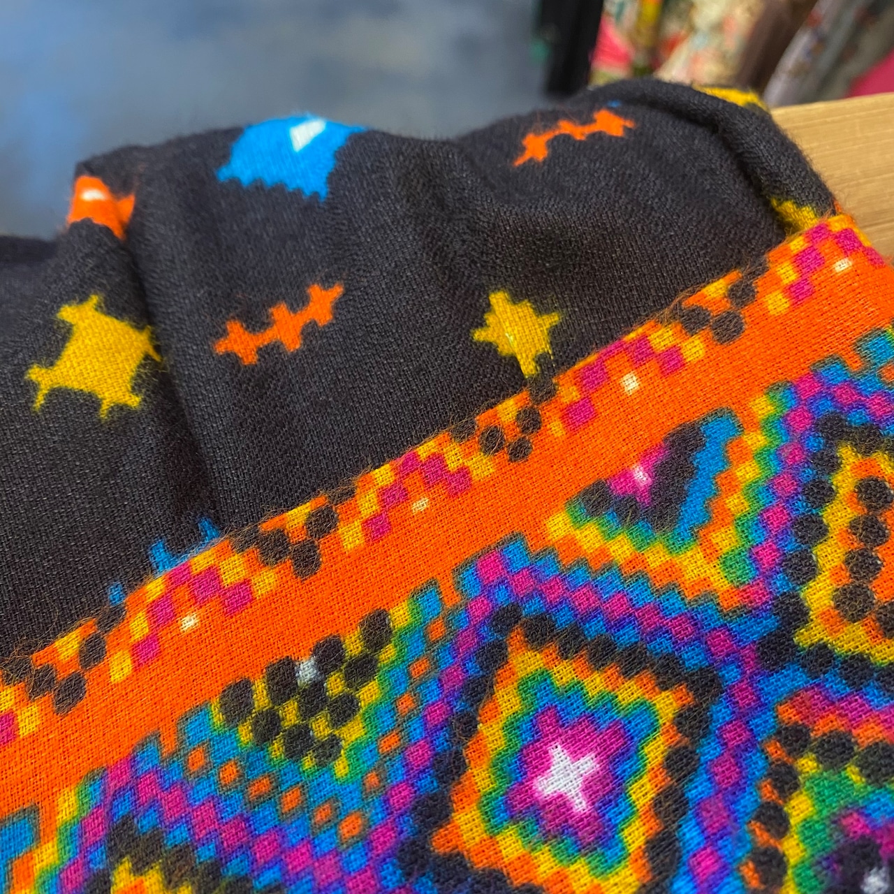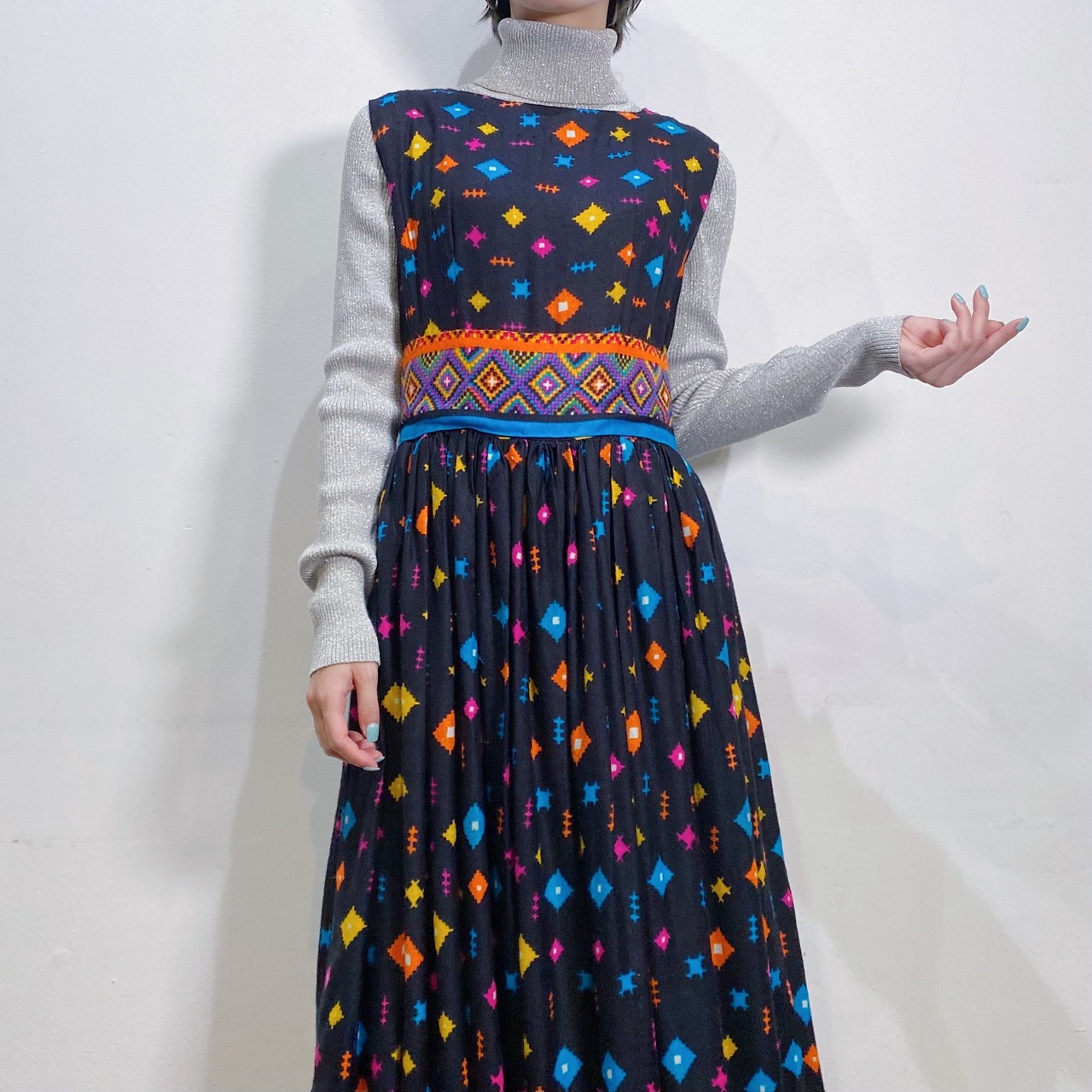 ブラックベースにカラフルなプリントが映える、60年代のワンピースです。
