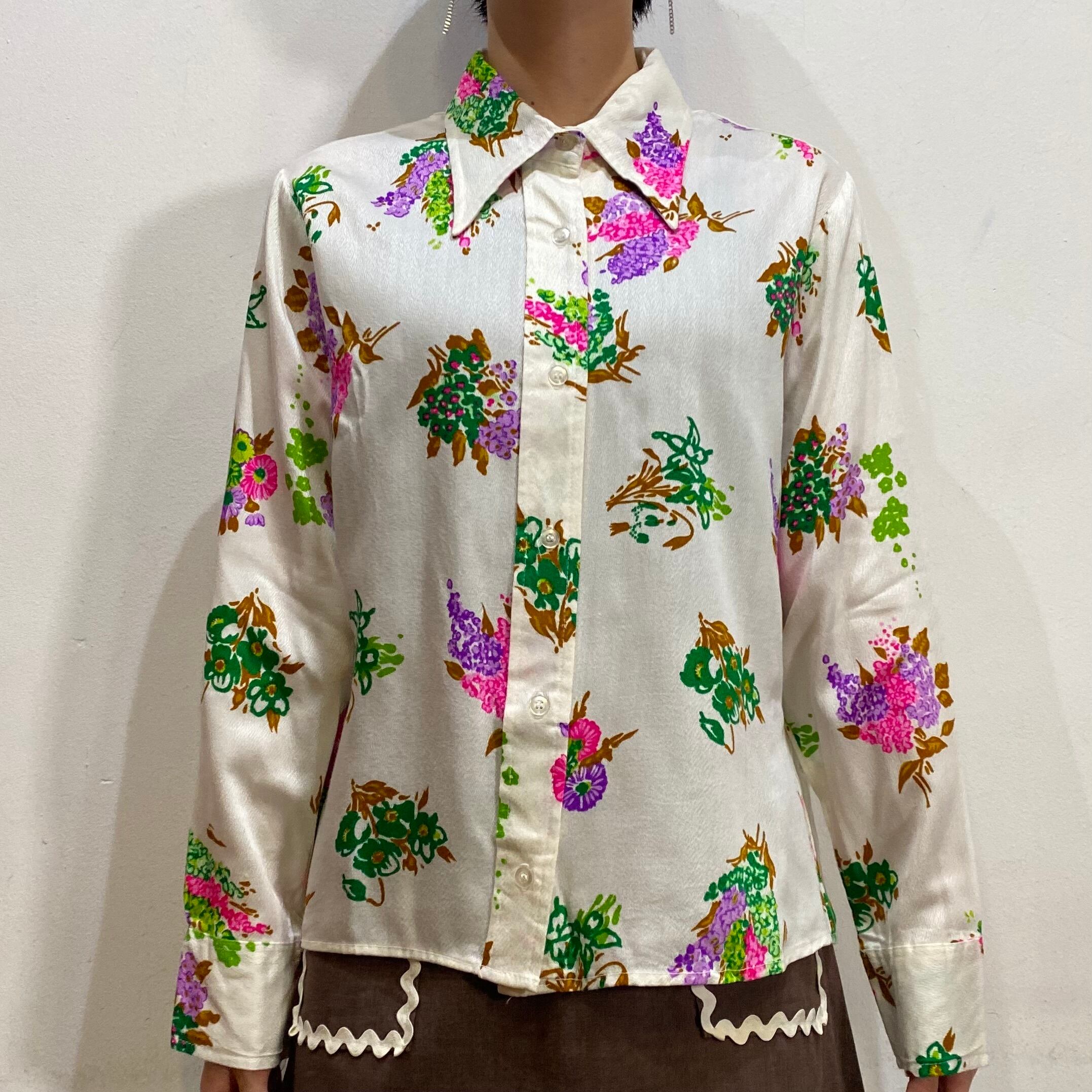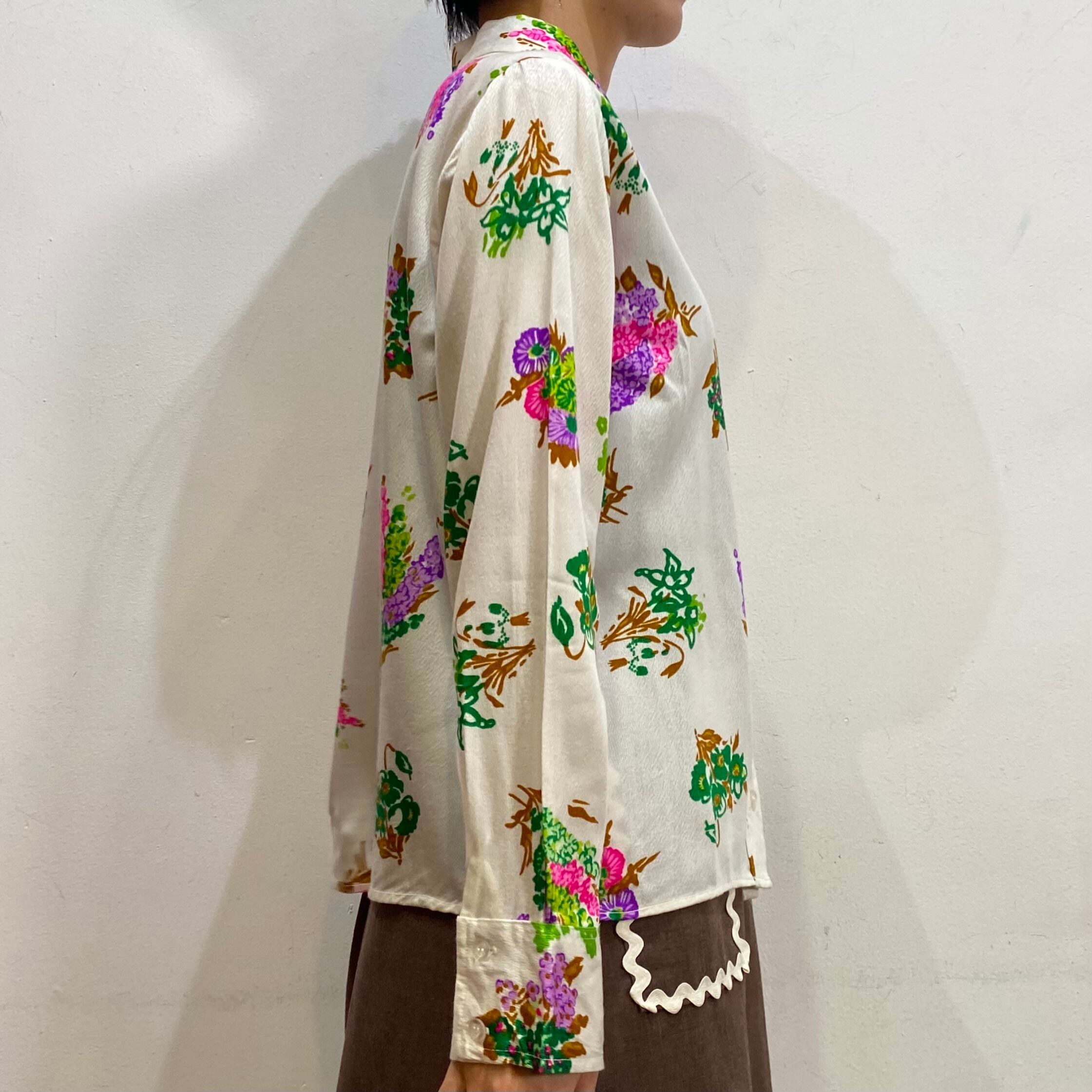 グリーンやピンクの花柄が可愛い、70年代の長袖シャツです。