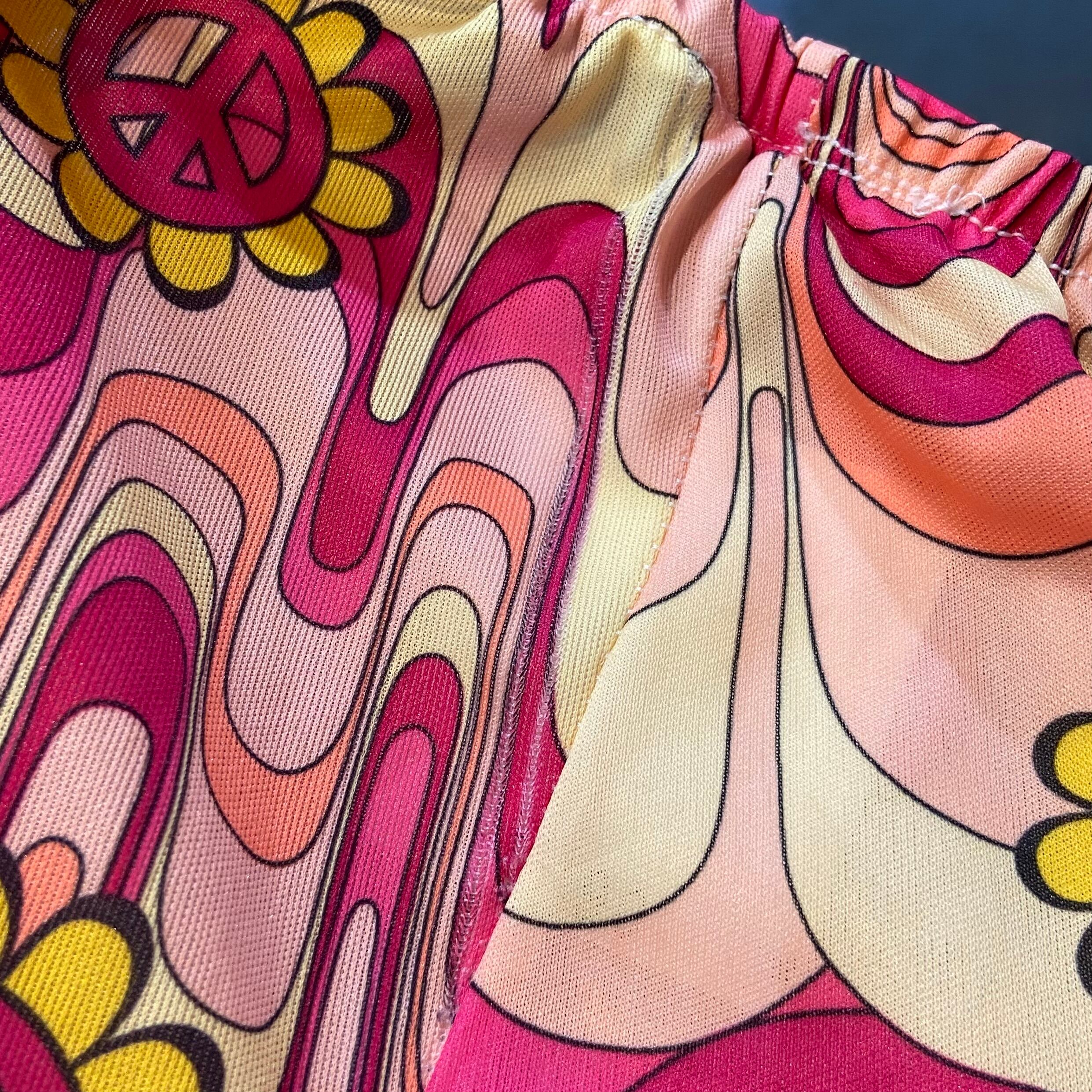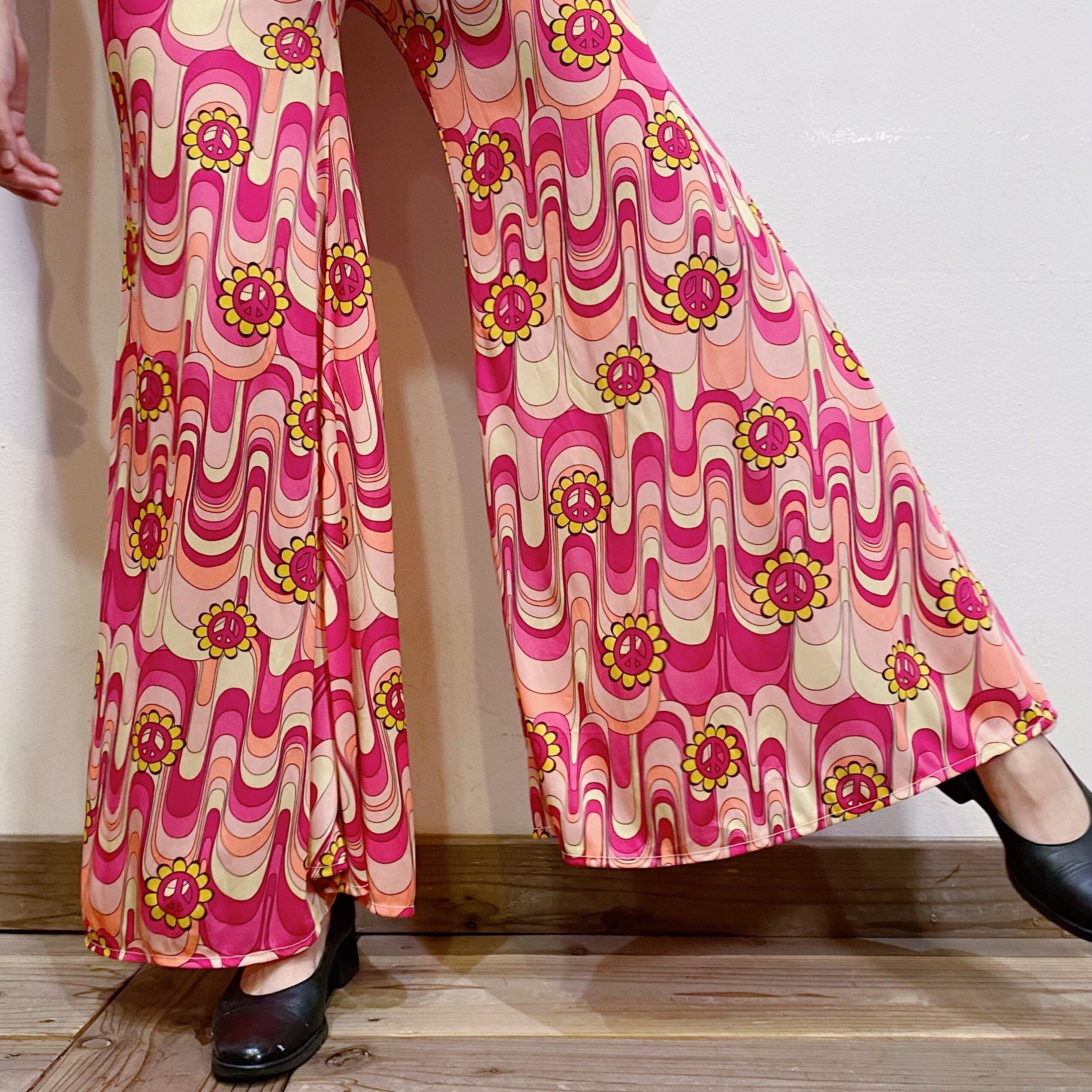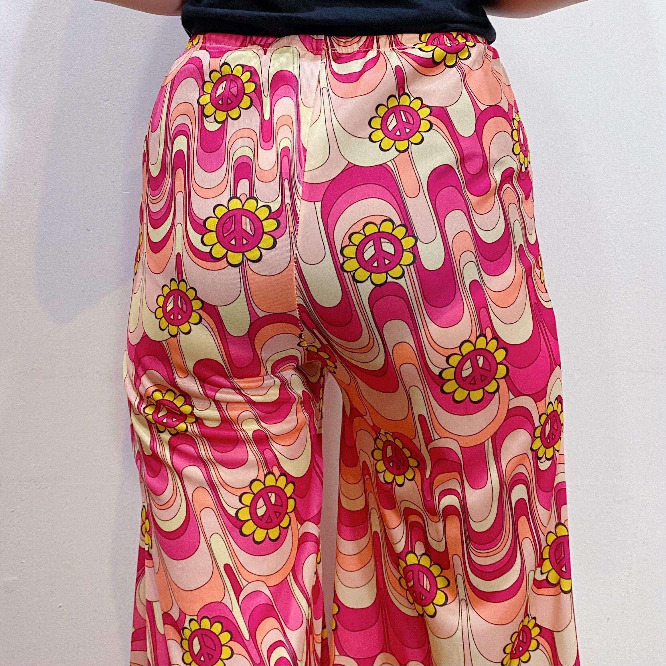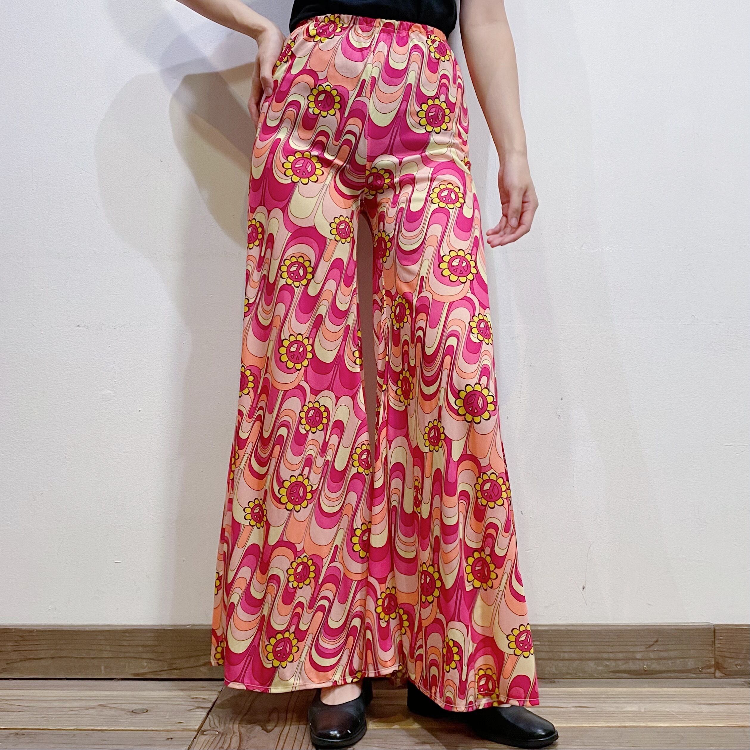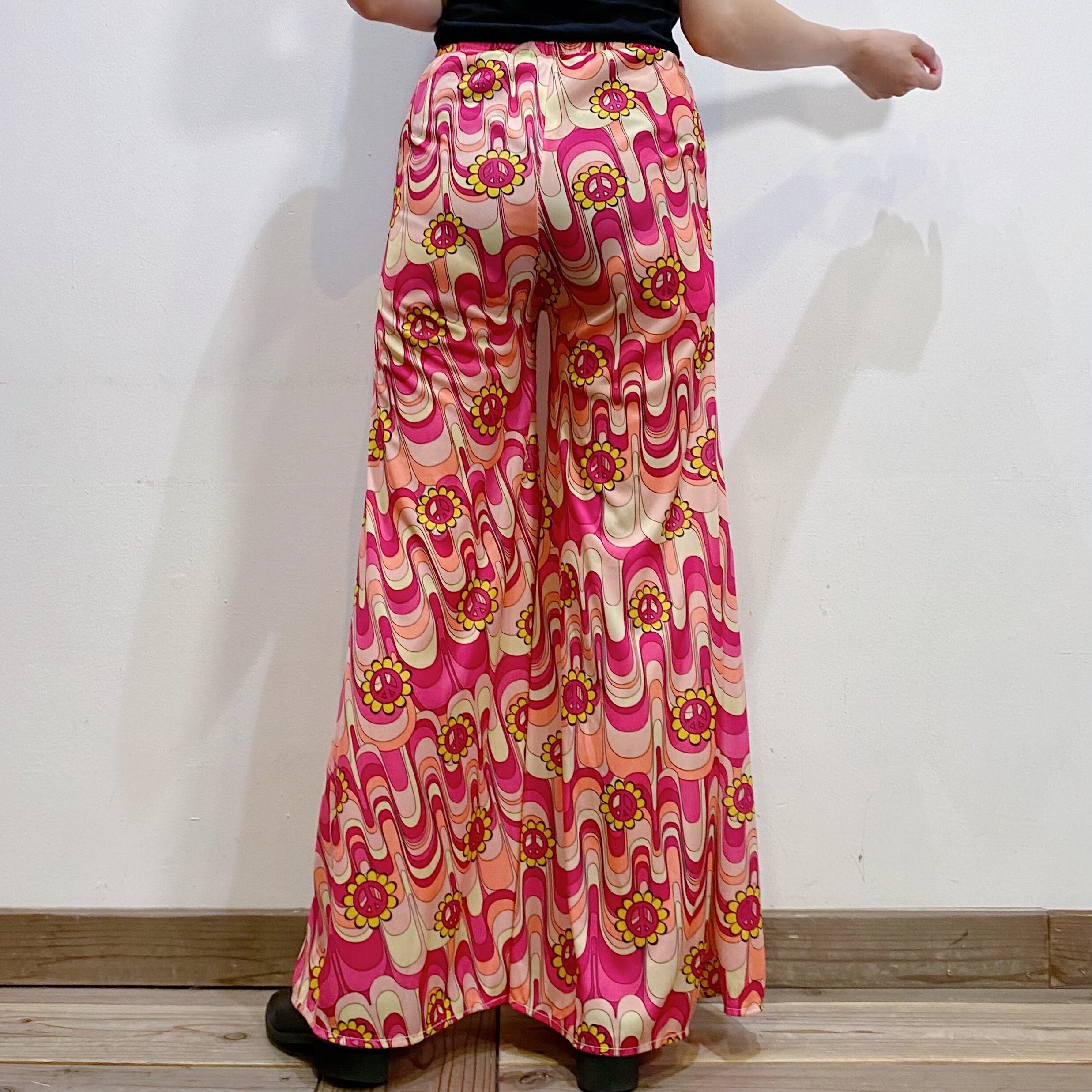ピースマークのお花にマーブル模様が最高にハッピーで可愛い、フレアパンツです。