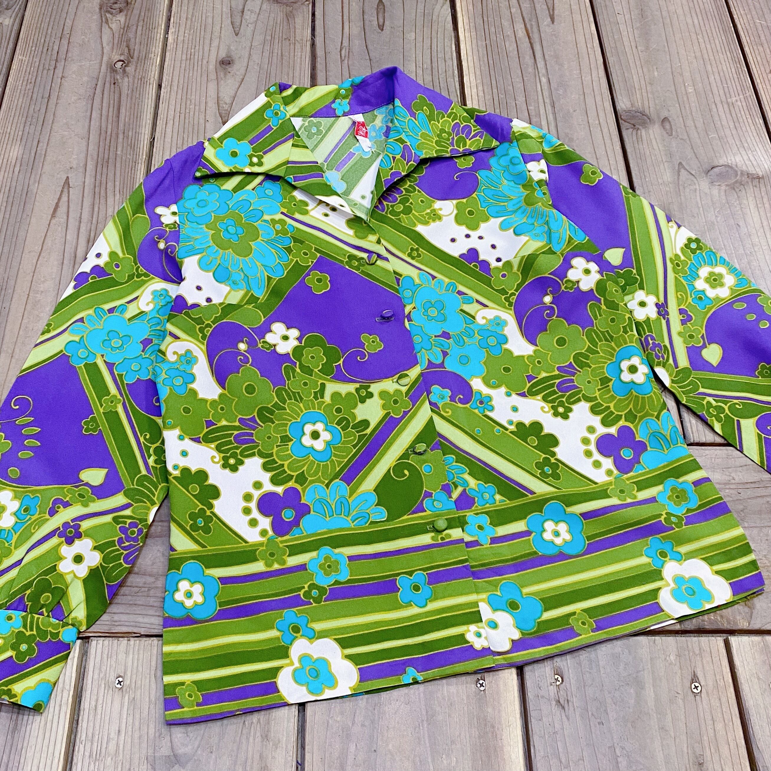 70s green and purple flower printed long sleeve shirt