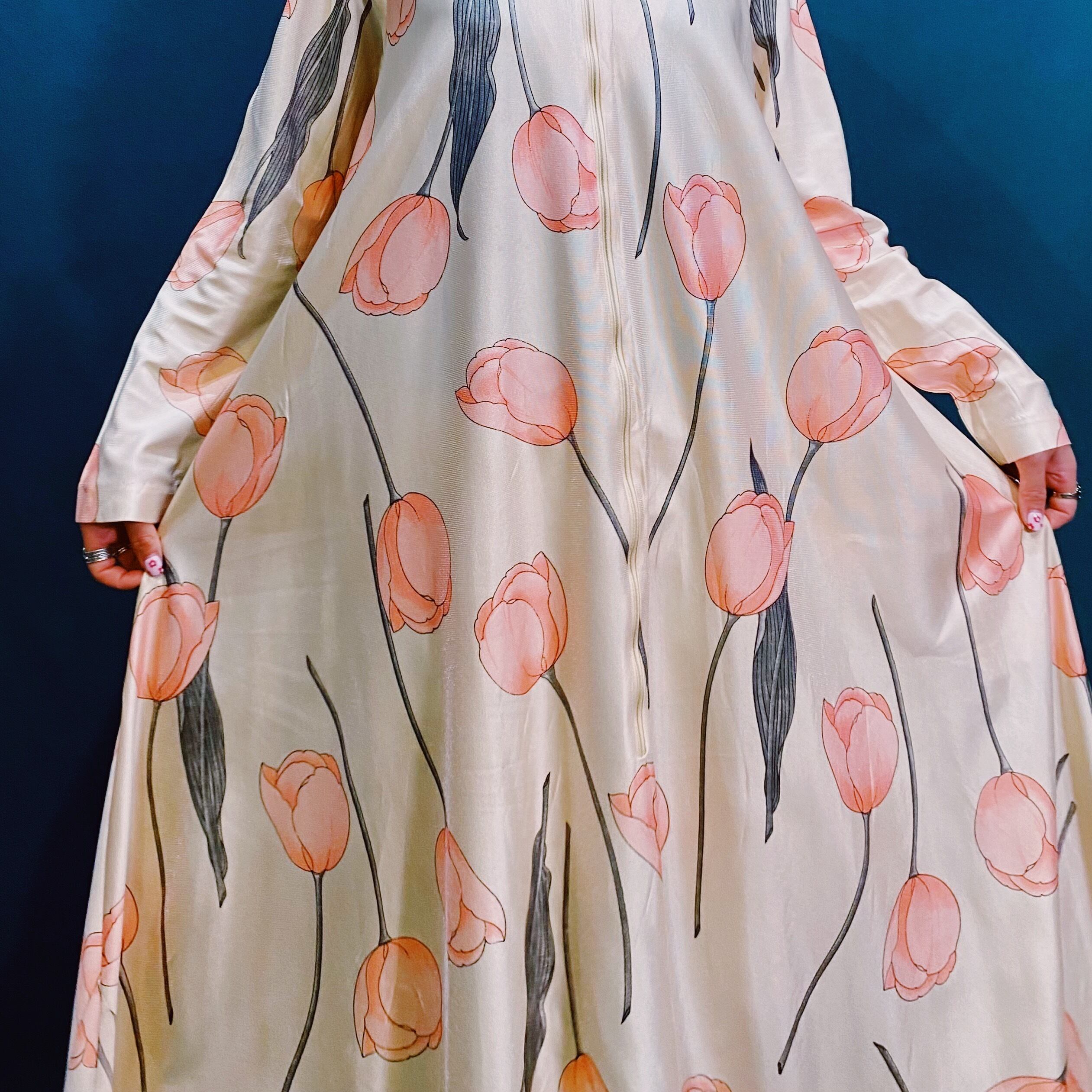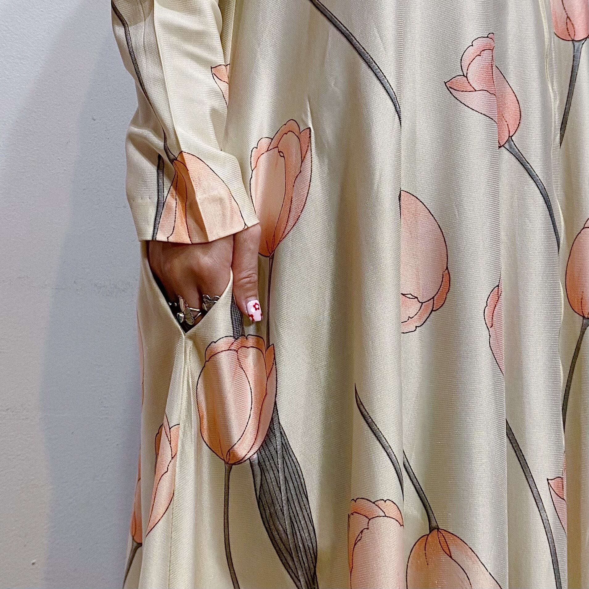 大きなチューリップ柄がとても可愛い、70年代のロングワンピースです。