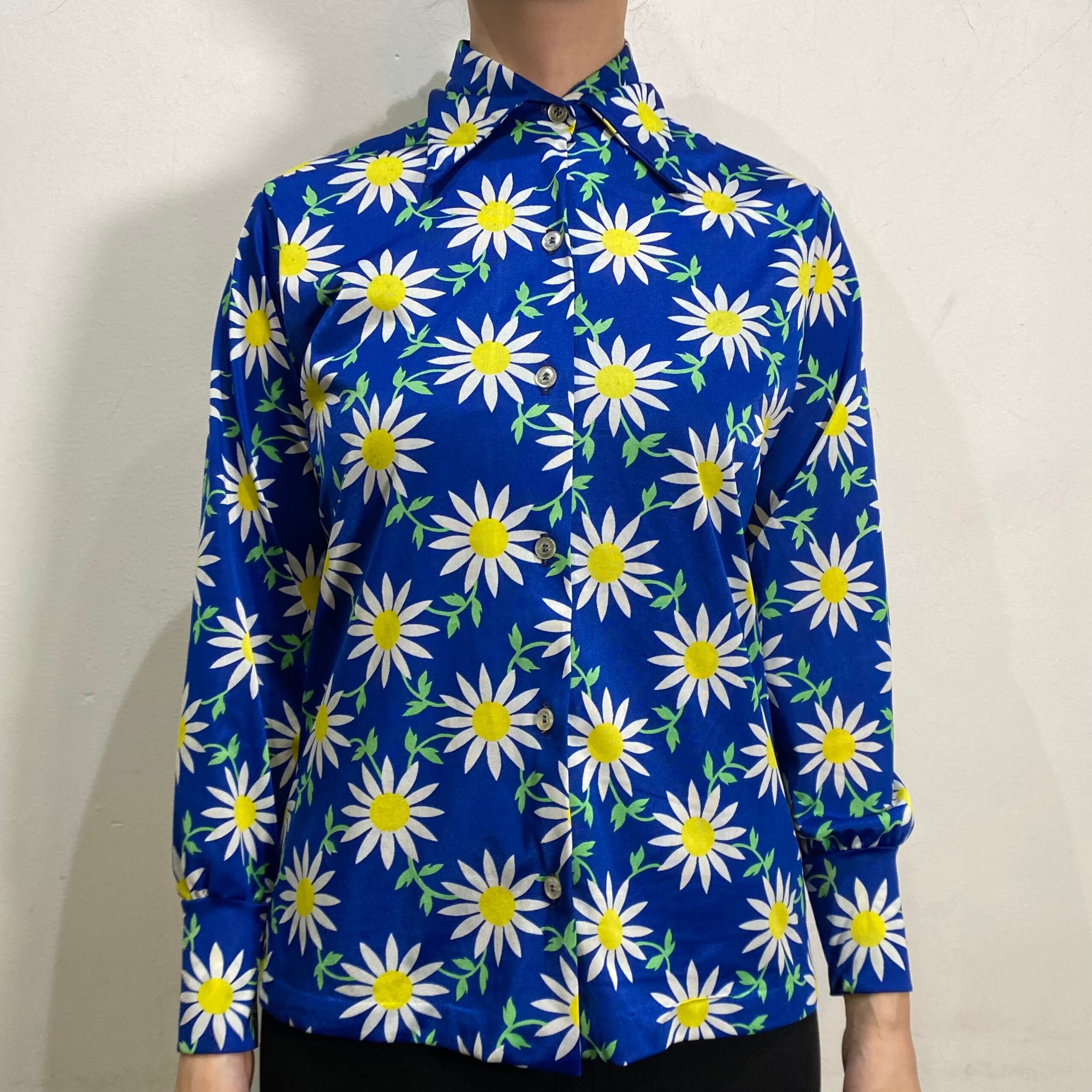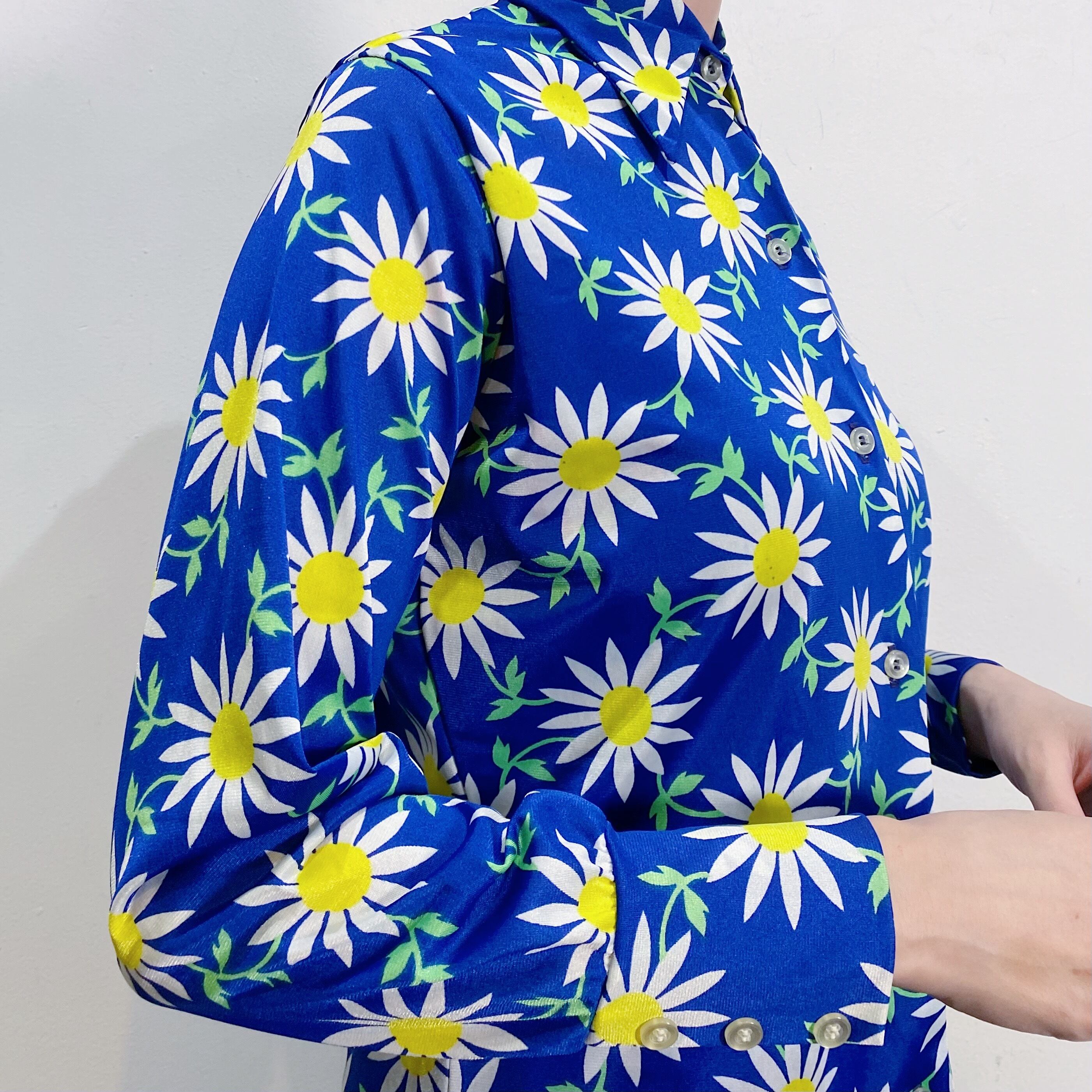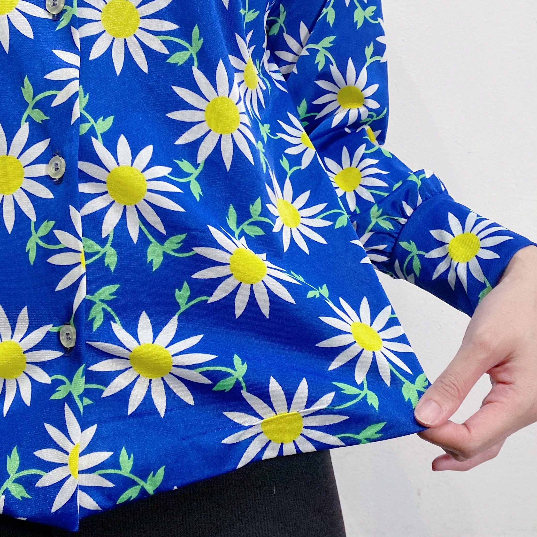 鮮やかなブルーベースにデイジーのプリントが可愛い、70年代の長袖シャツです。