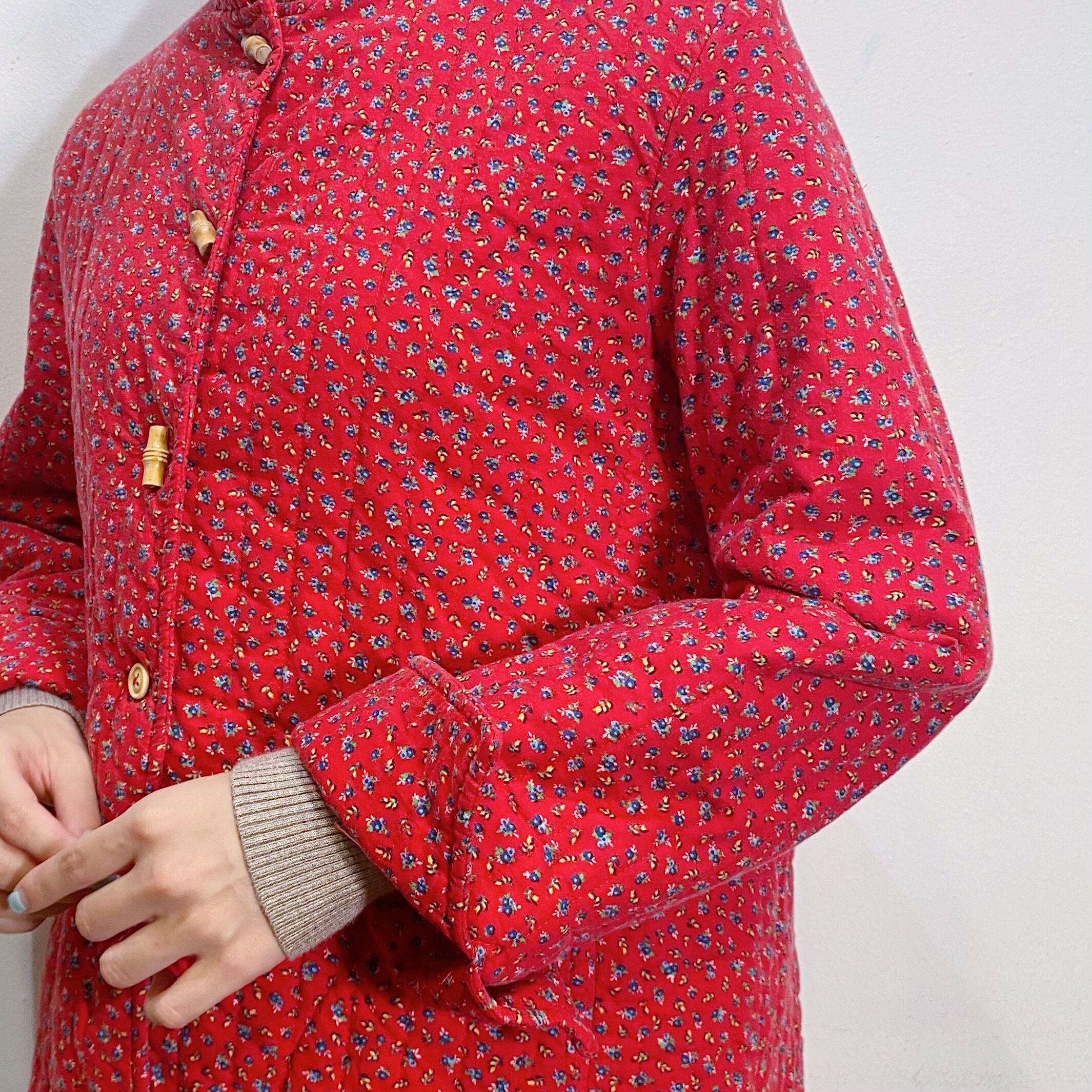 レッドベースにブルーの小花柄が可愛い、キルティングジャケットです。
