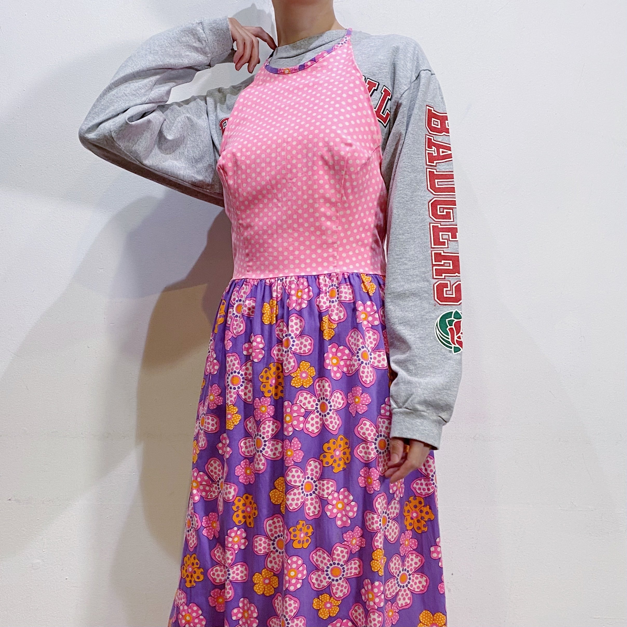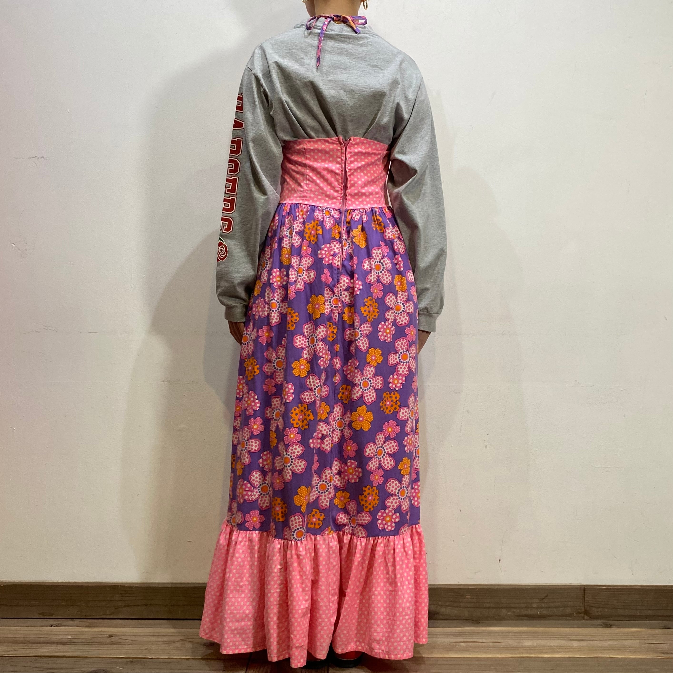 ピンクやパープル、オレンジの色合わせが可愛い、70年代のワンピースです。