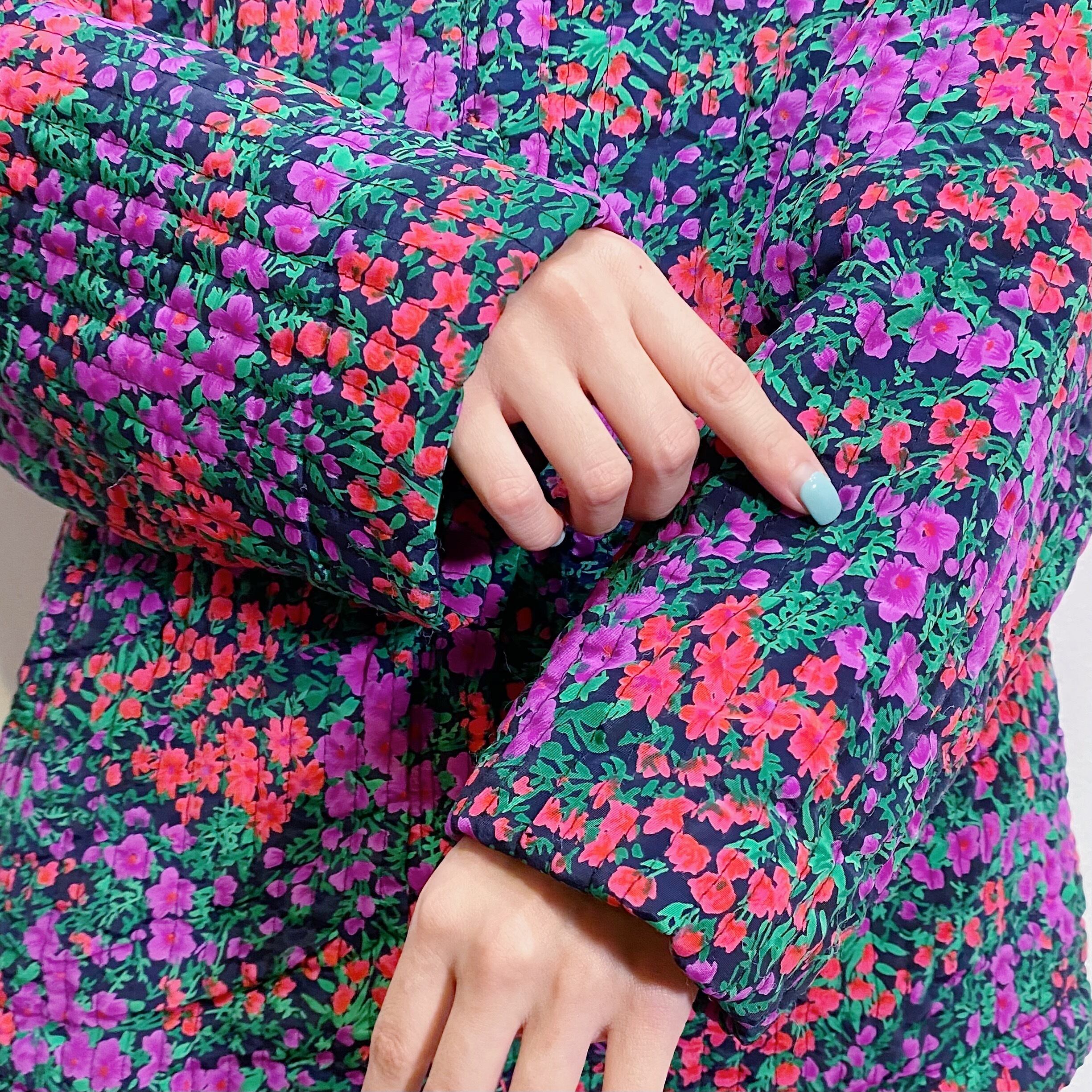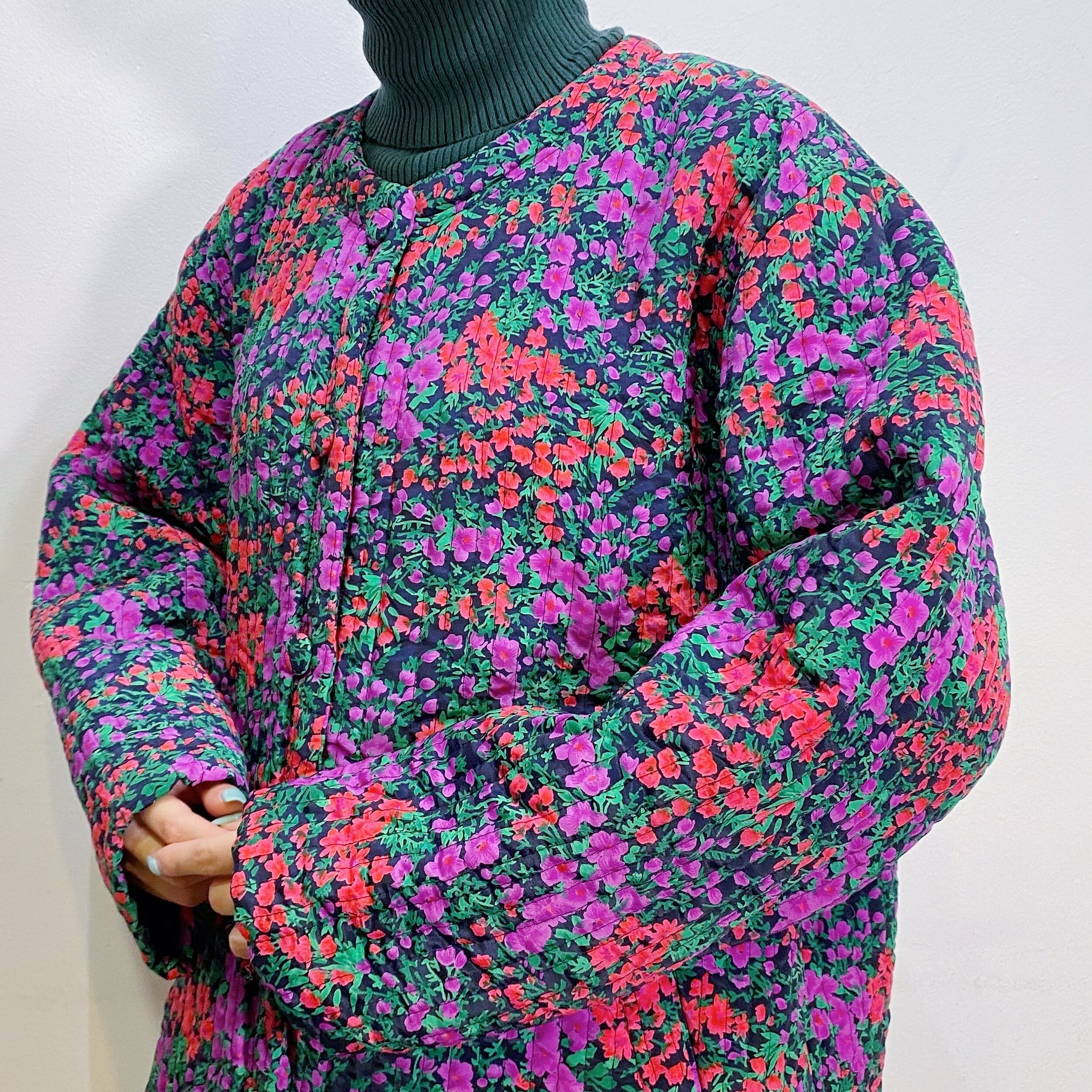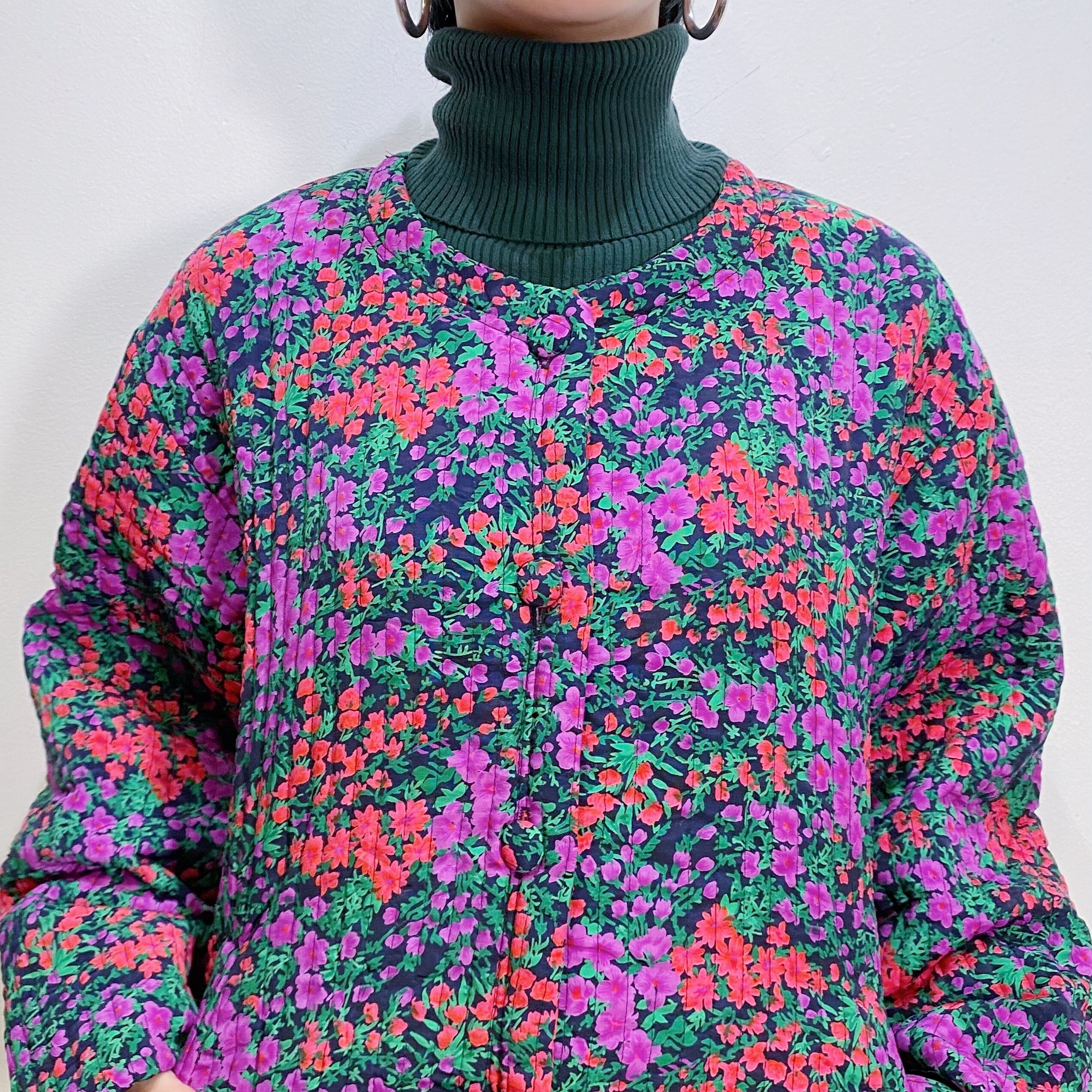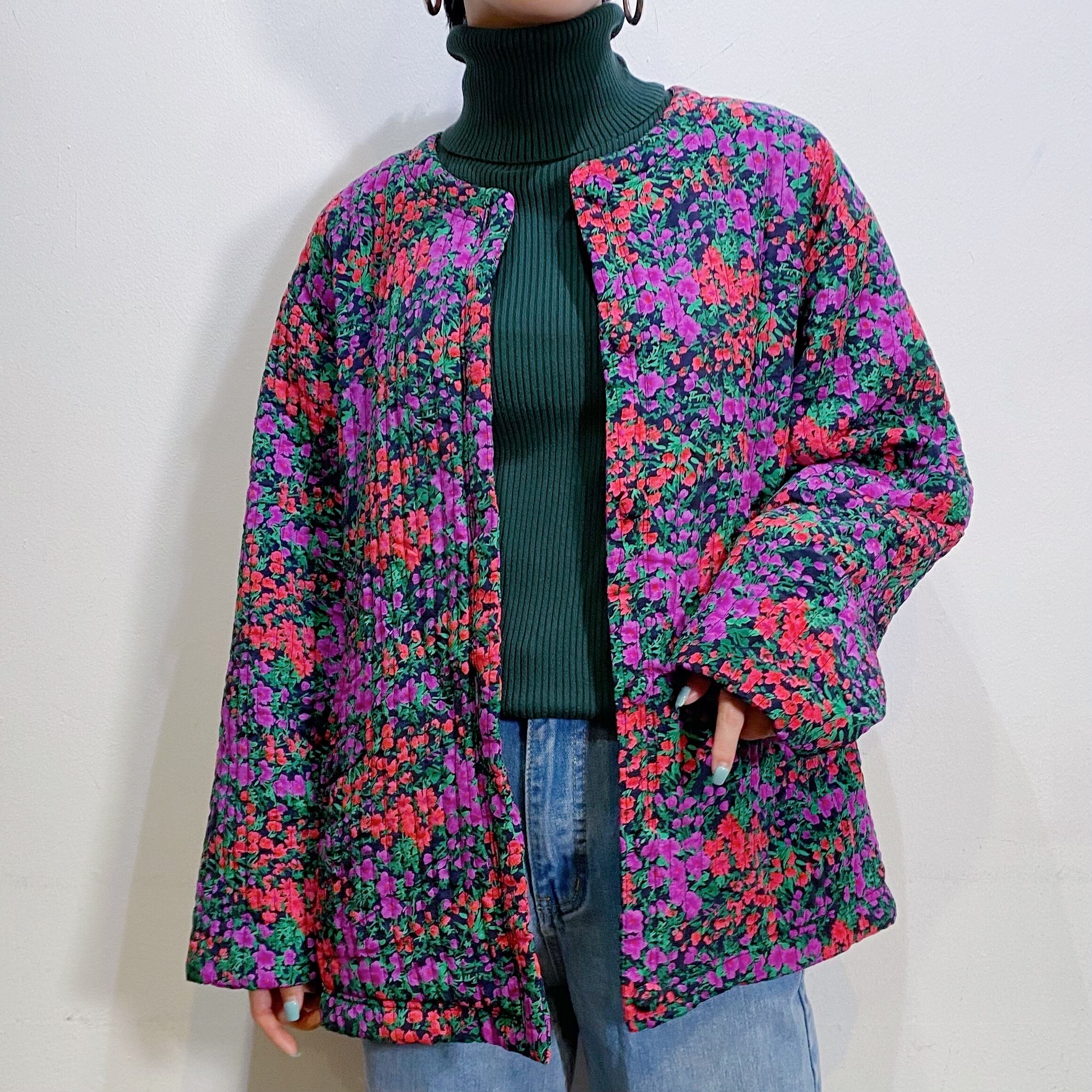 パープルやピンクのお花がびっしりとプリントされた、キルティングジャケットです。