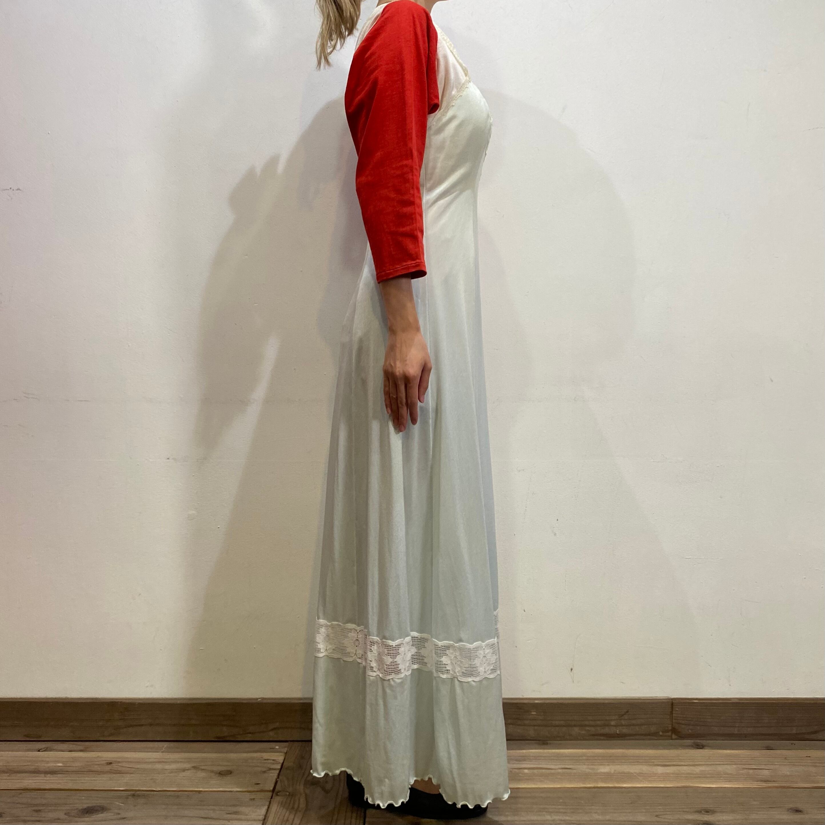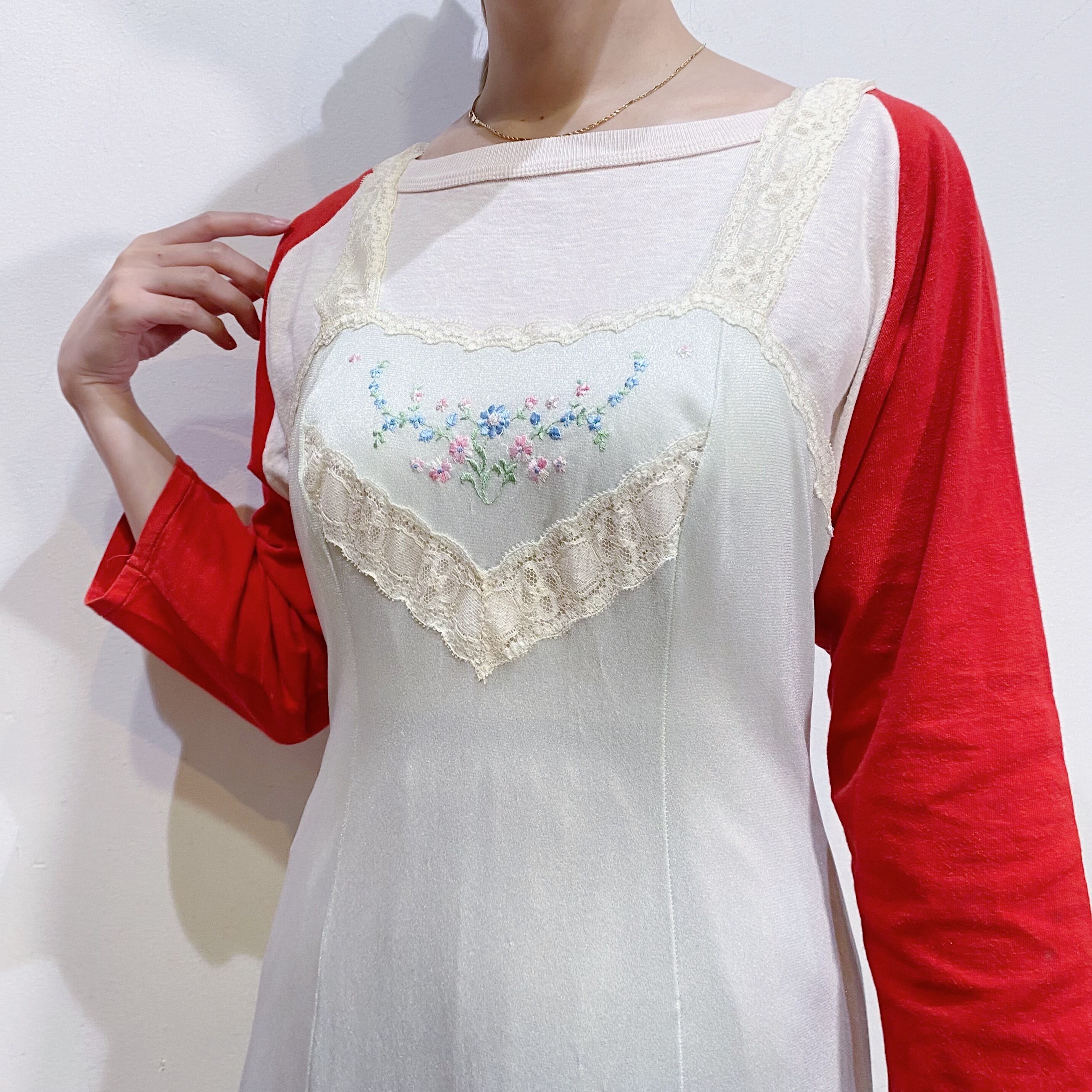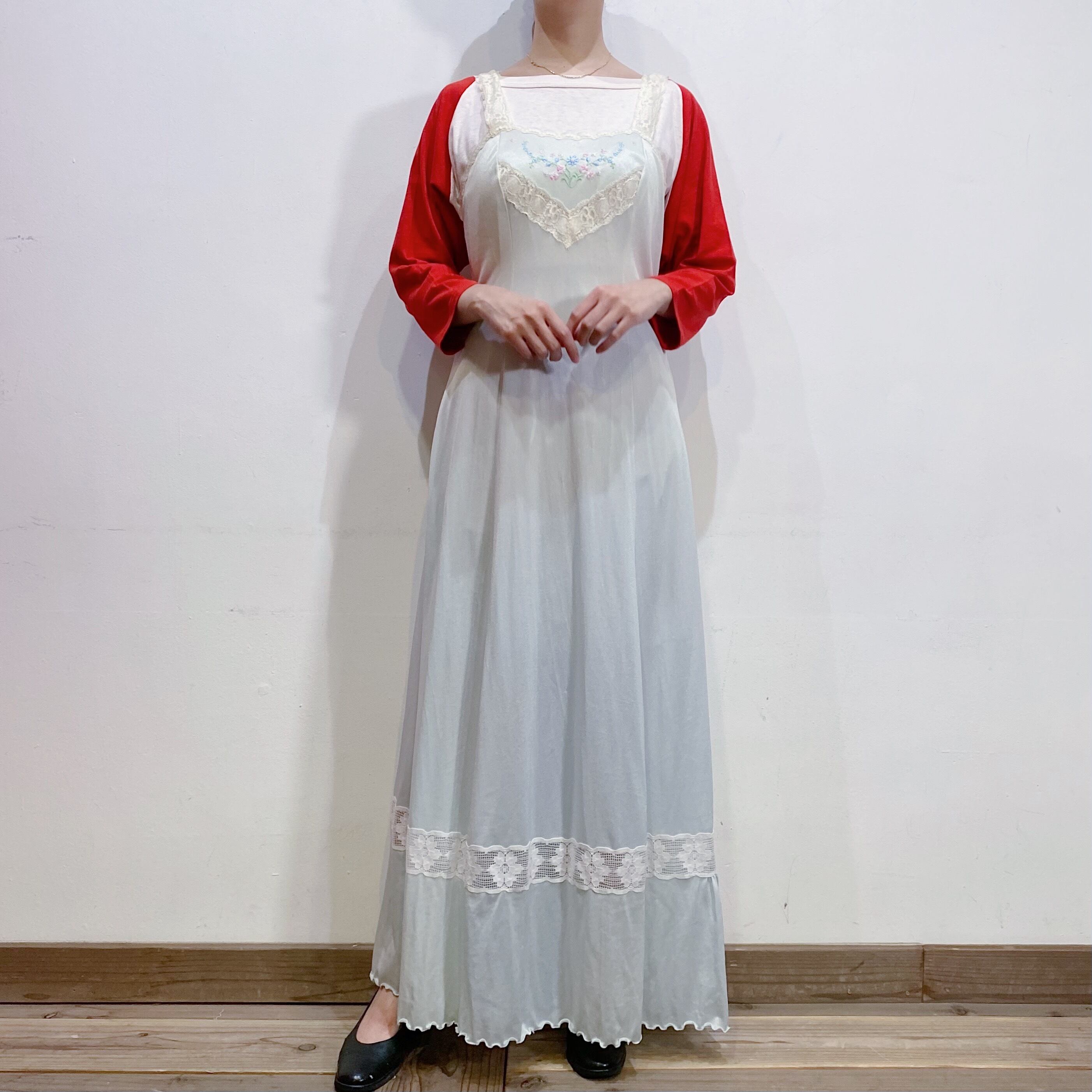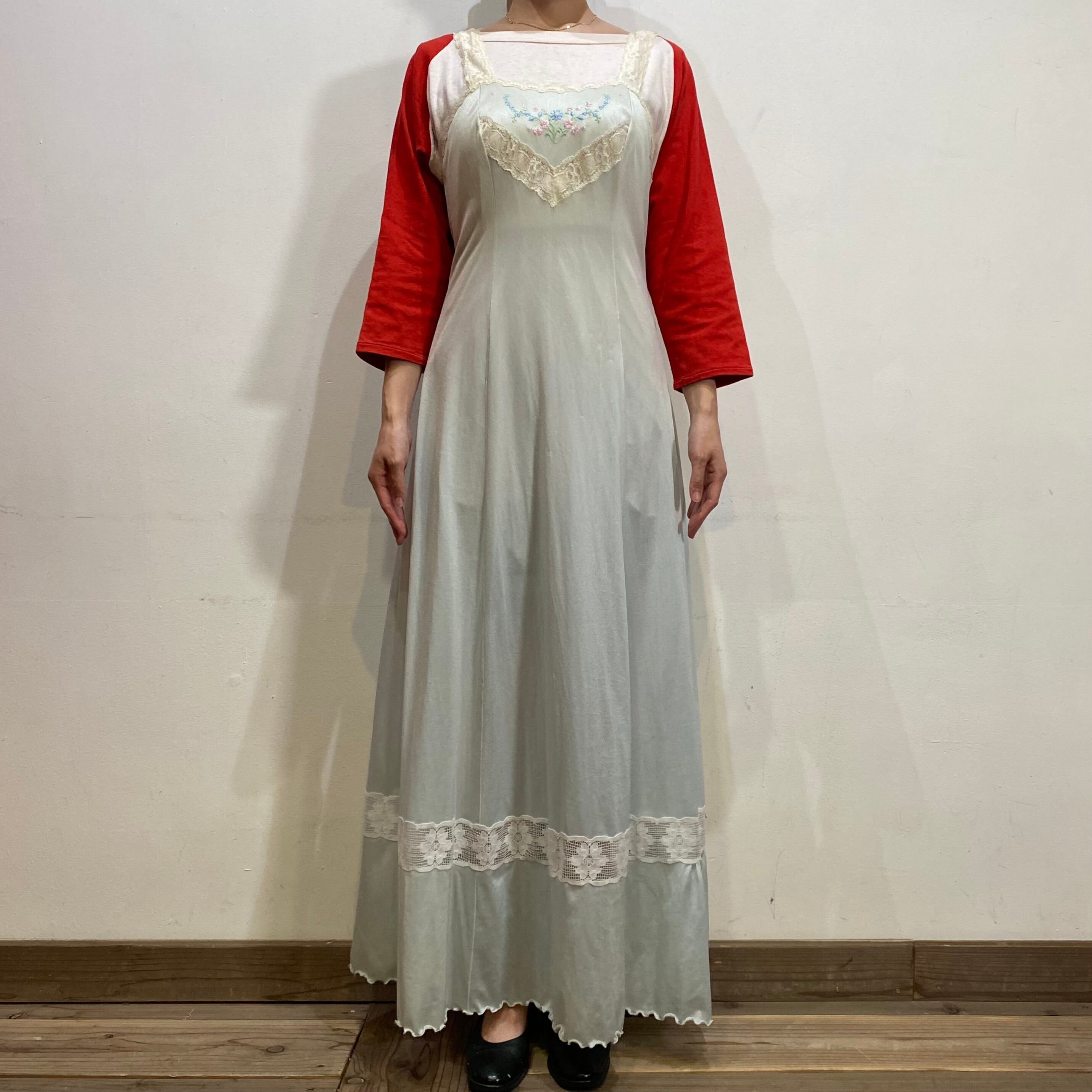 サックスブルーベースに胸元のお花の刺繍が可愛い、70年代のランジェリーワンピースです。