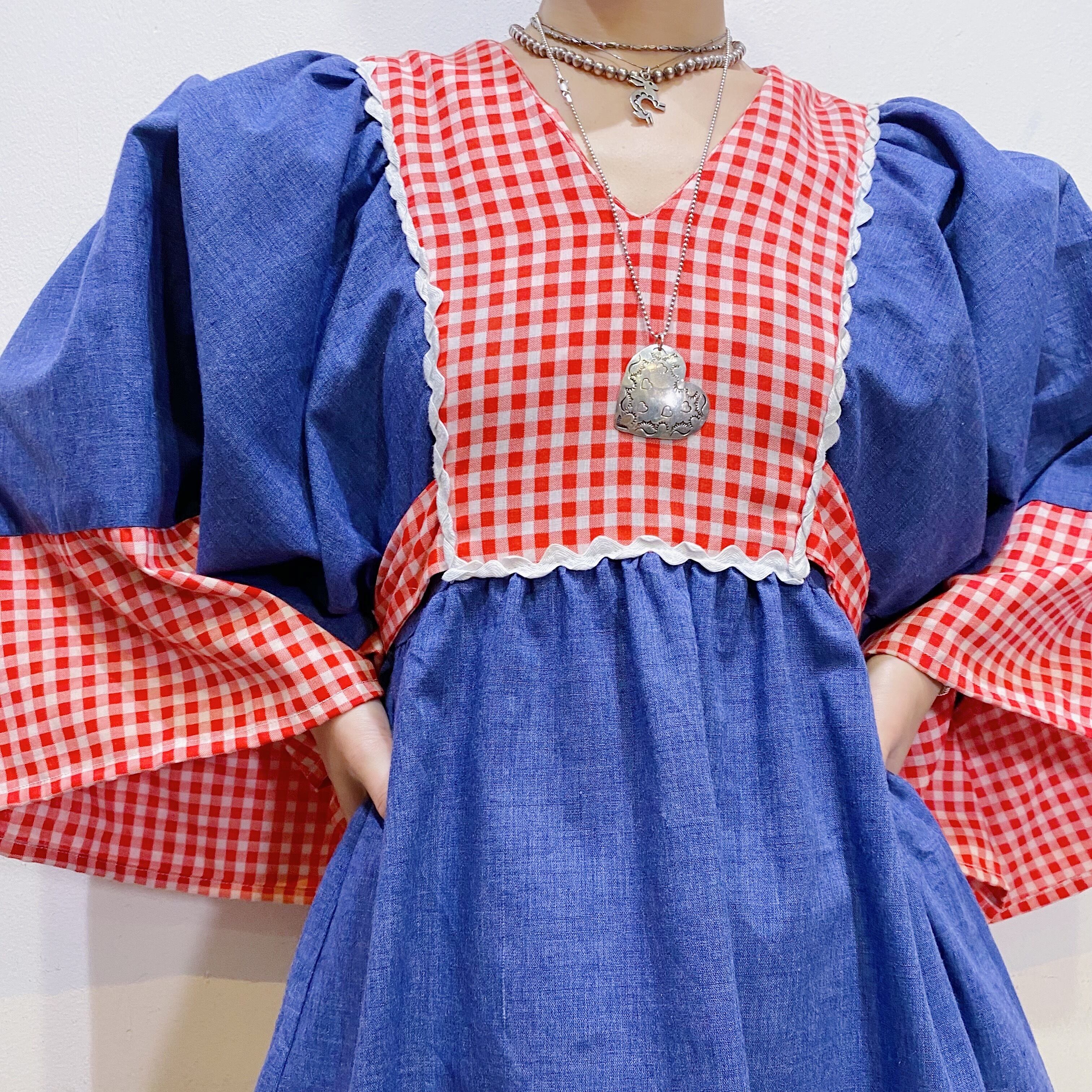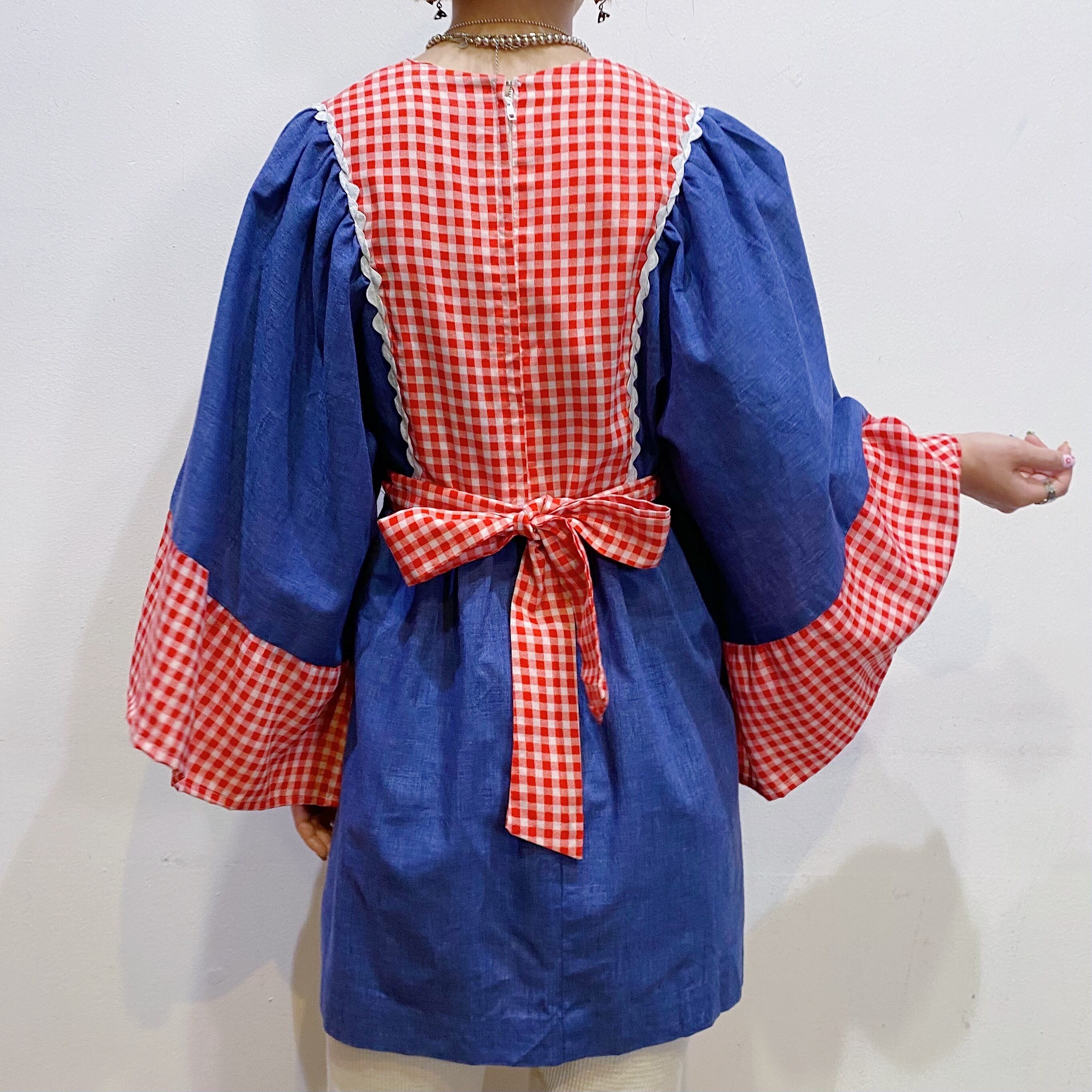 赤白ギンガムチェックにダンガリー素材の組み合わせがとっても可愛い、70年代のチュニックです。