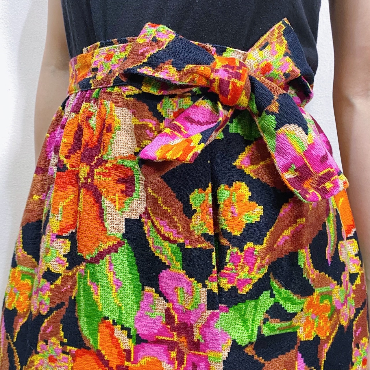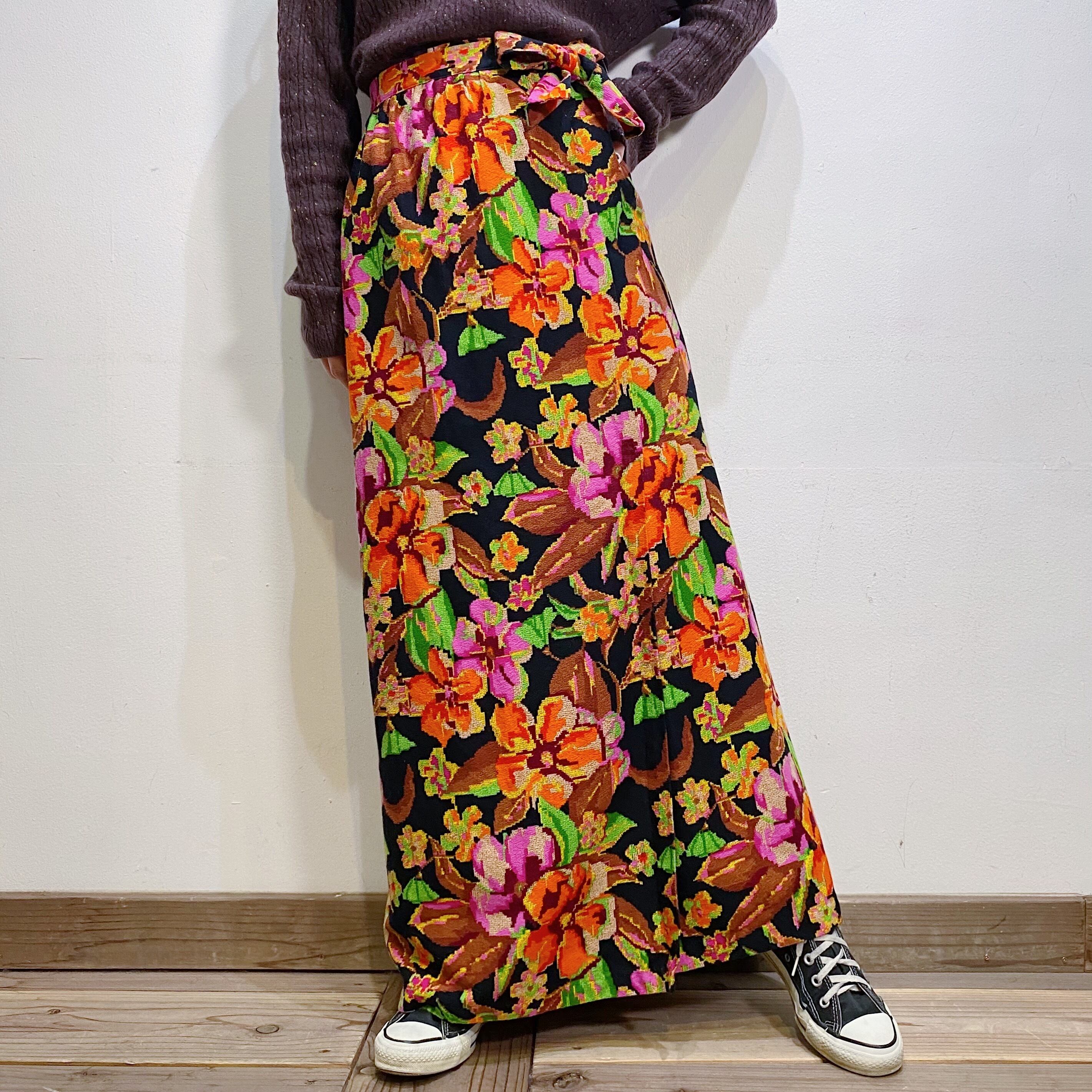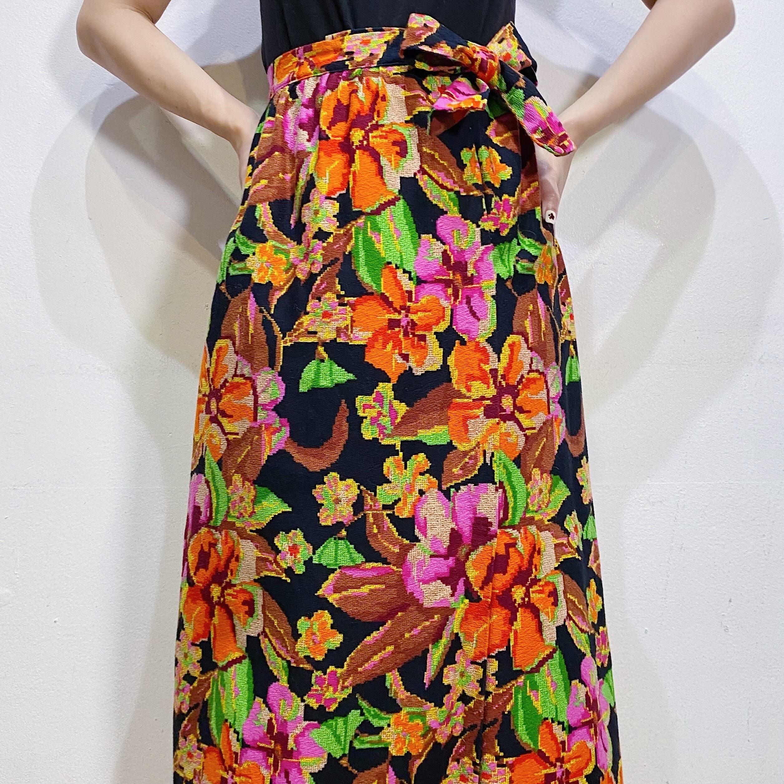 ブラックベースにオレンジやピンクの花柄が可愛い、70年代のロングスカートです。
