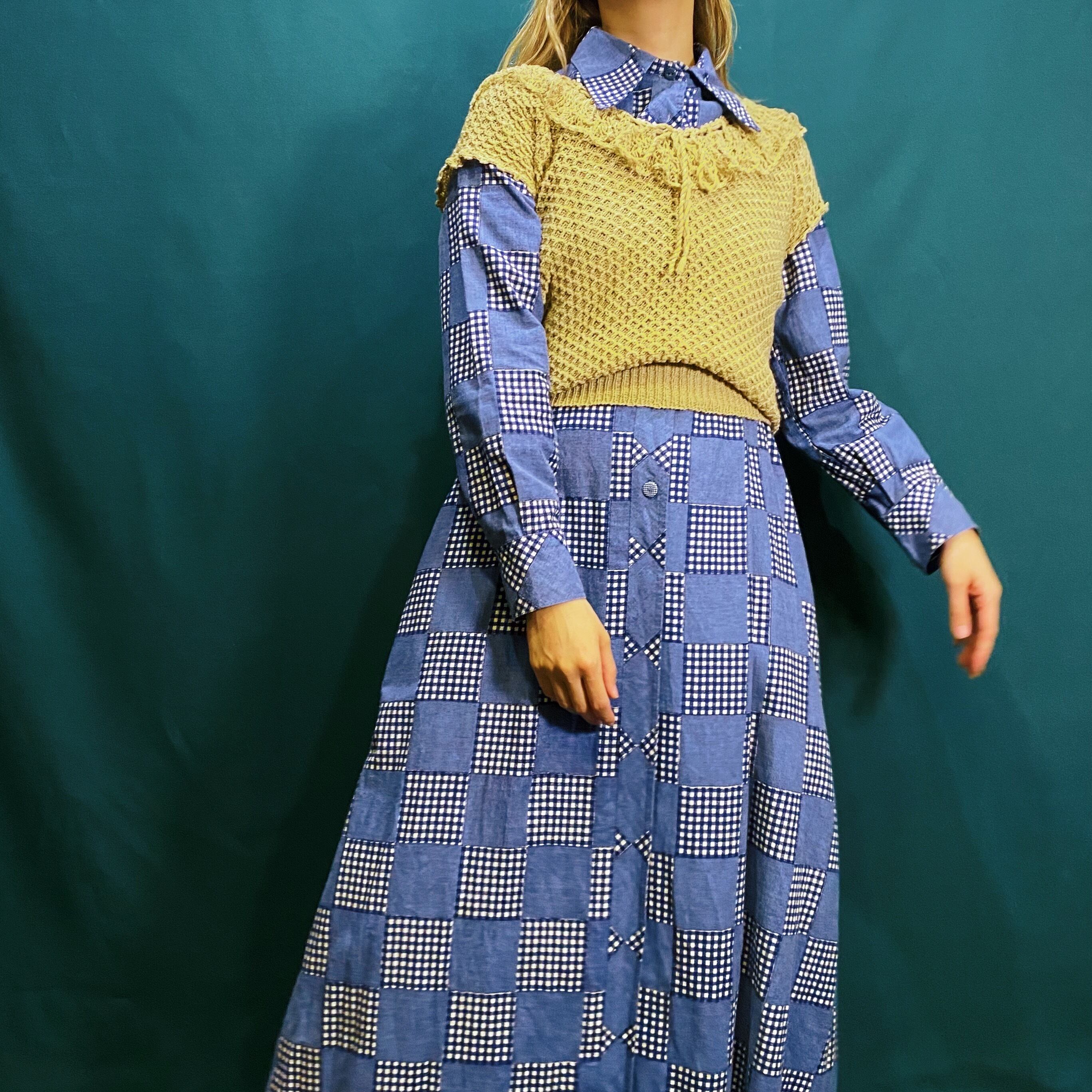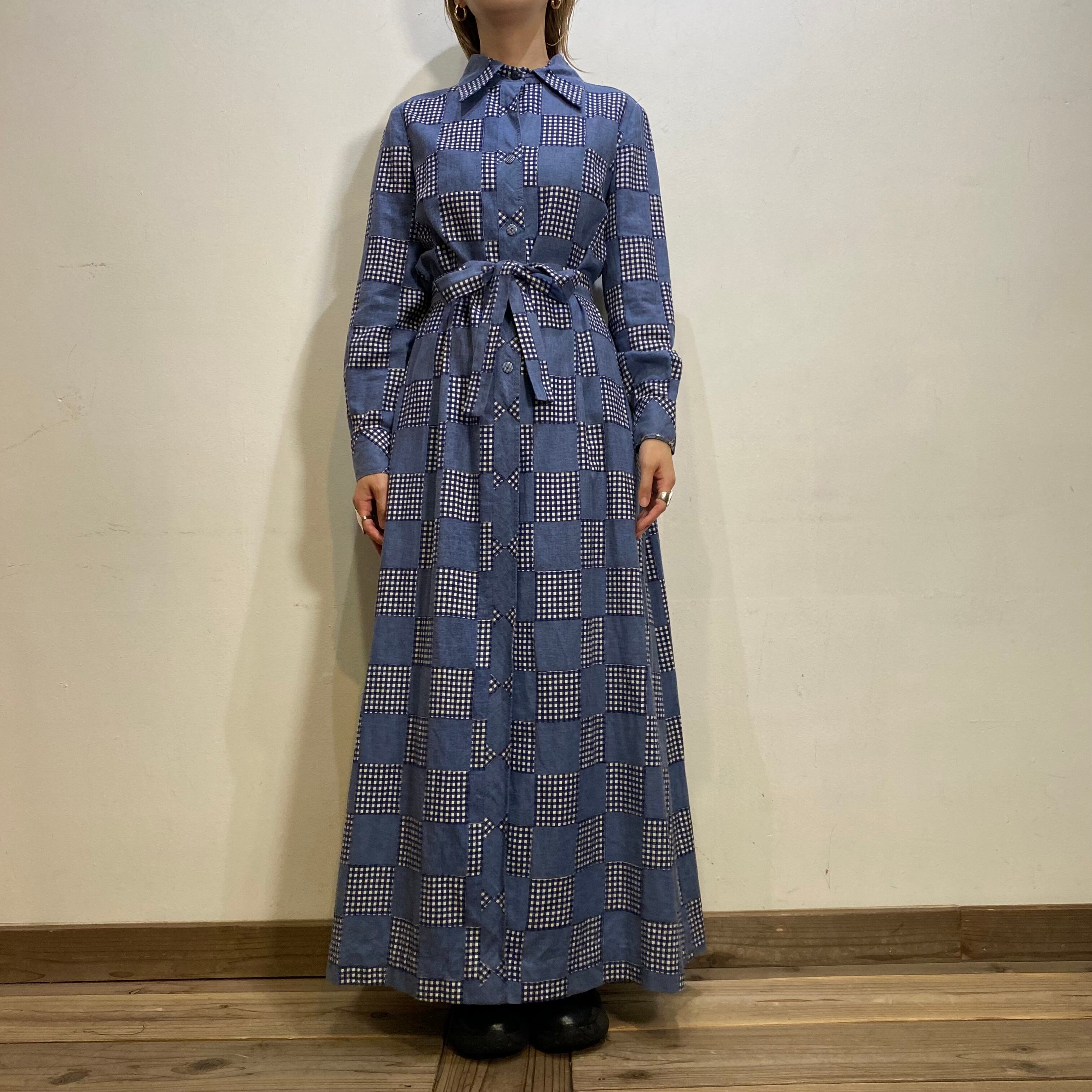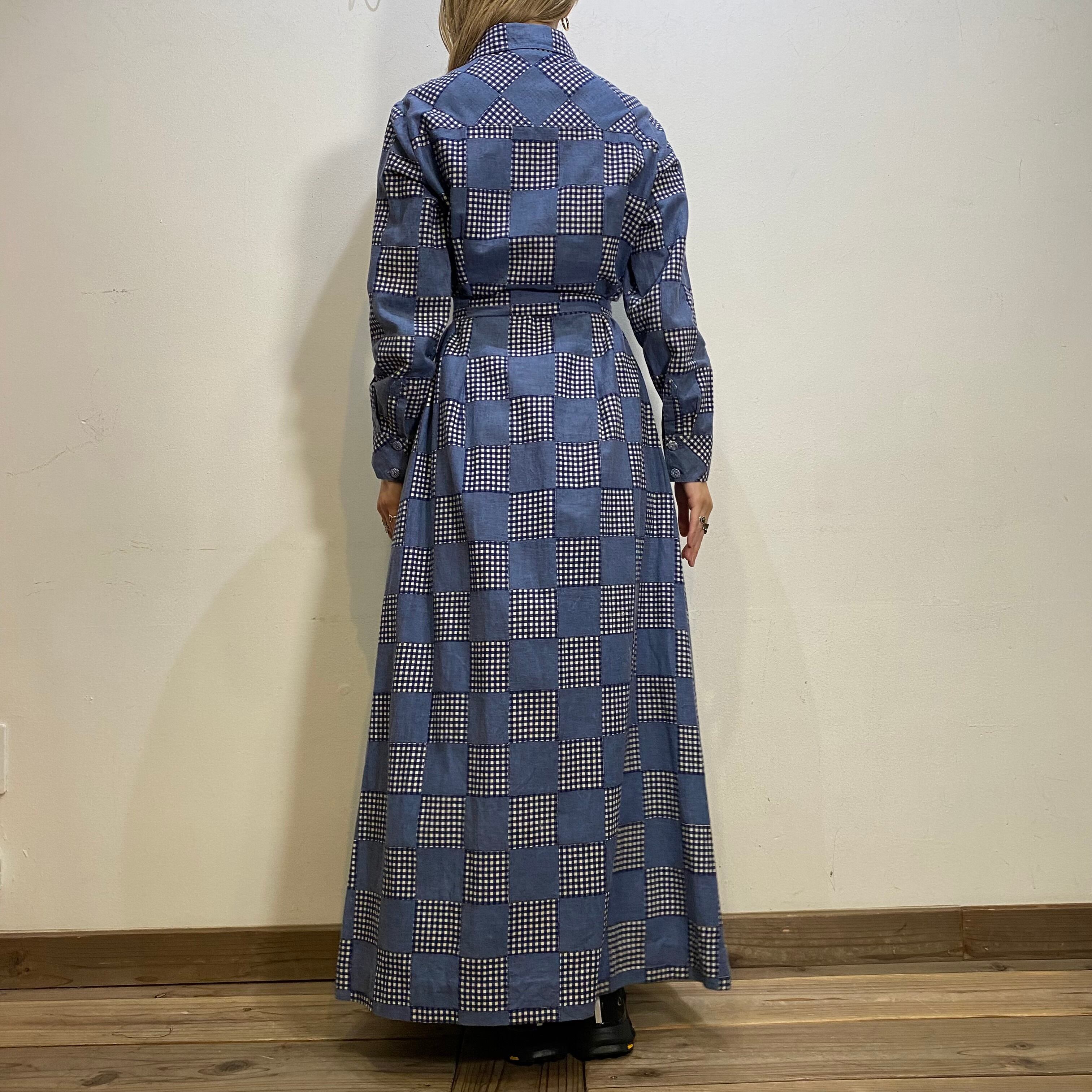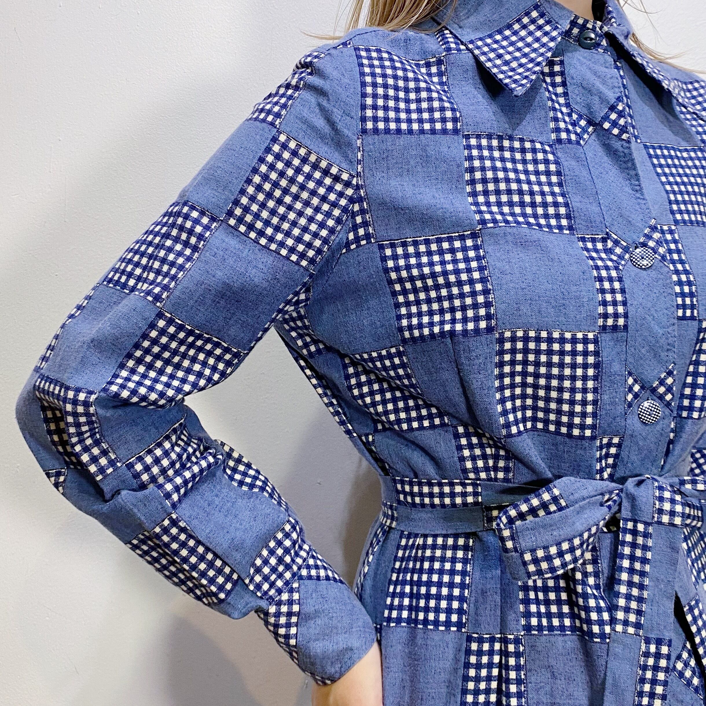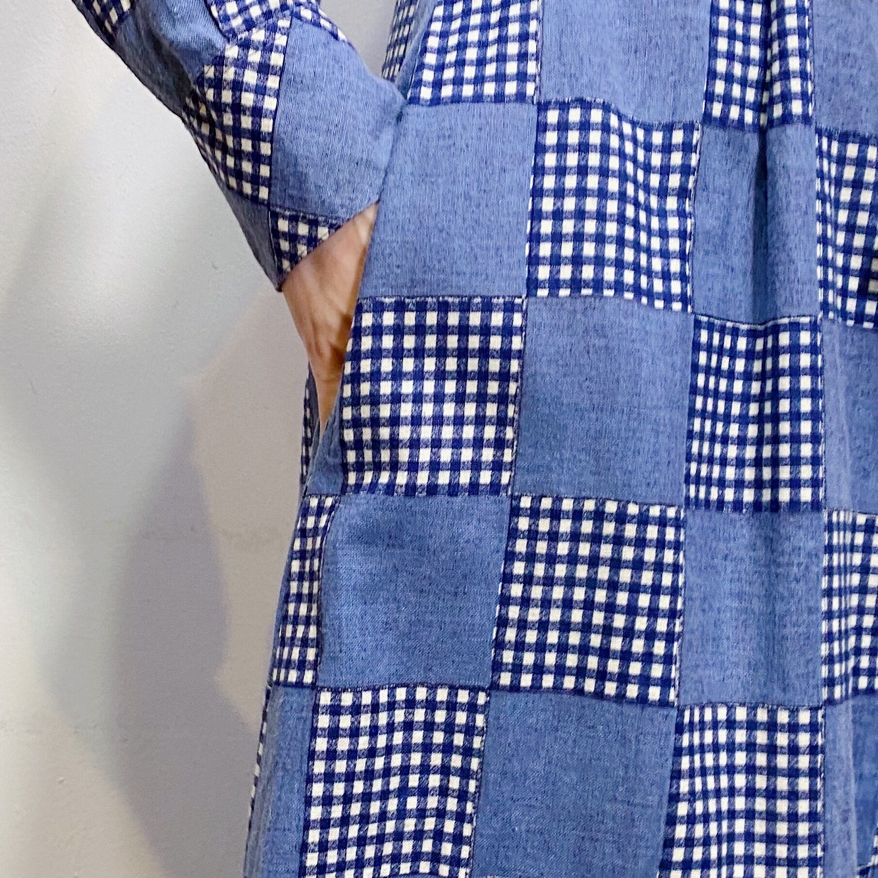 ブルーのパッチワークプリントが可愛い、シャツワンピースです。