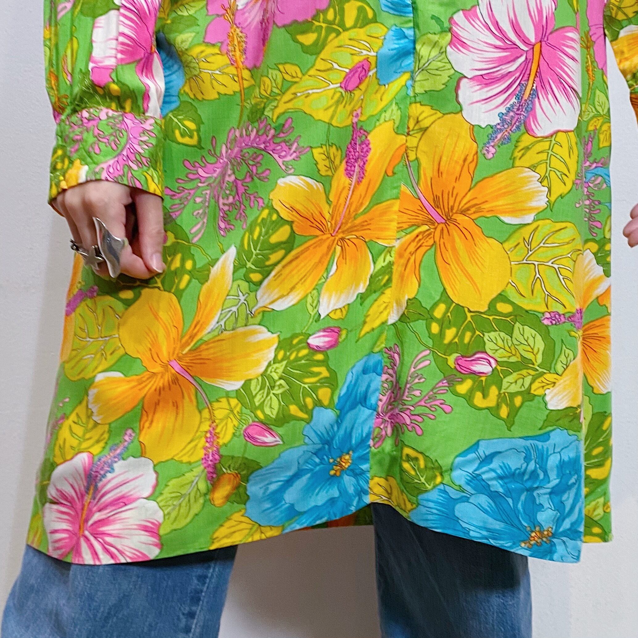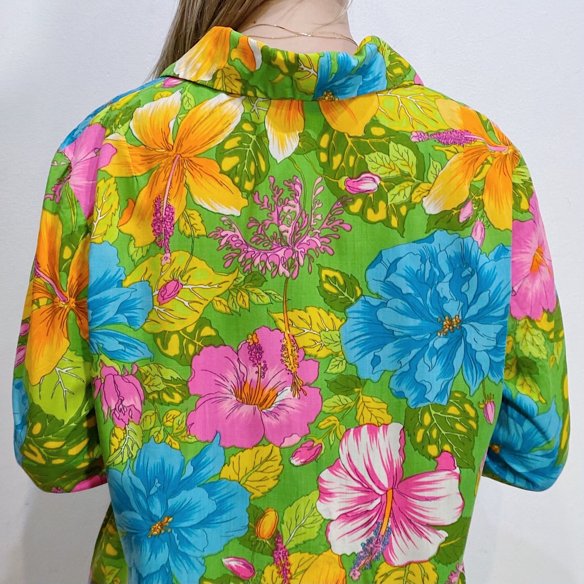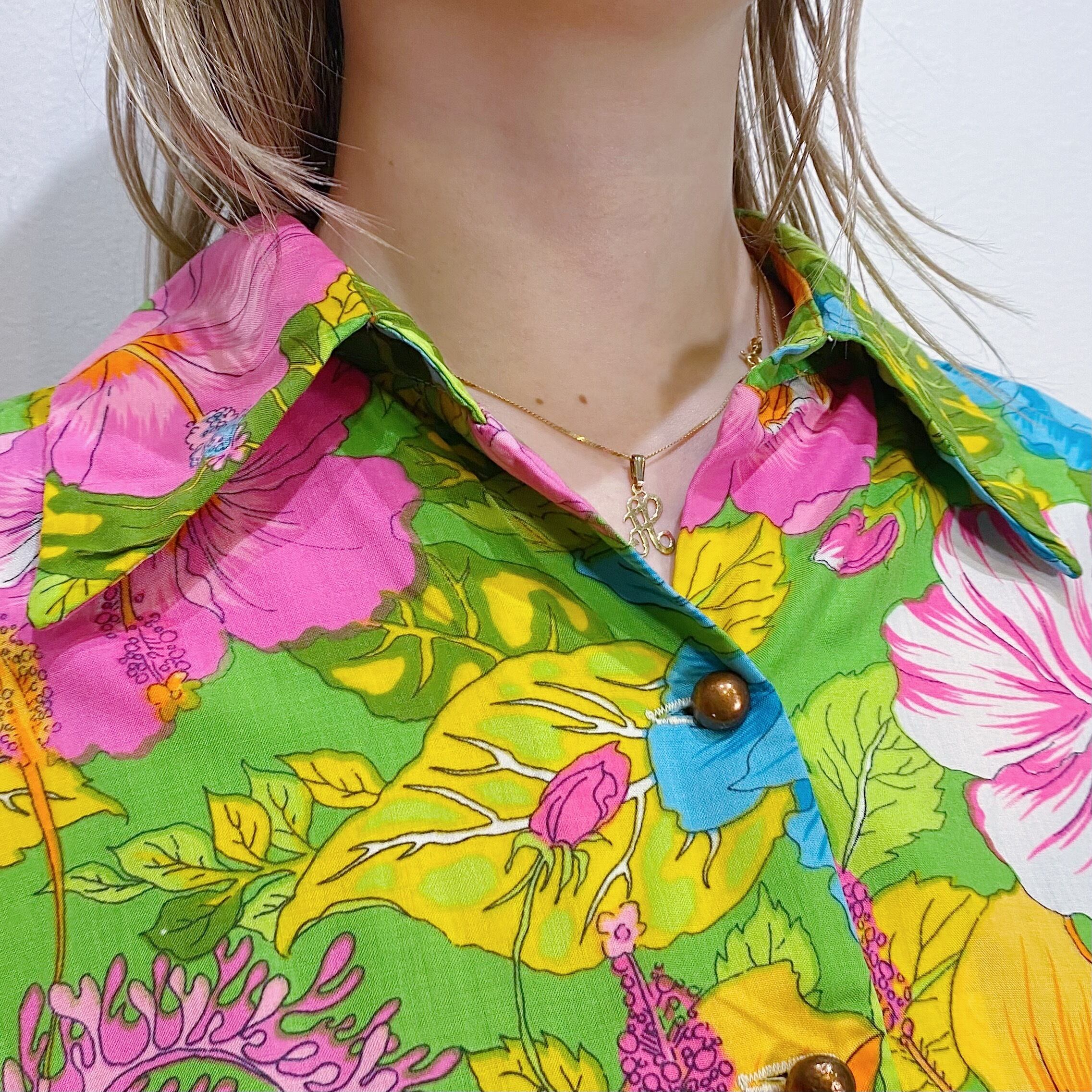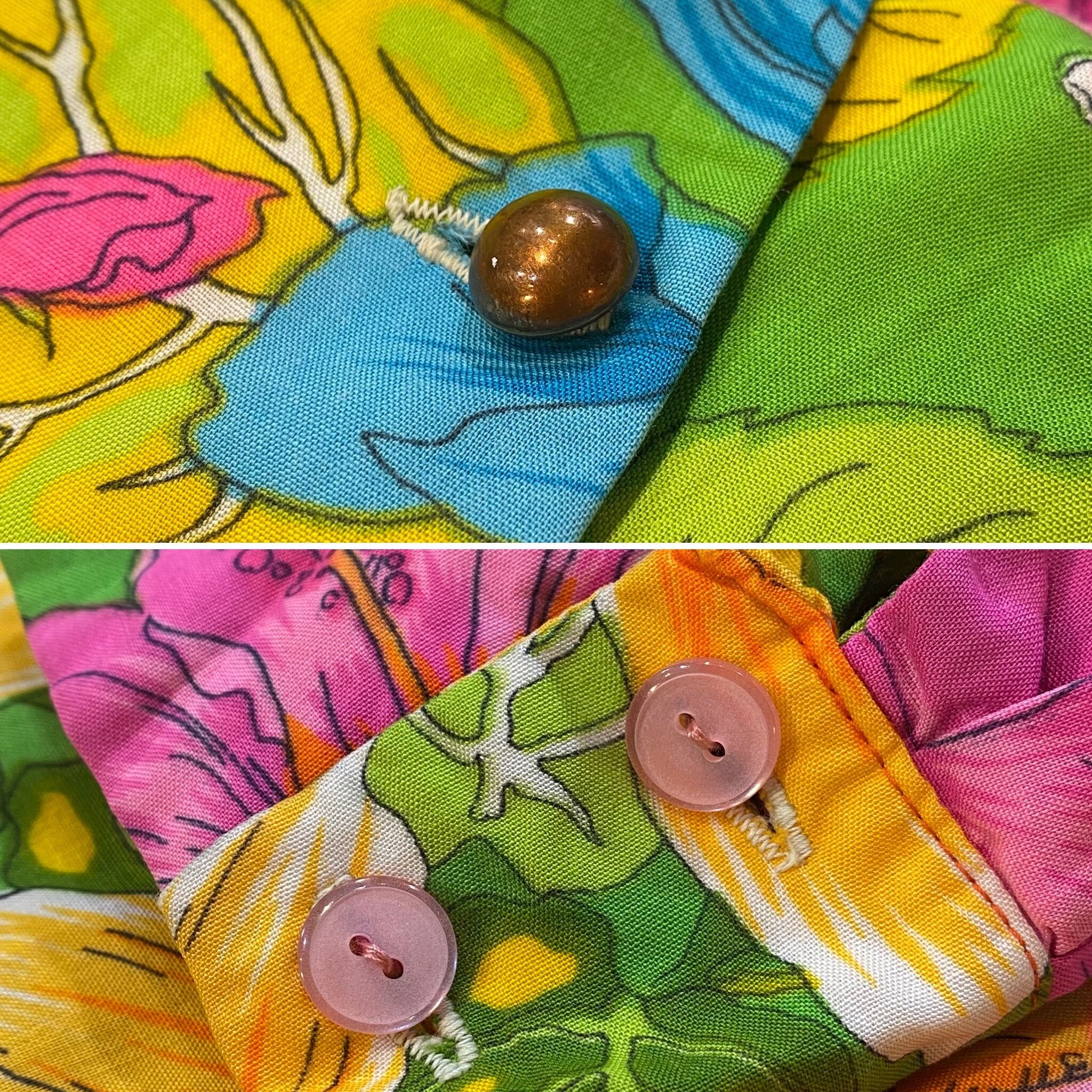 カラフルな色使いで着るだけでハッピーになれる、70年代のシャツワンピースです。