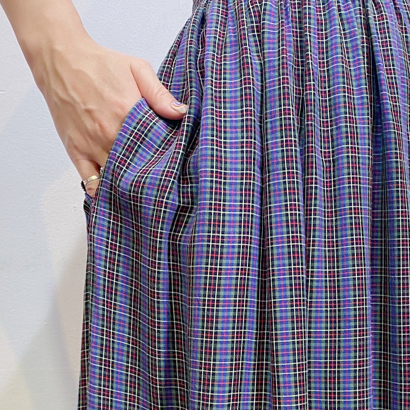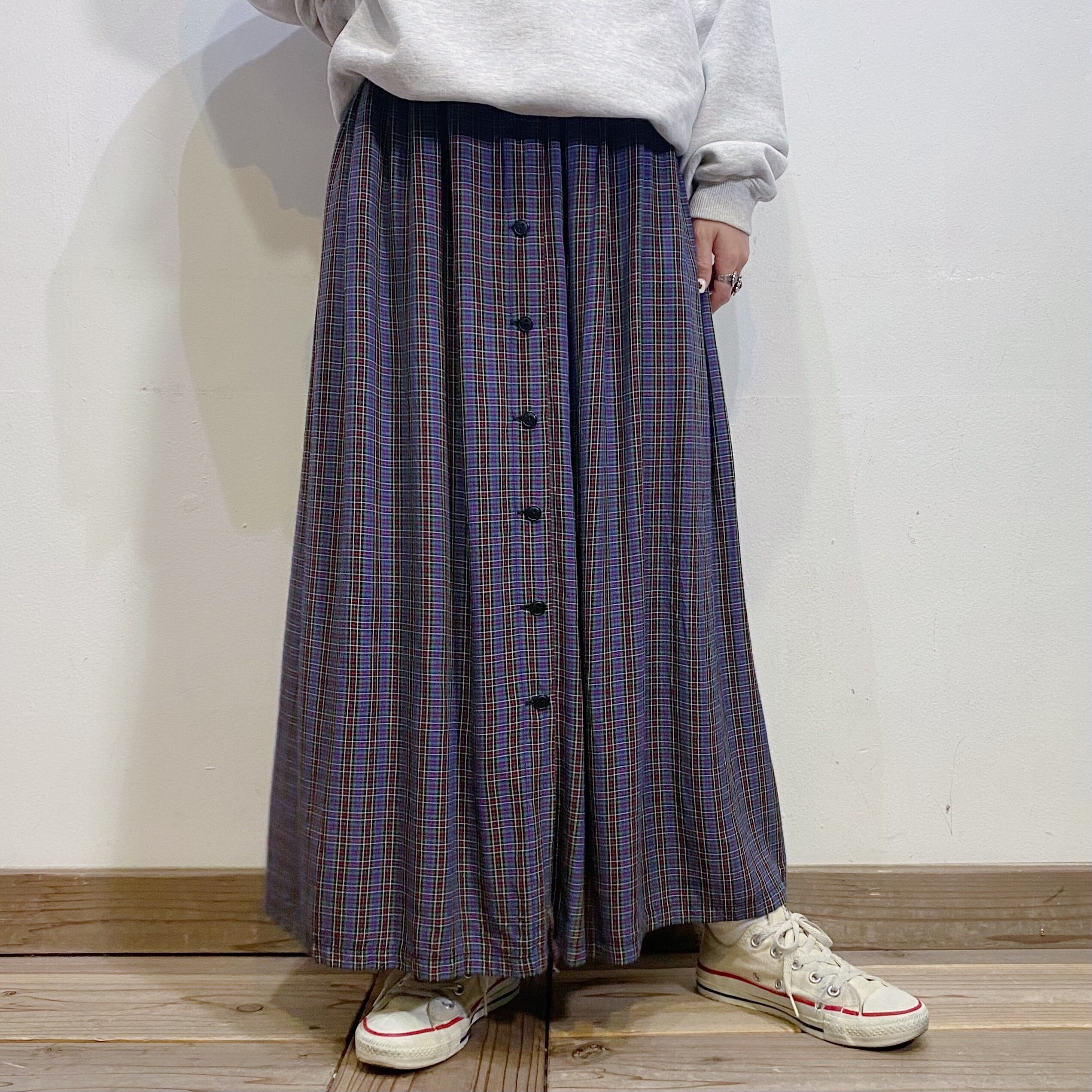 落ち着いたブルーやグリーンなどの色合いでコーデに取り入れやすそうな、チェック柄のスカートです。