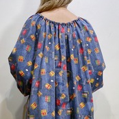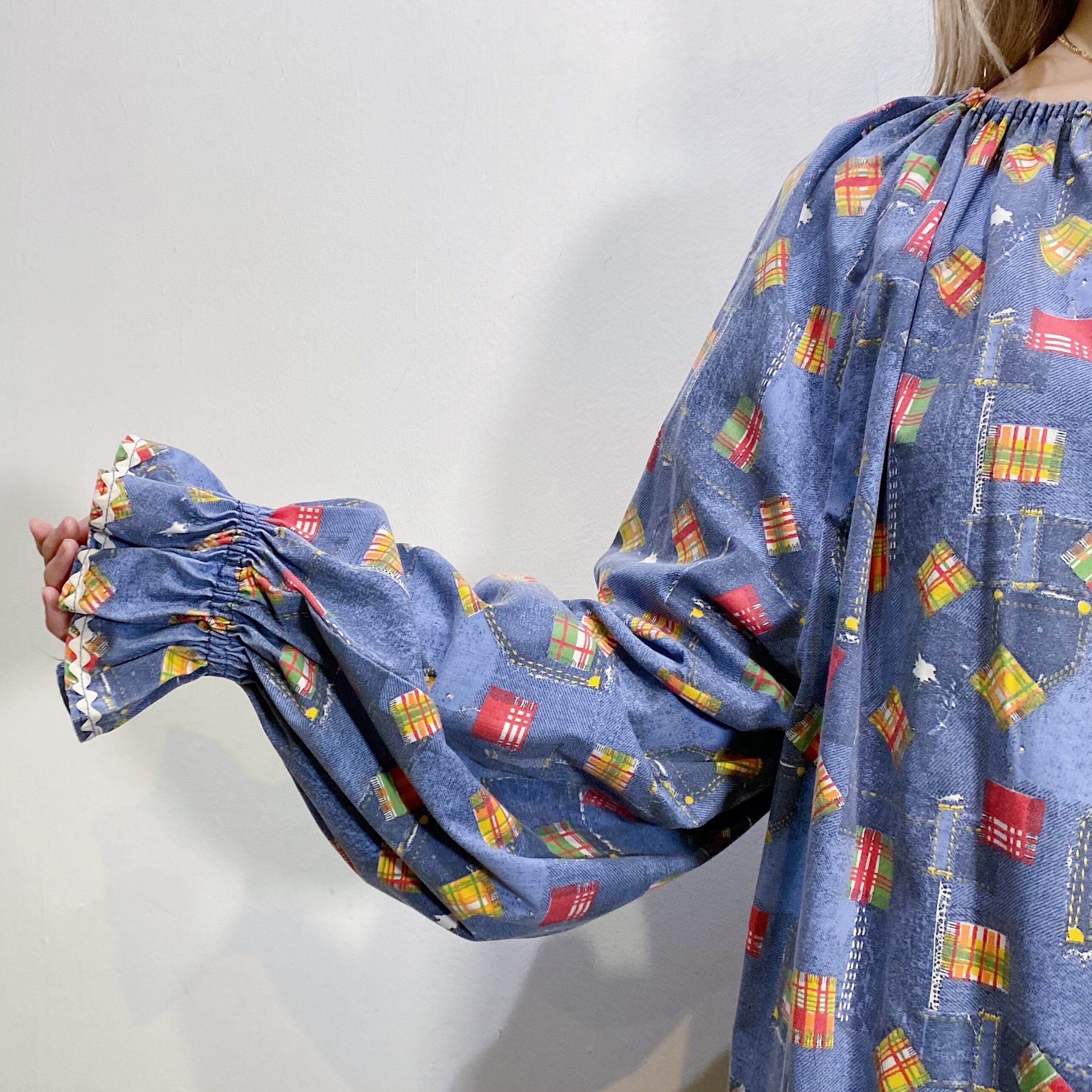 デニムとチェックのパッチワーク風プリントが可愛い、スモックトップスです。