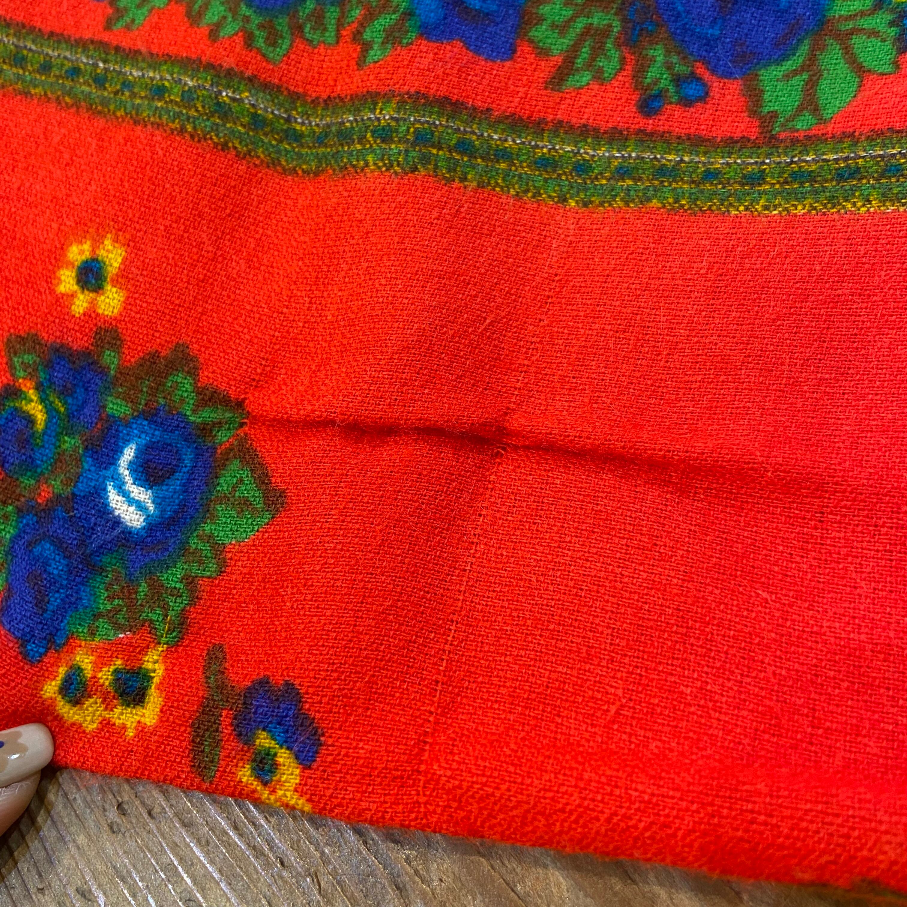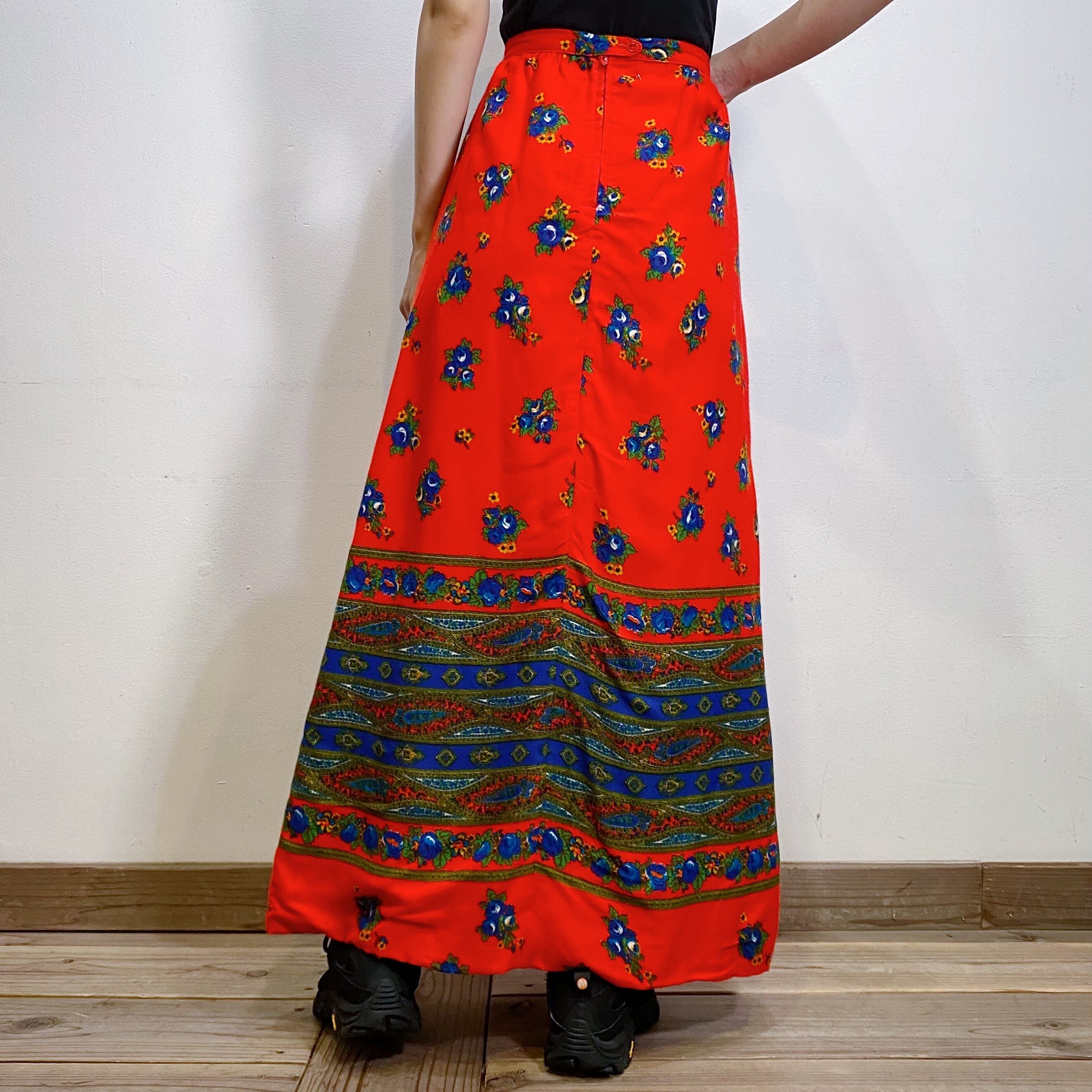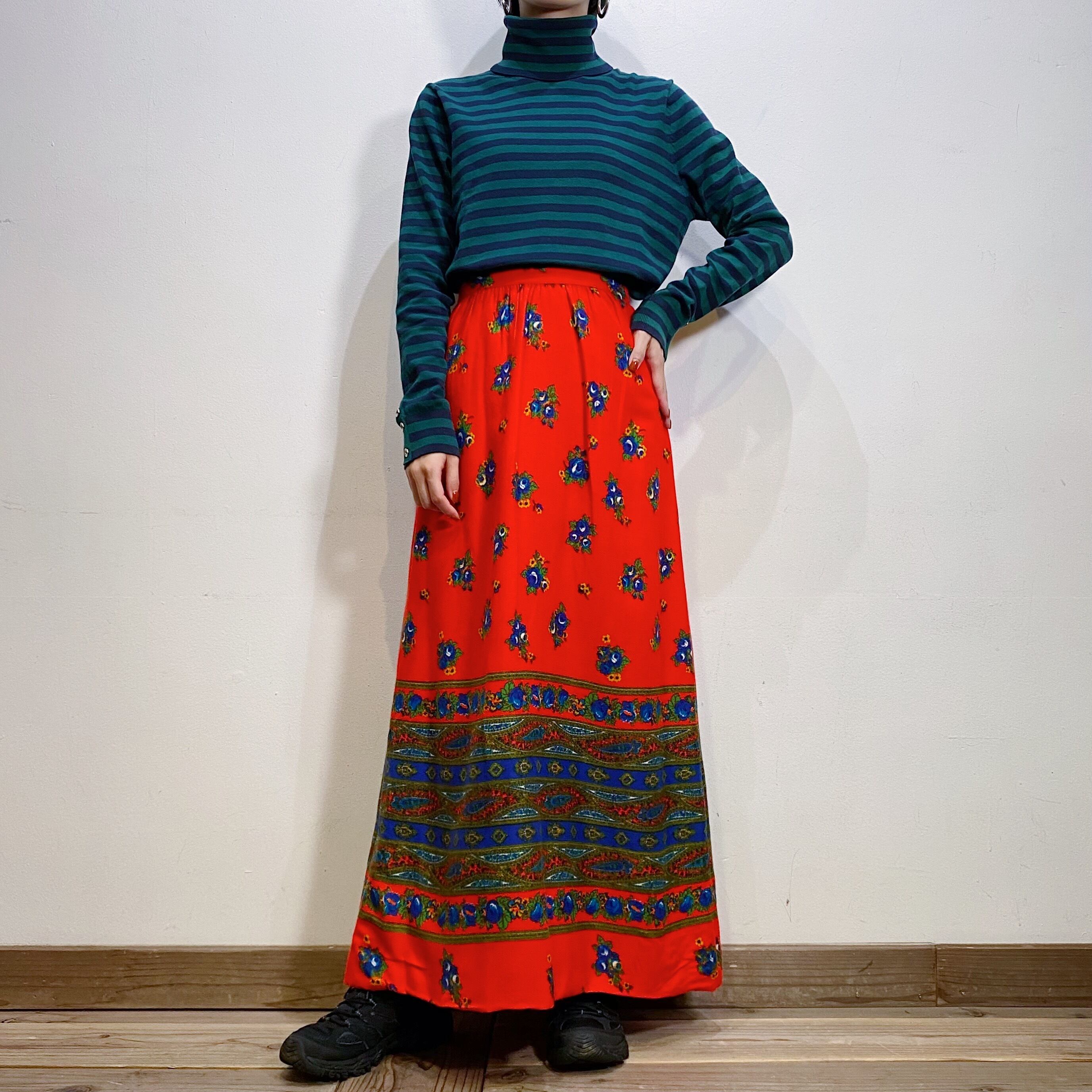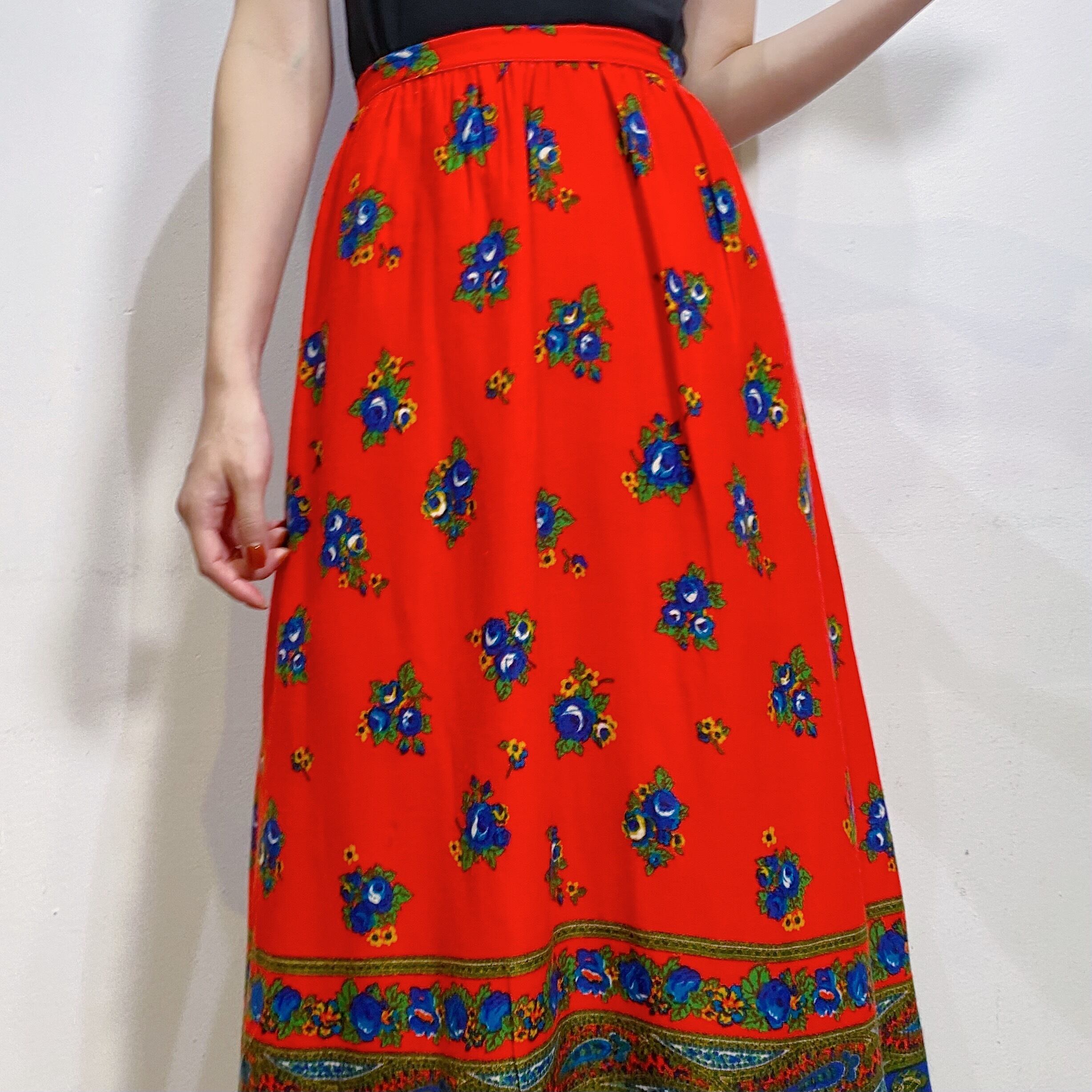 レッドベースにブルーぼお花柄が可愛い、70年代のロングスカートです。
