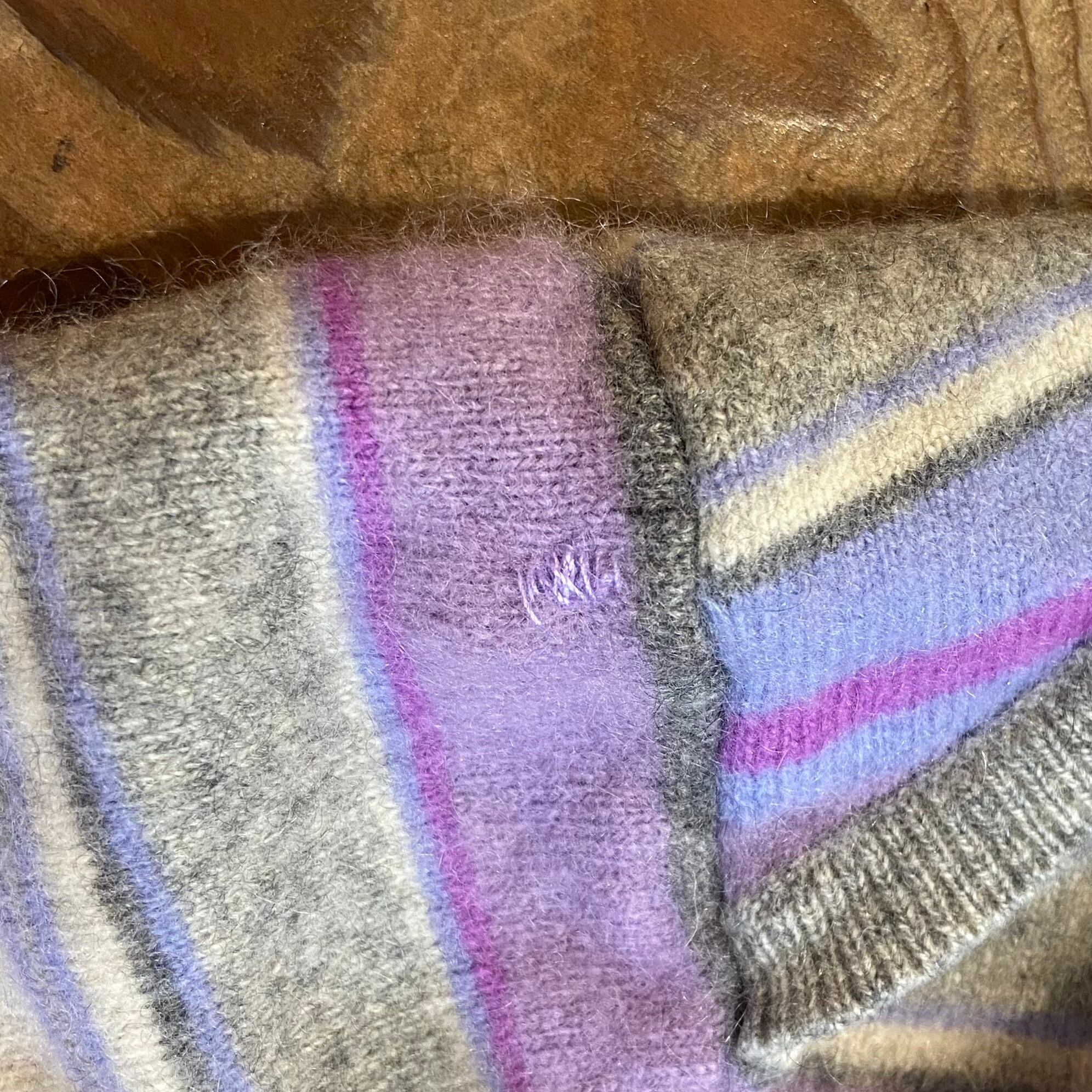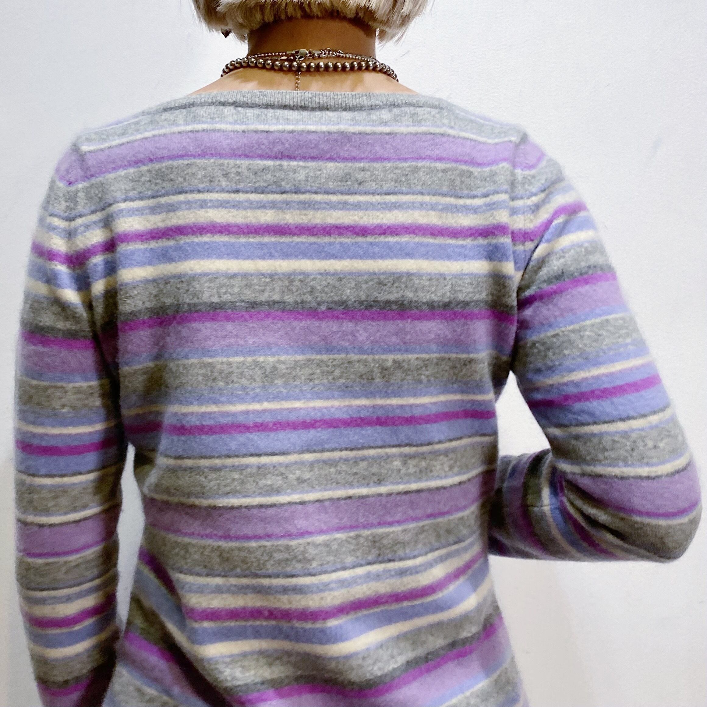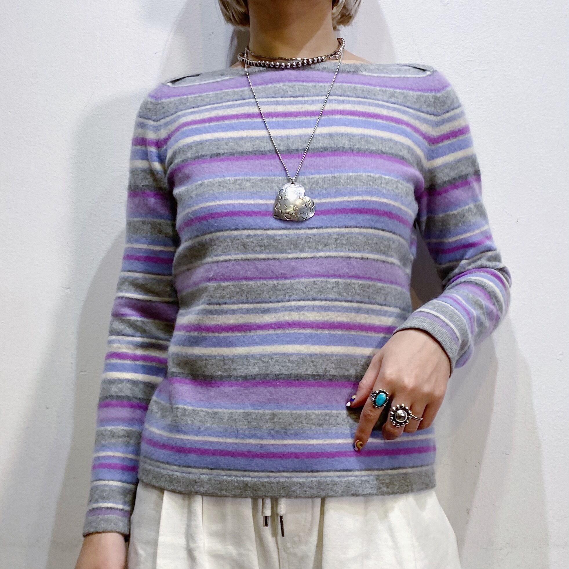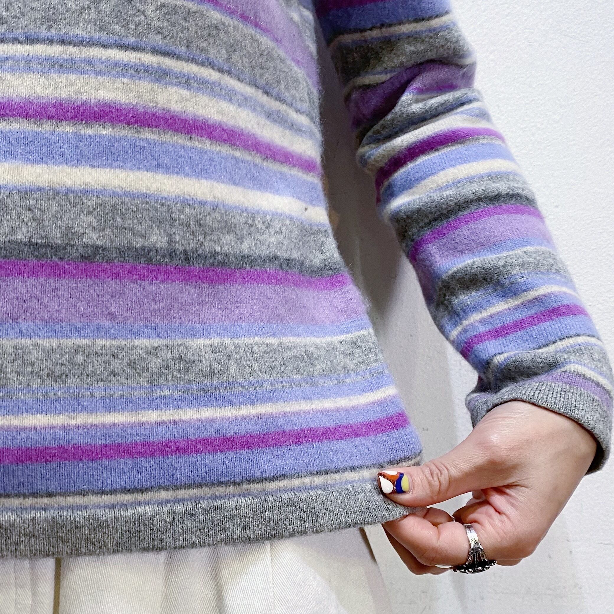 グレーとパープルのストライプの色合わせが可愛い、カシミヤセーターです。