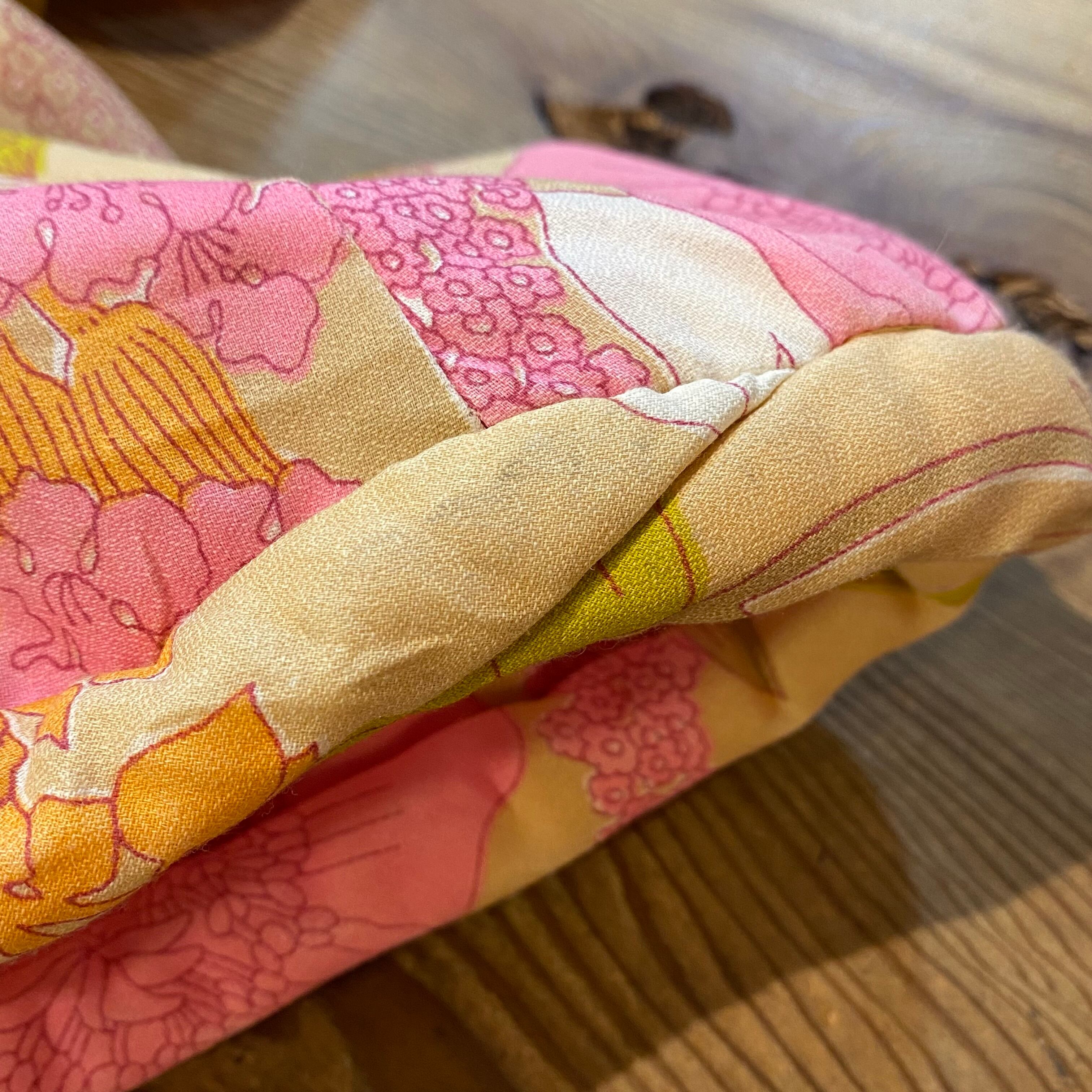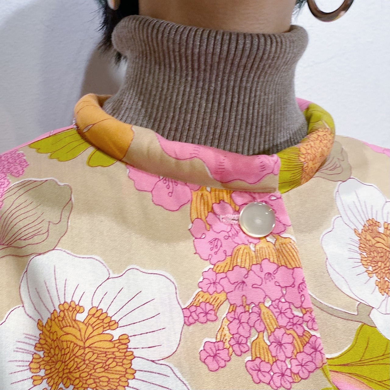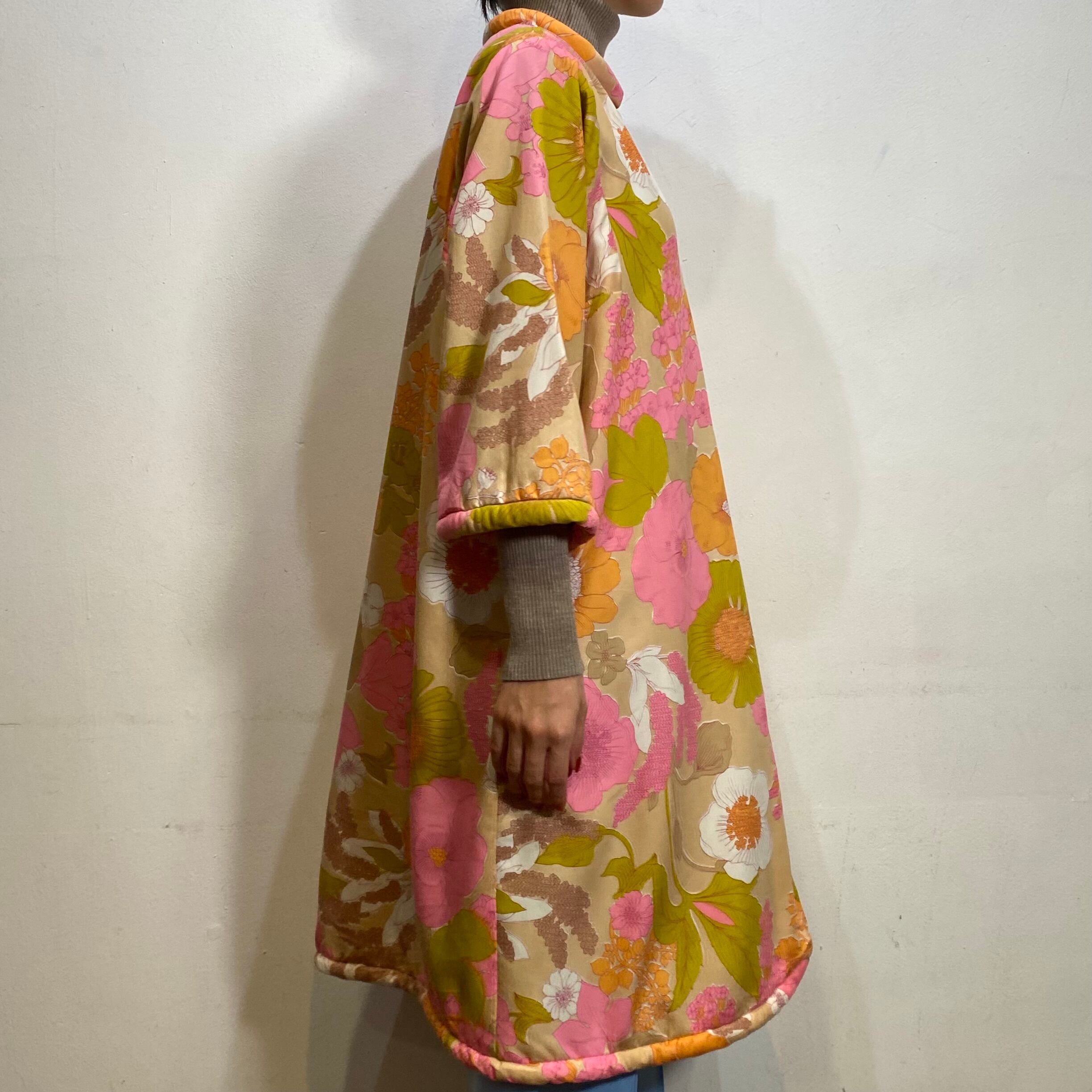ベージュベースにピンクやオレンジの花柄が可愛い、70年代のワンピースです。