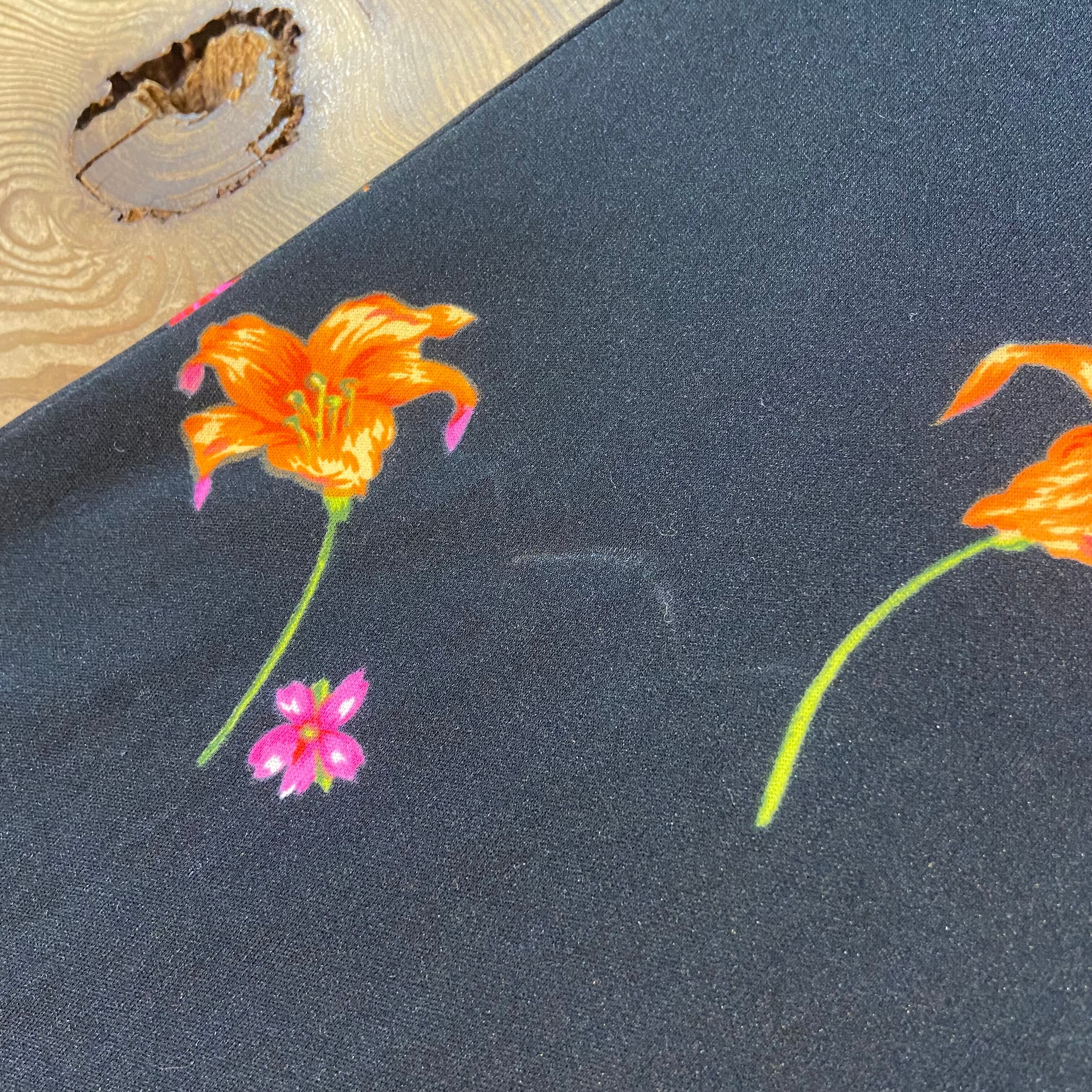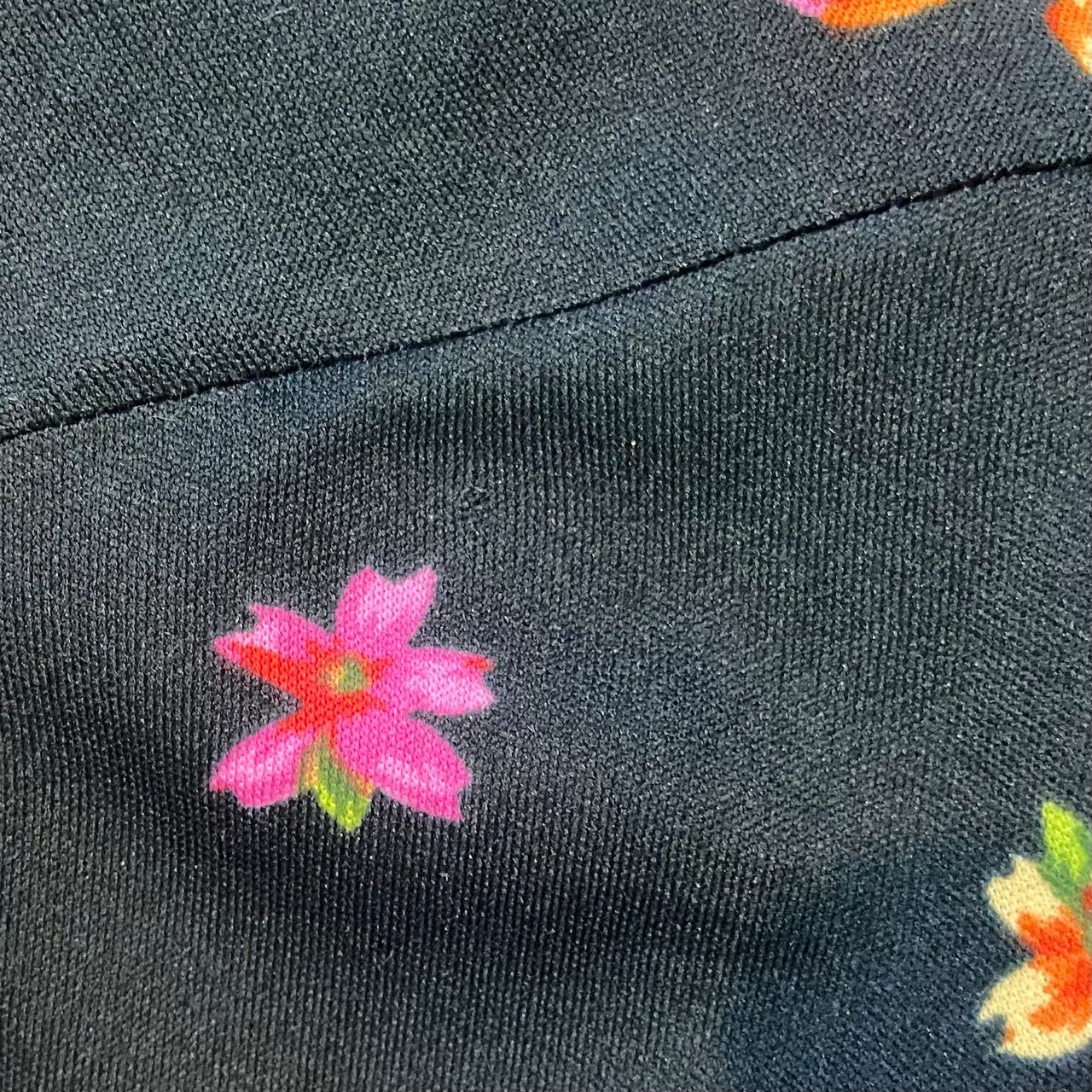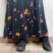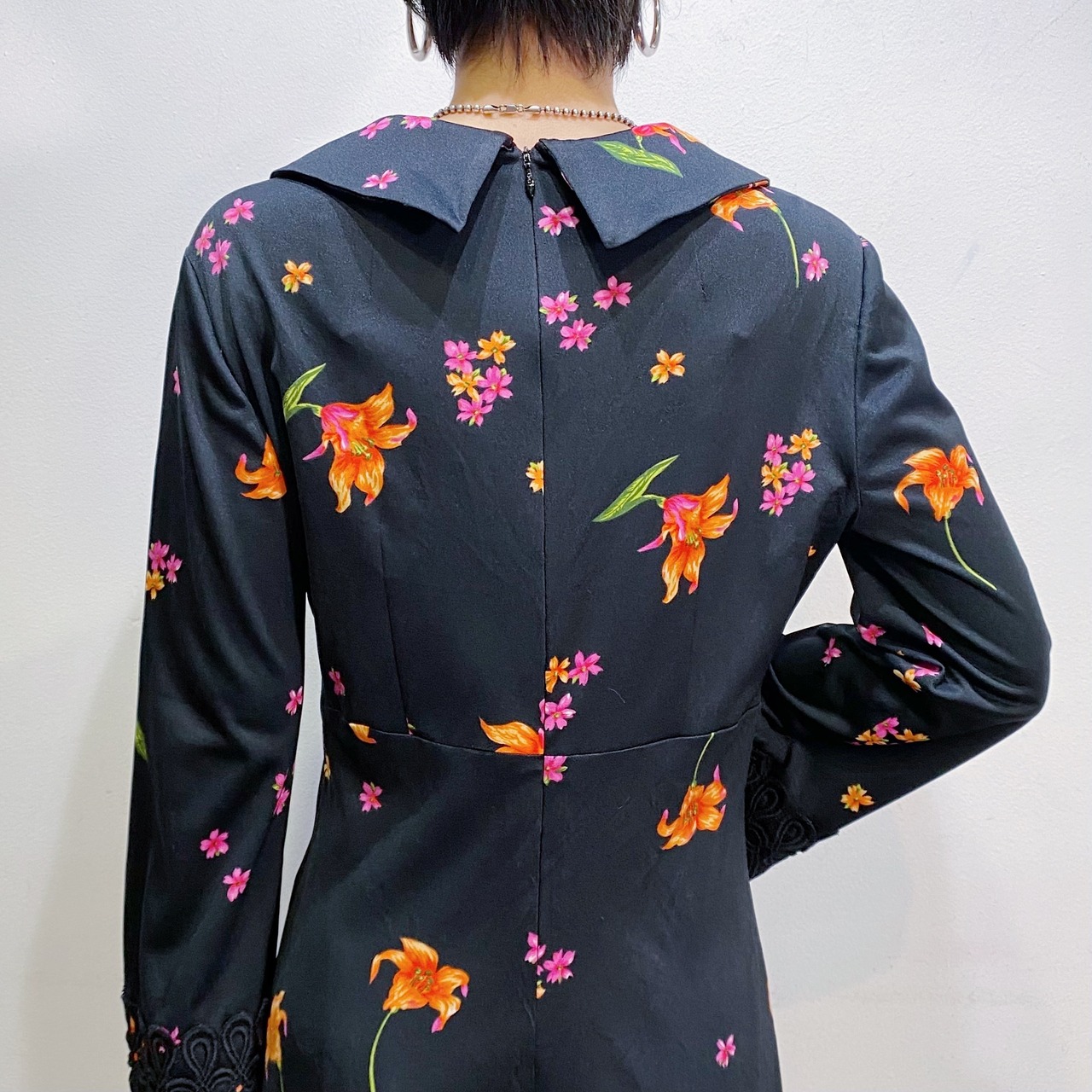 ブラックベースにオレンジとピンクの花柄が映える、70年代のワンピースです。