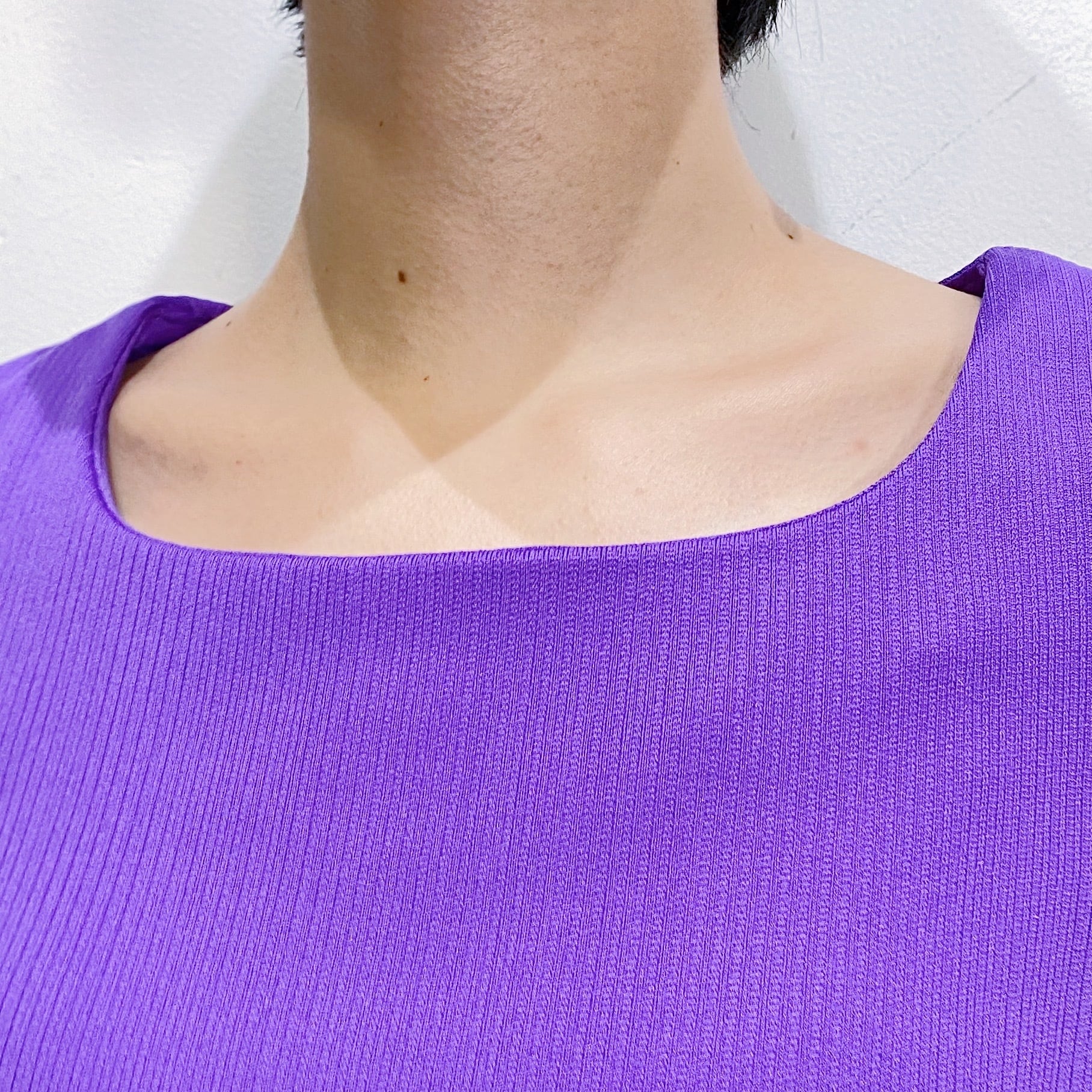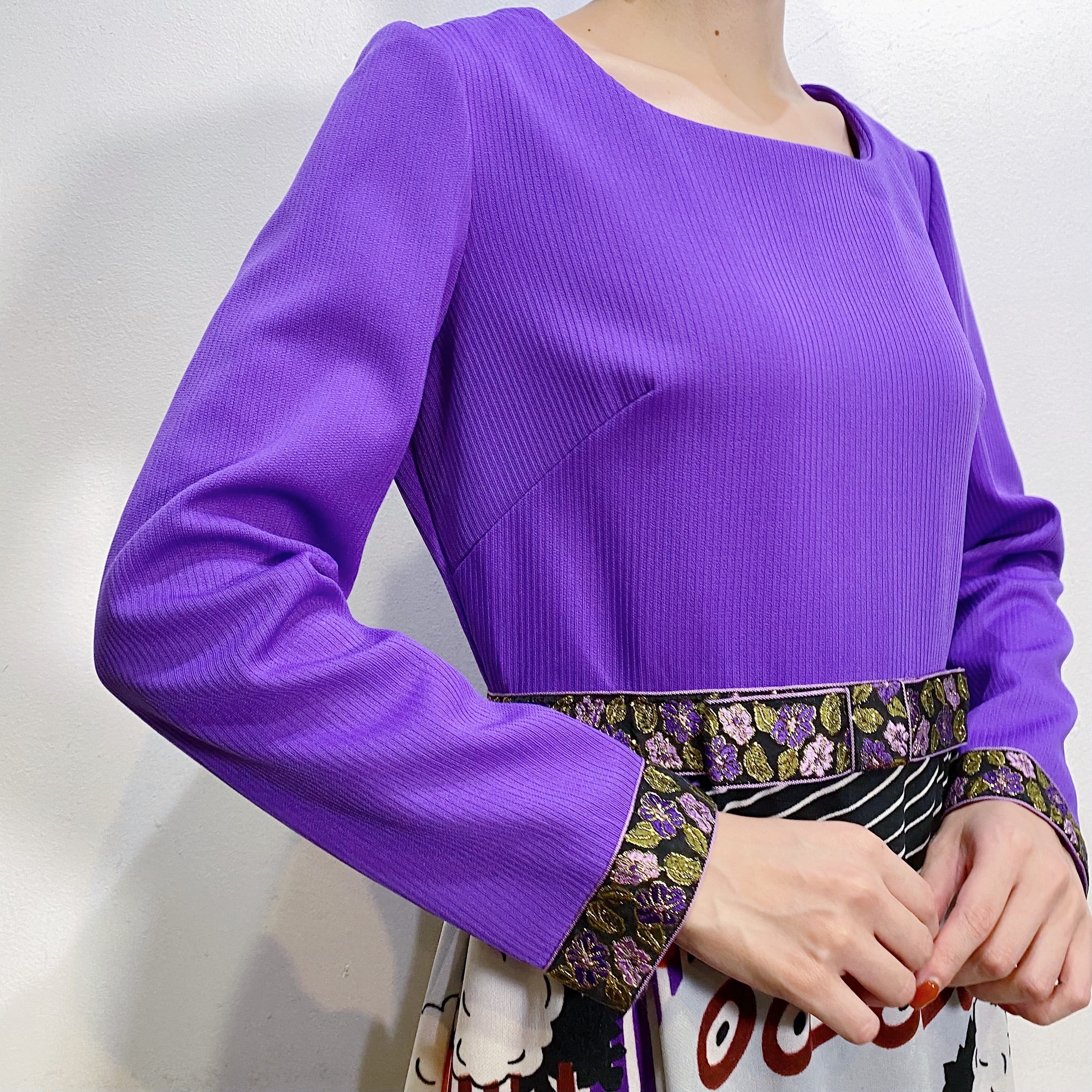 鮮やかなパープルとの切り替えがレイヤードスタイルのようでとってもキュート。