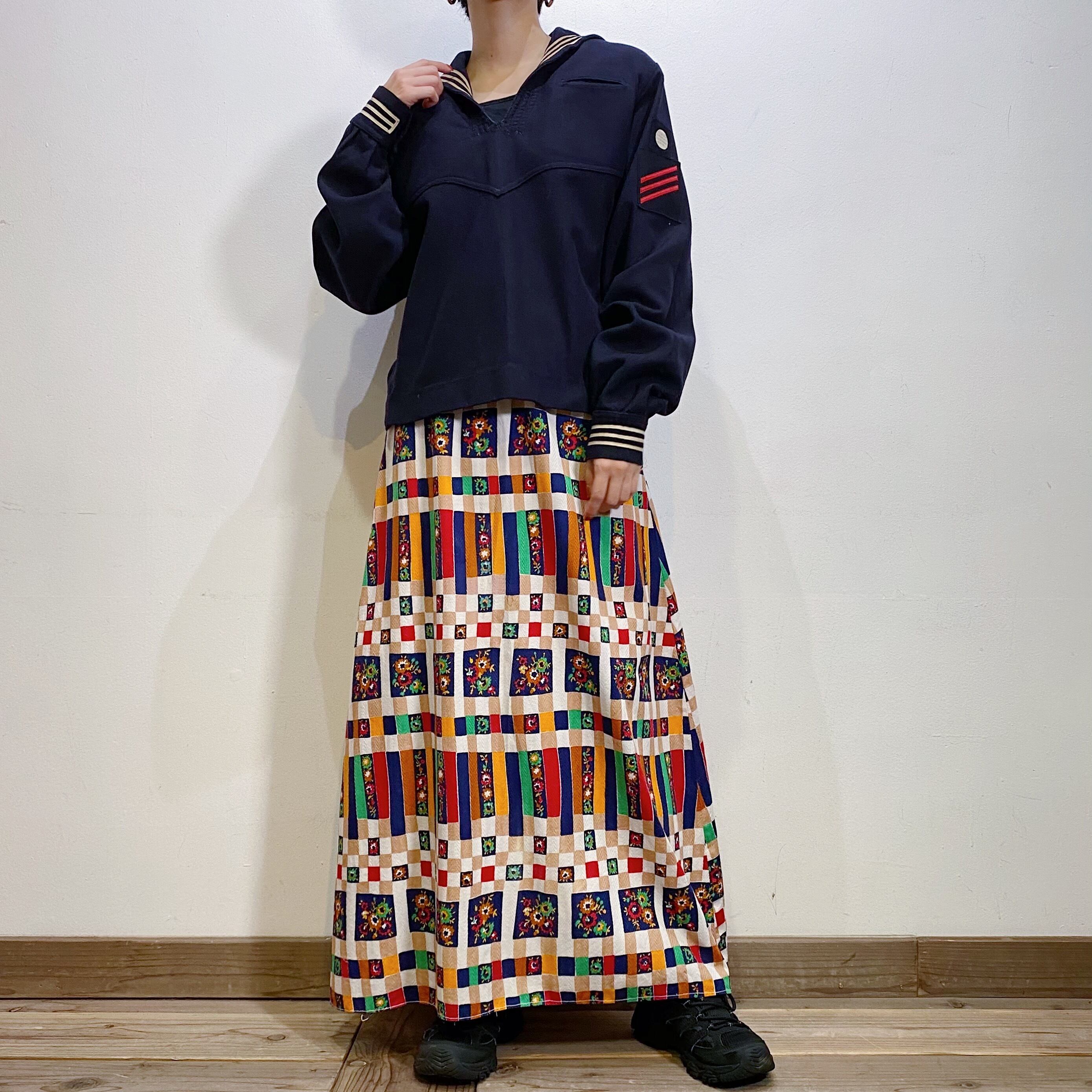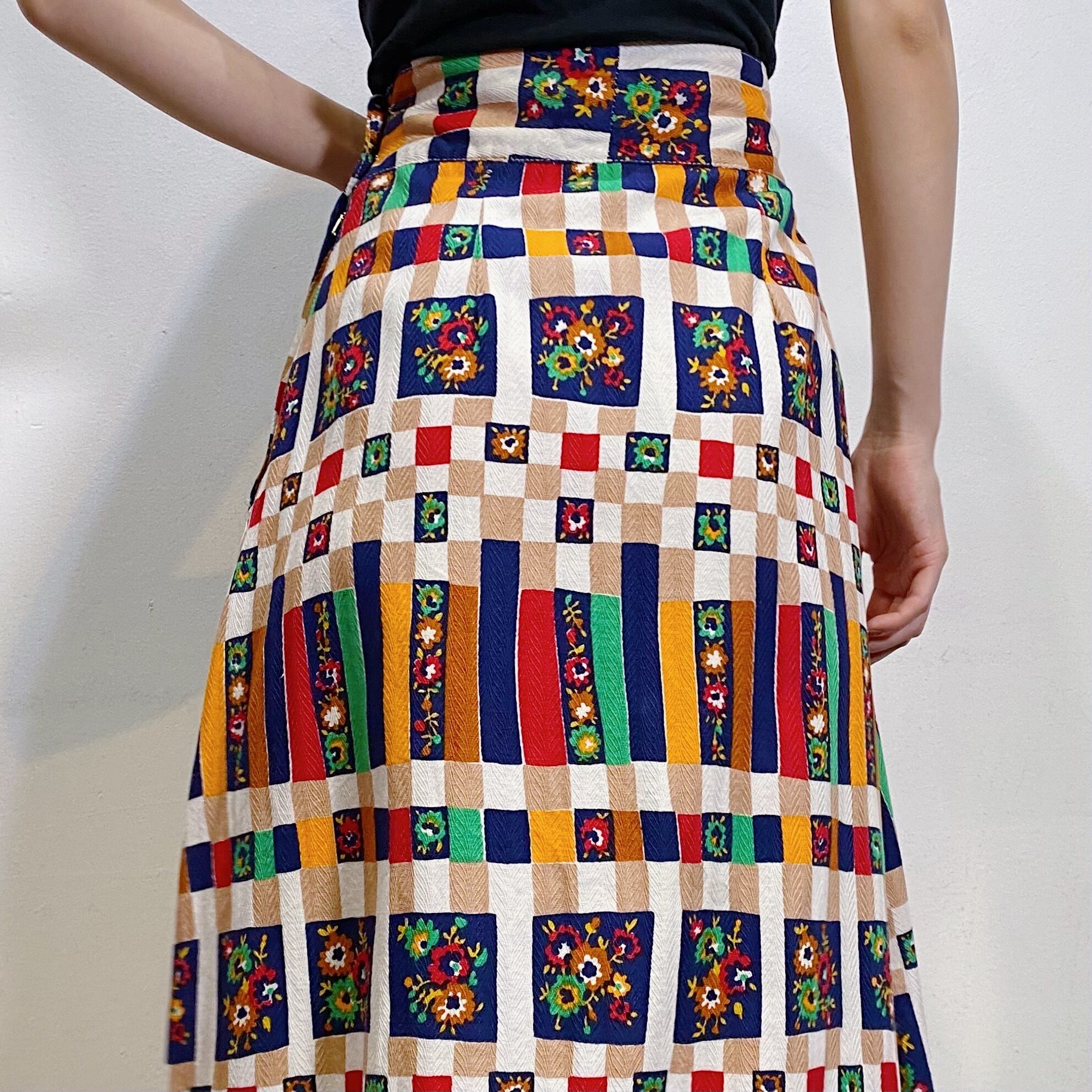 赤や黄、緑などの色合わせが可愛い、70年代の花柄スカートです。