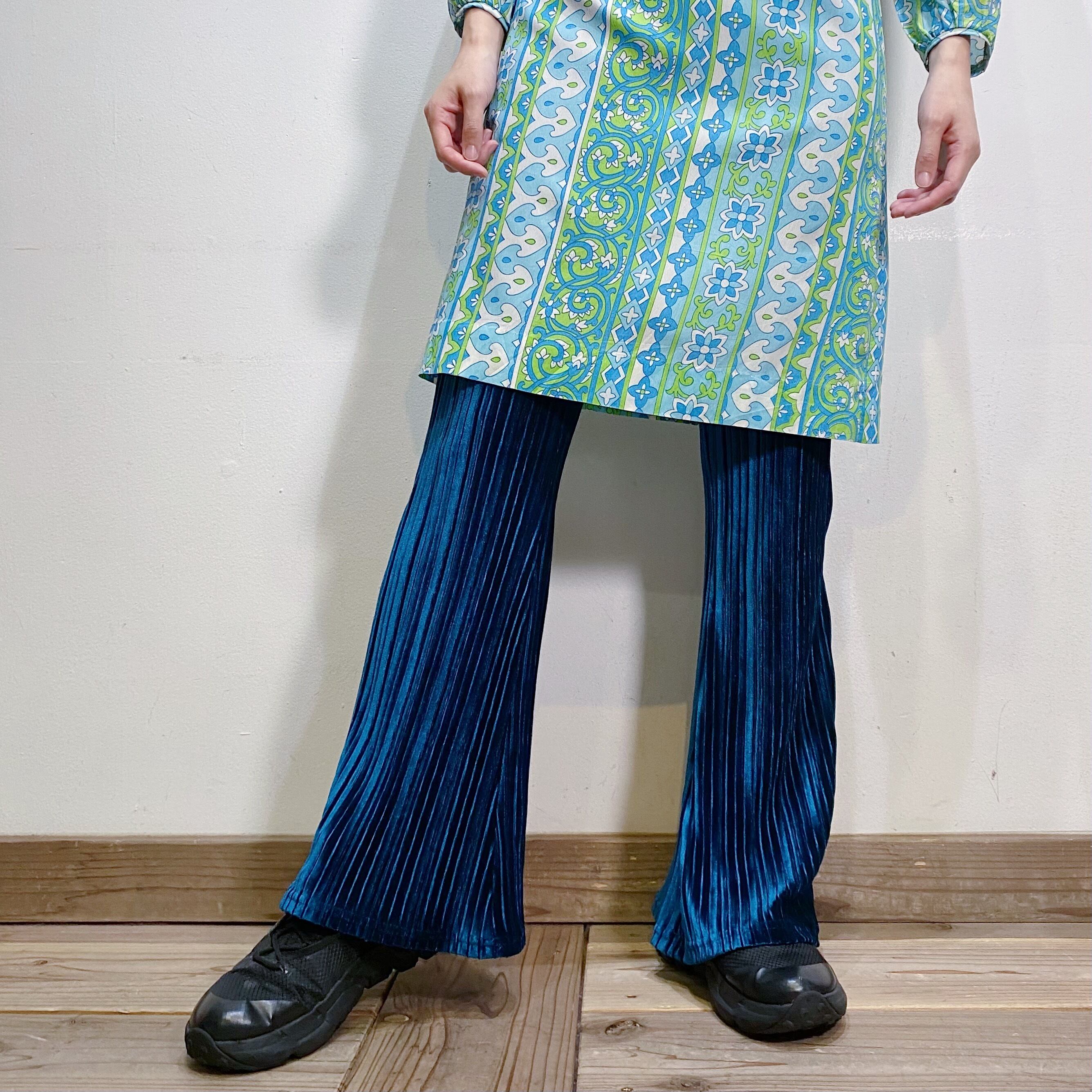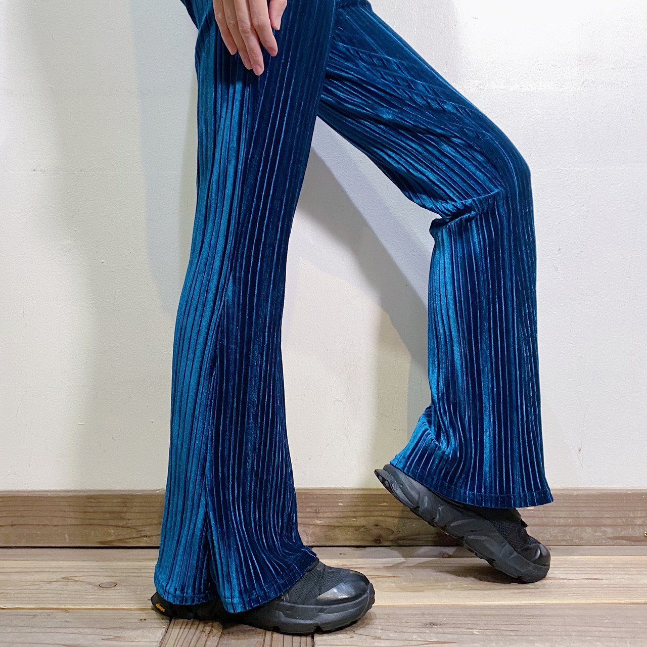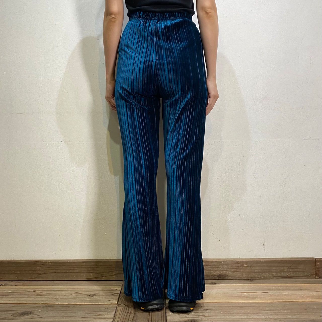 グリーンとブルーの中間のような絶妙なカラーが可愛い、フレアパンツです。