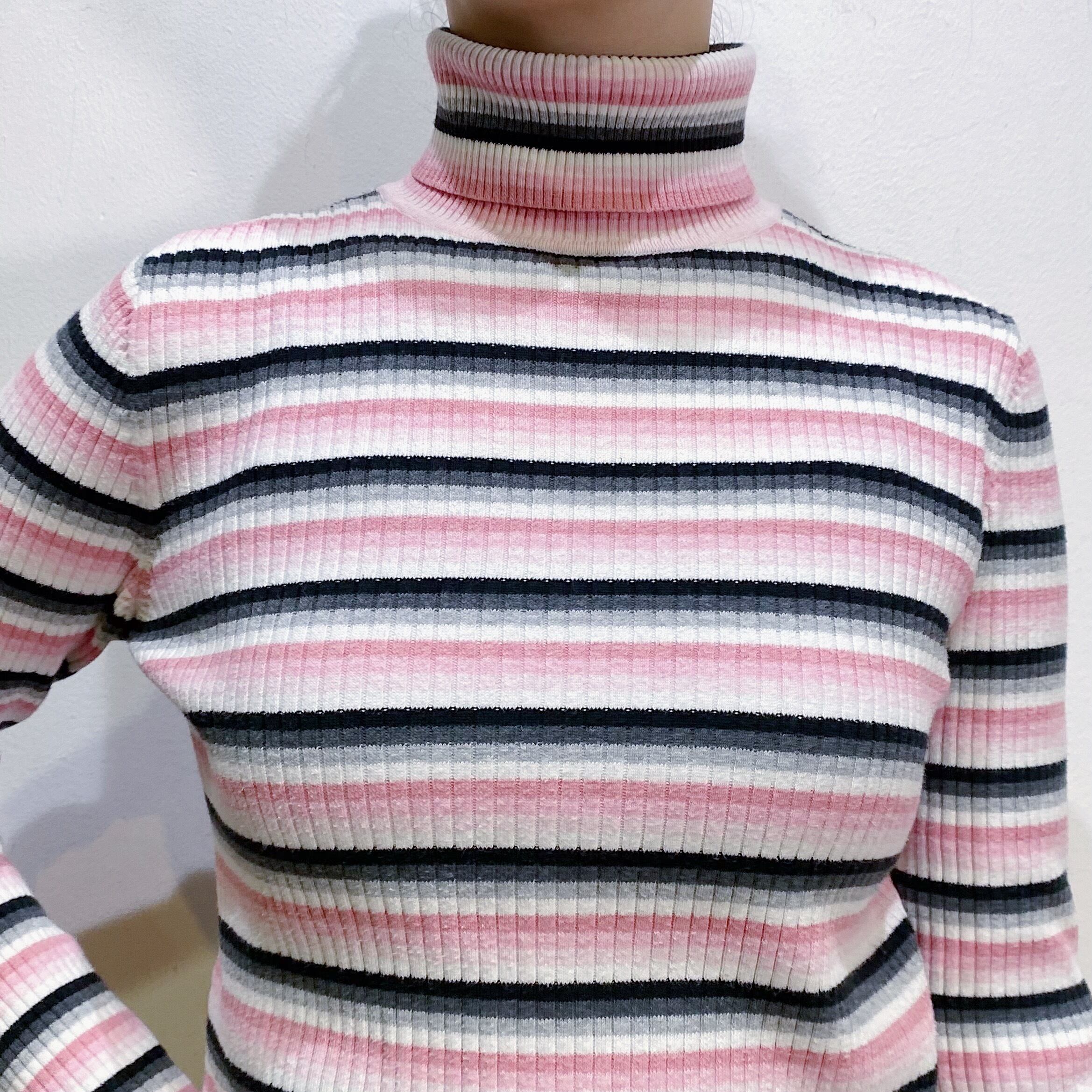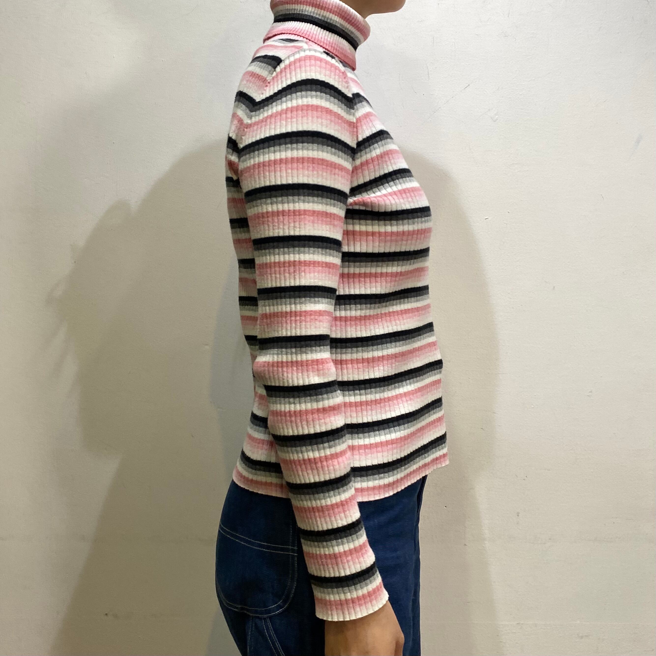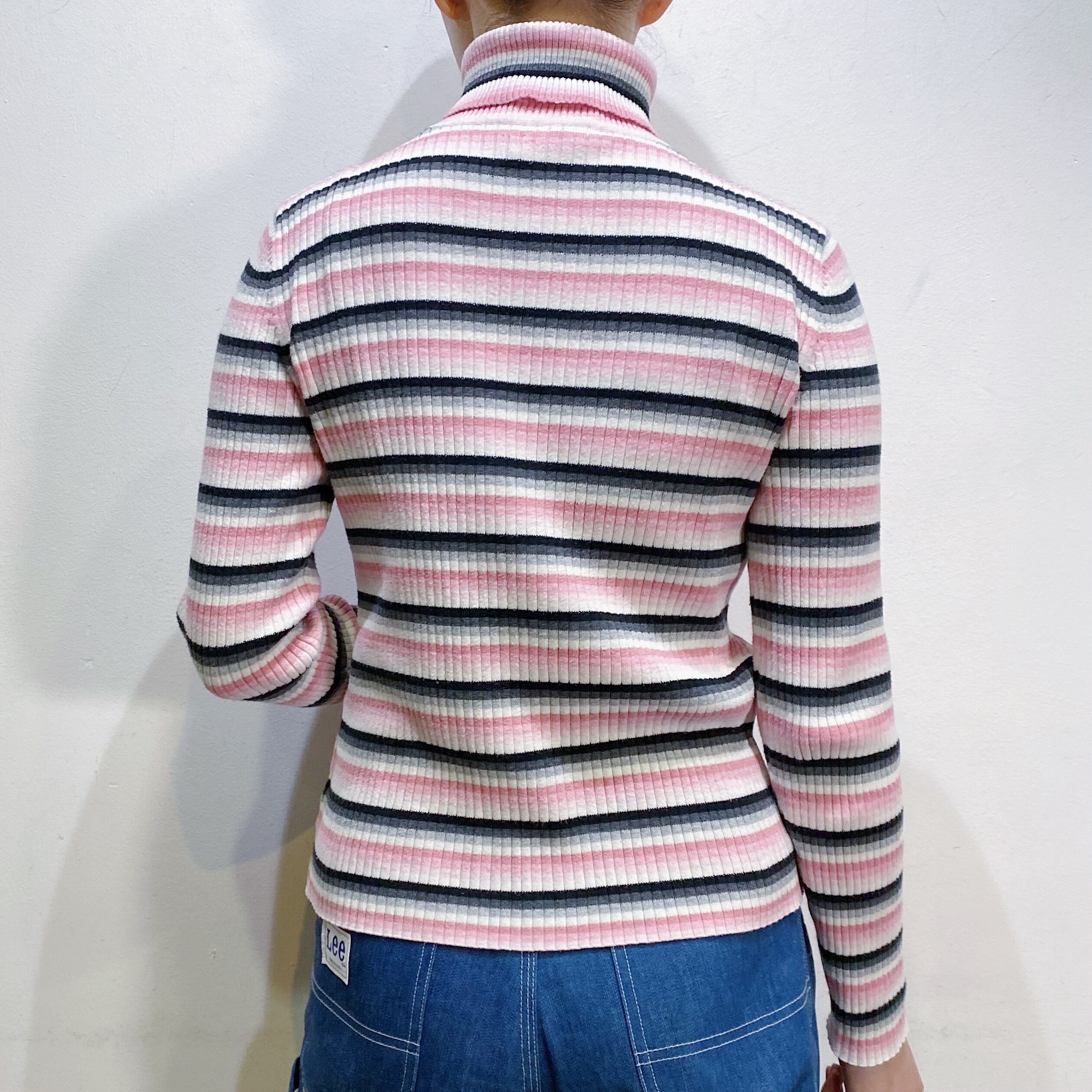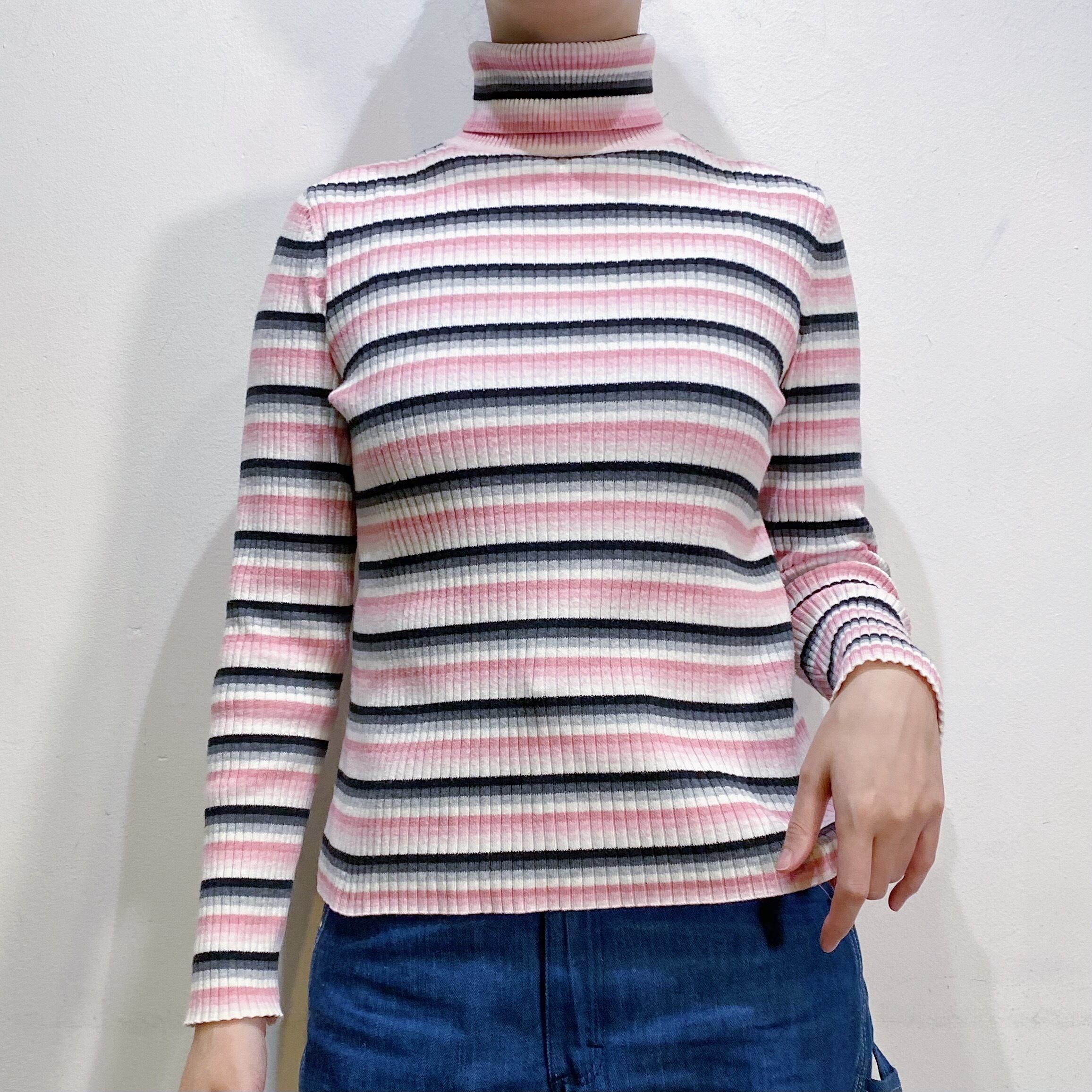 ピンクやブラックなどの色合わせが可愛い、ストライプのハイネックトップです。