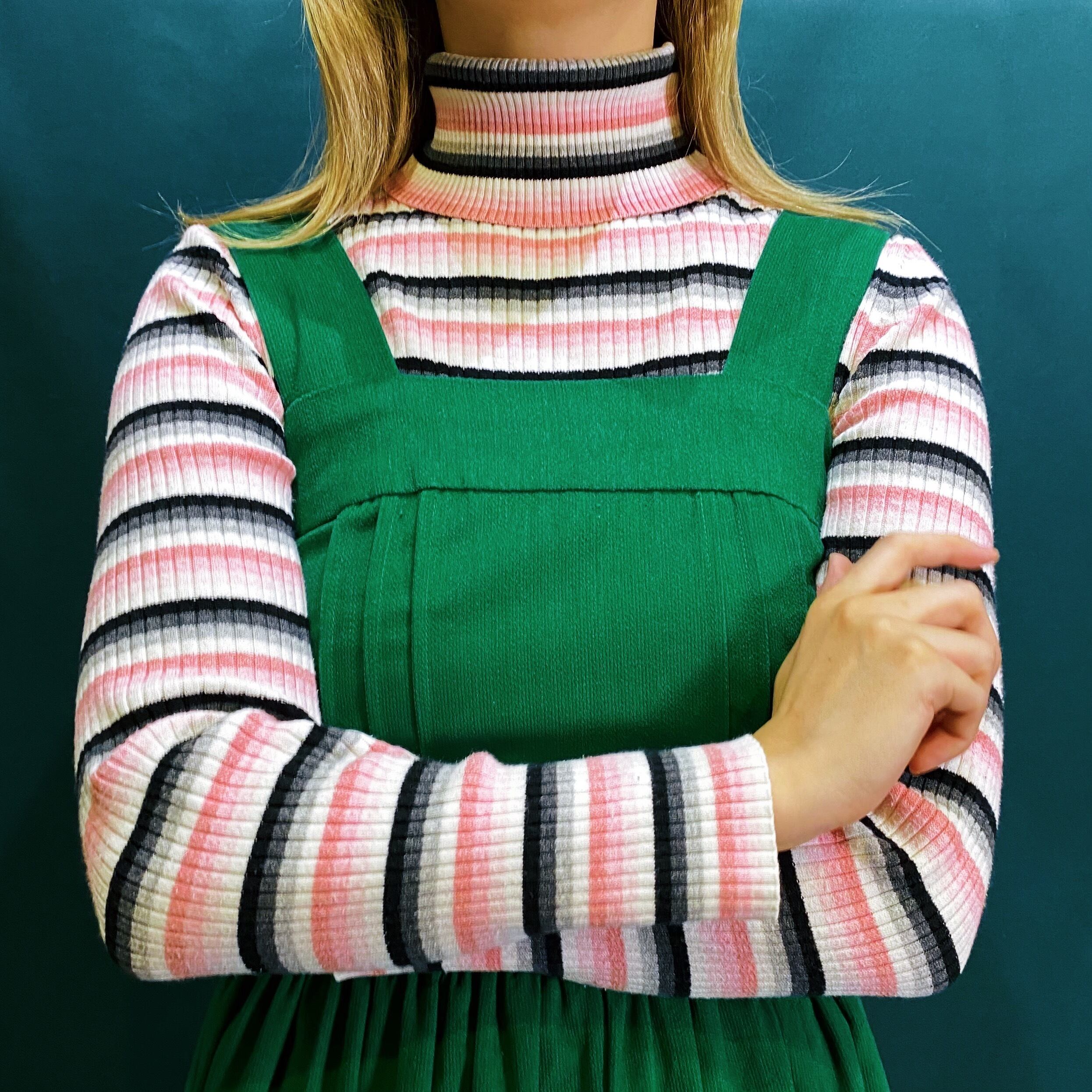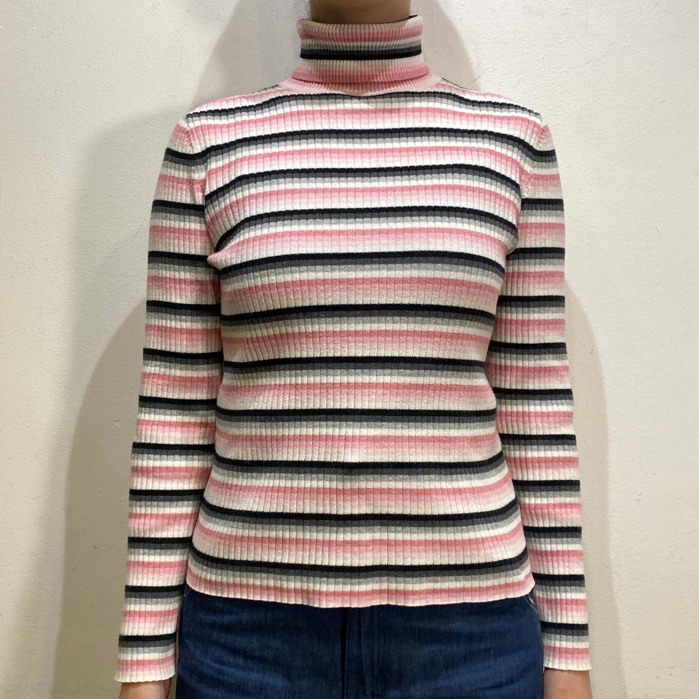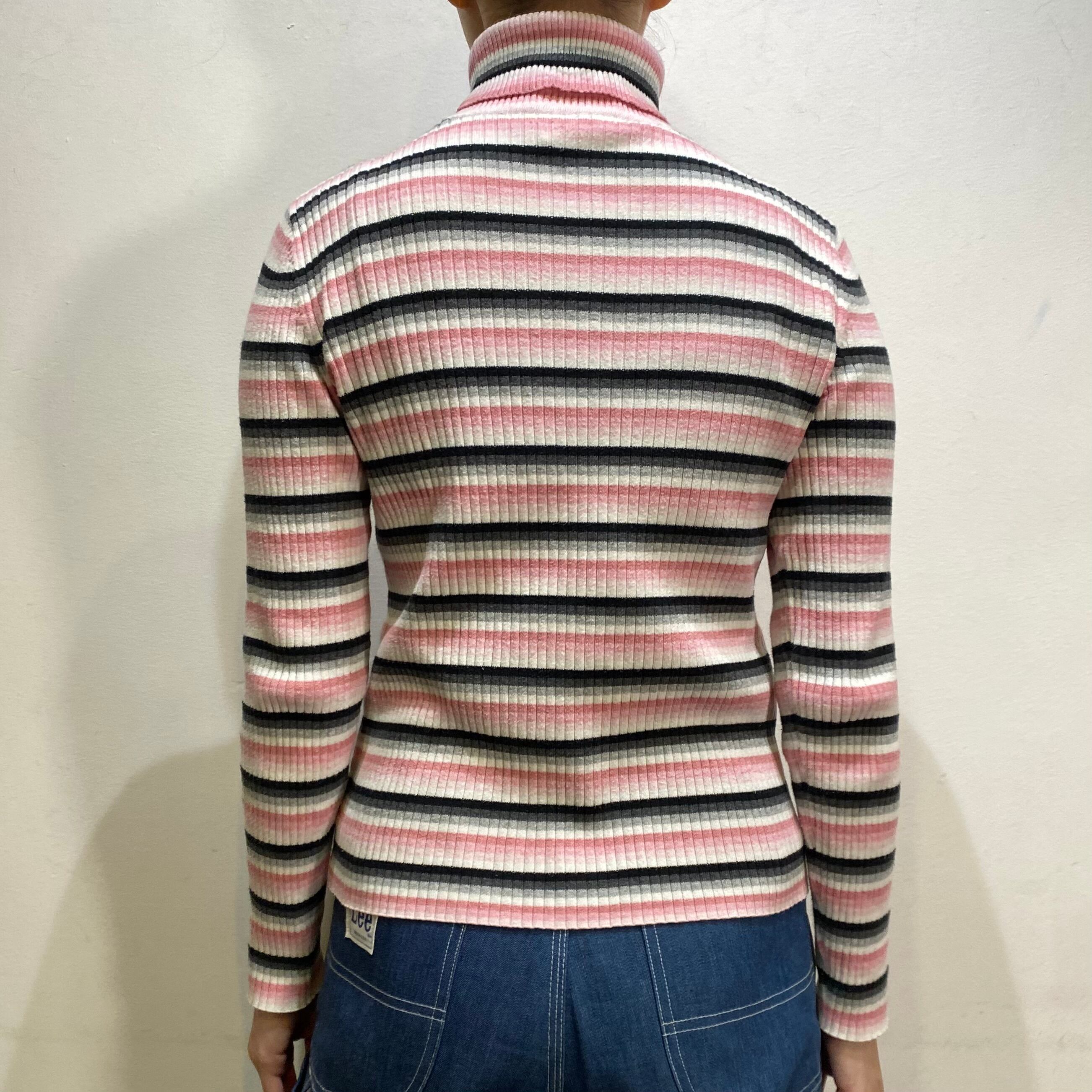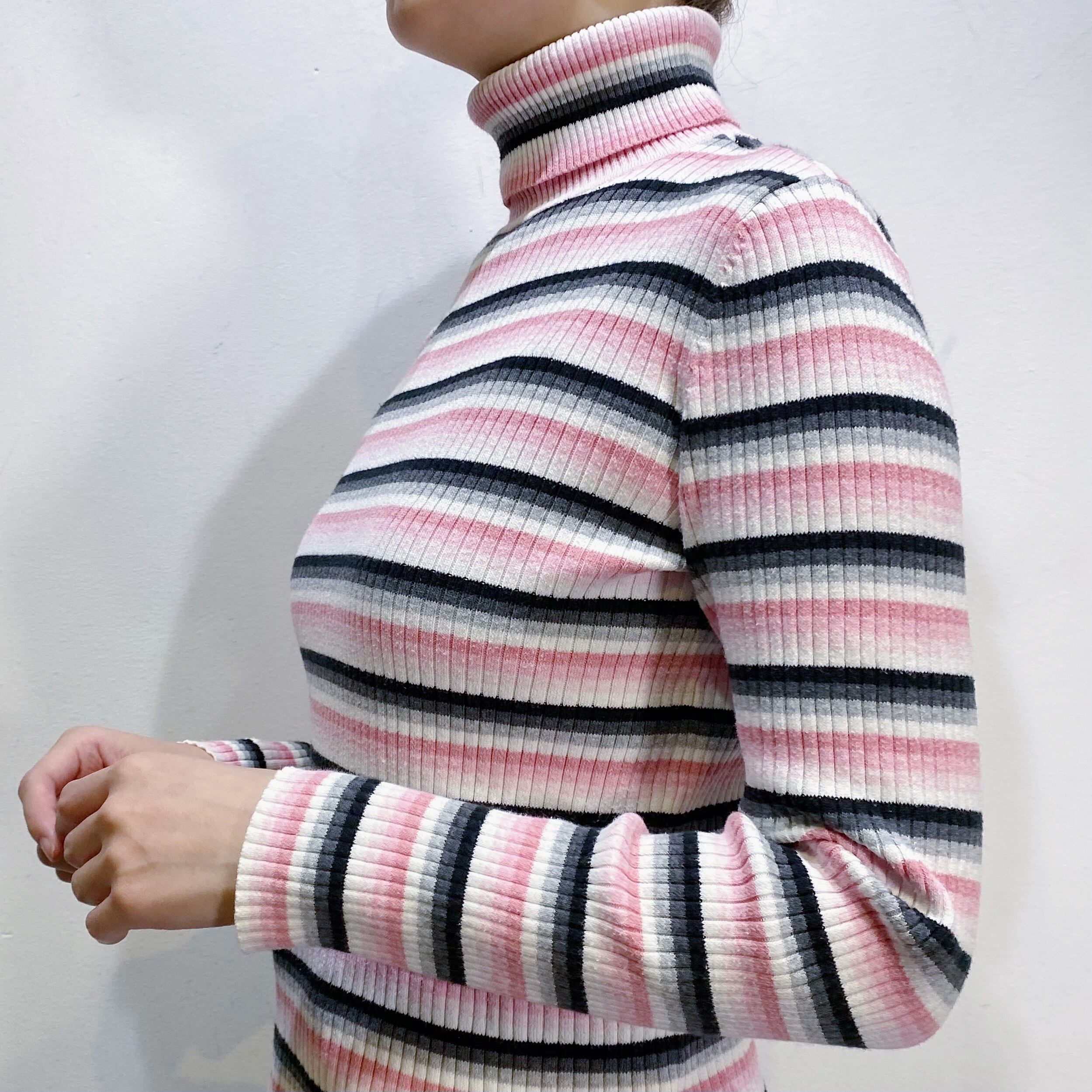 ピンクやブラックなどの色合わせが可愛い、ストライプのハイネックトップです。