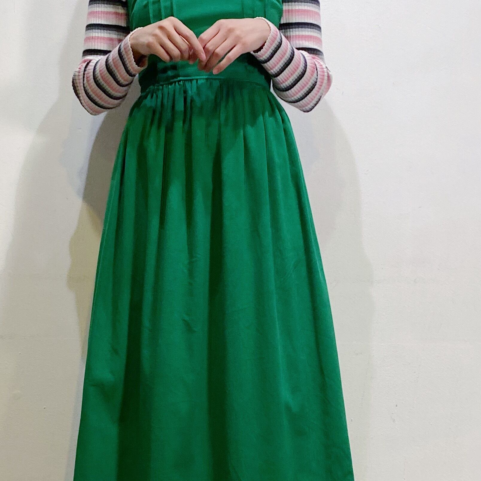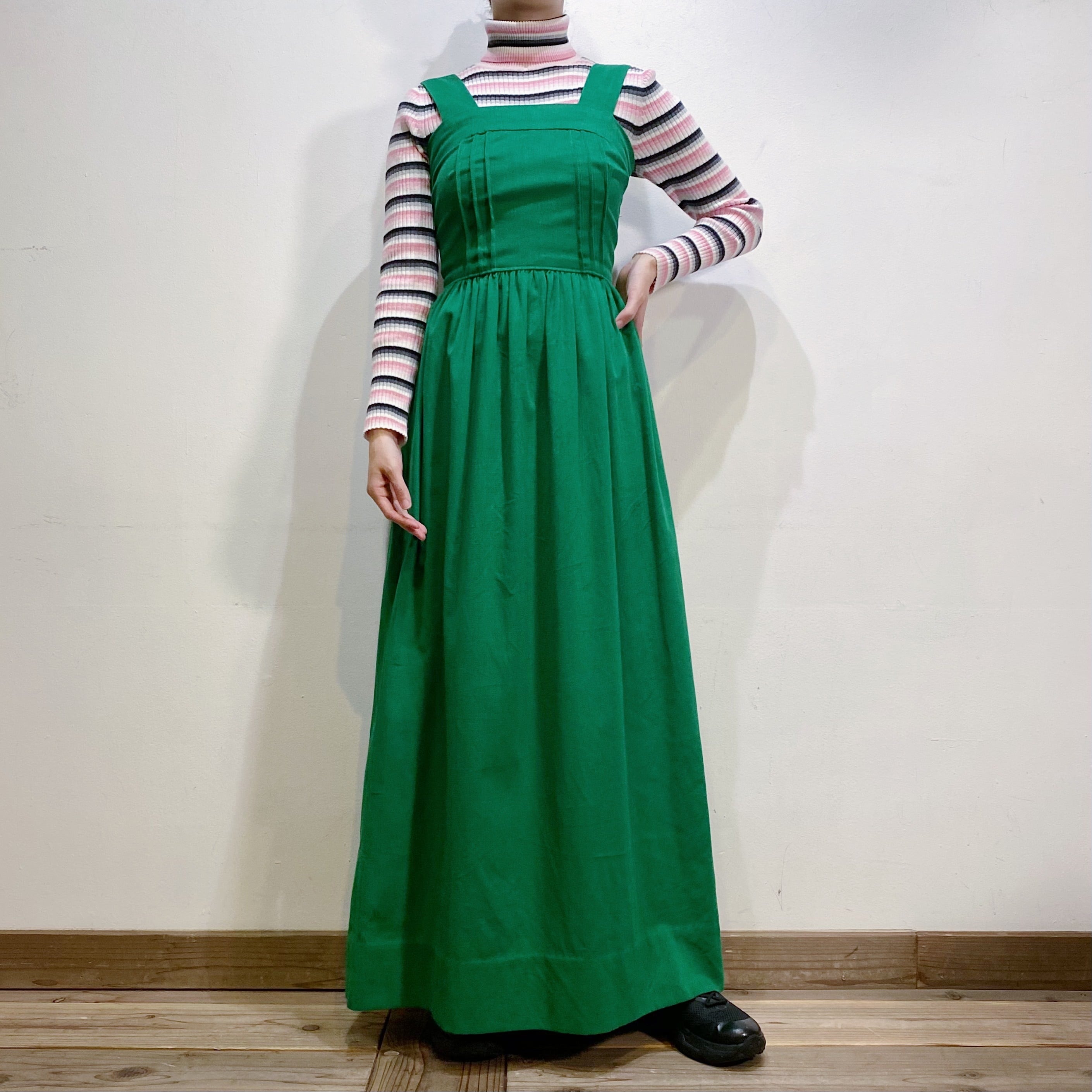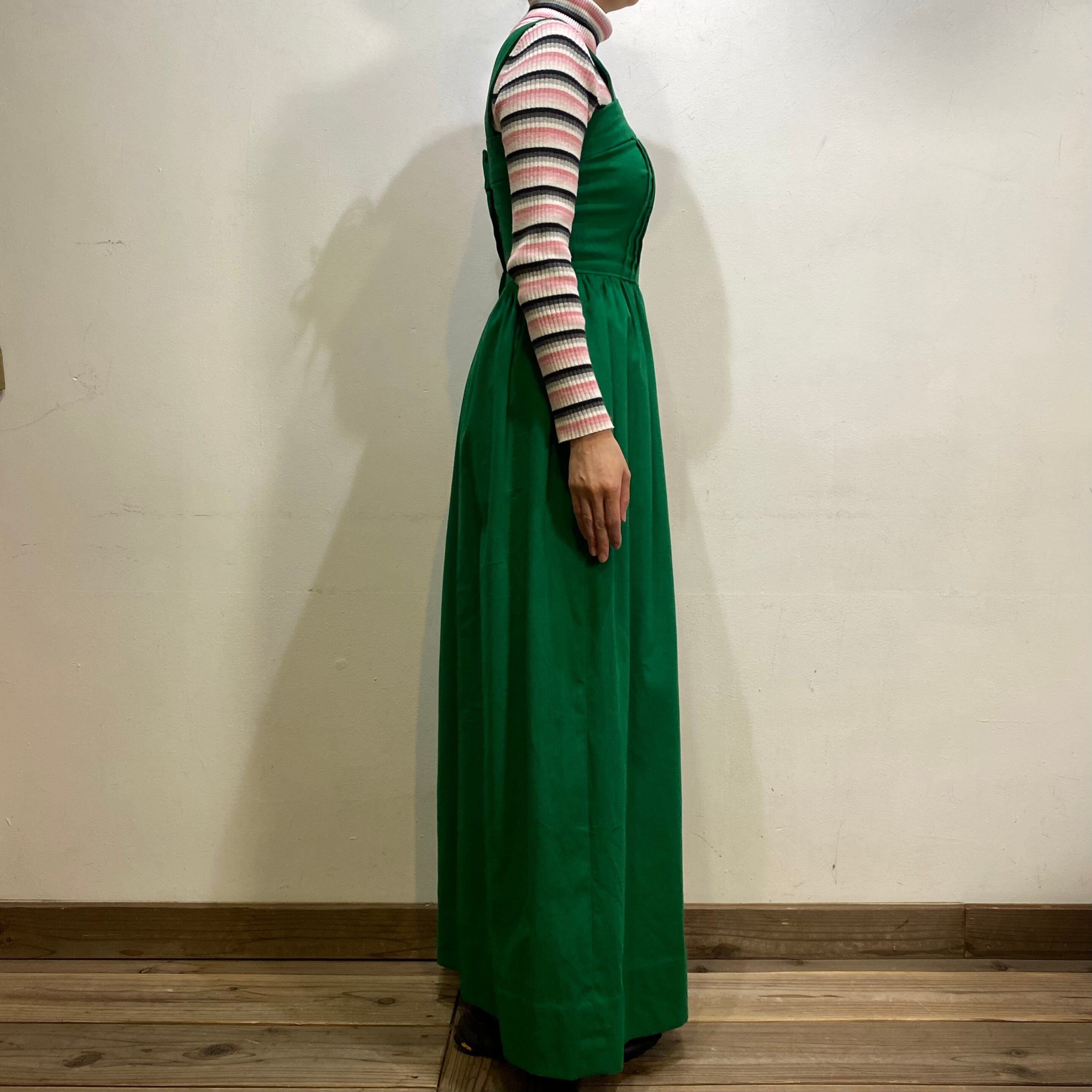 鮮やかなグリーンがパッと目を惹く、70年代のジャンパーワンピースです。