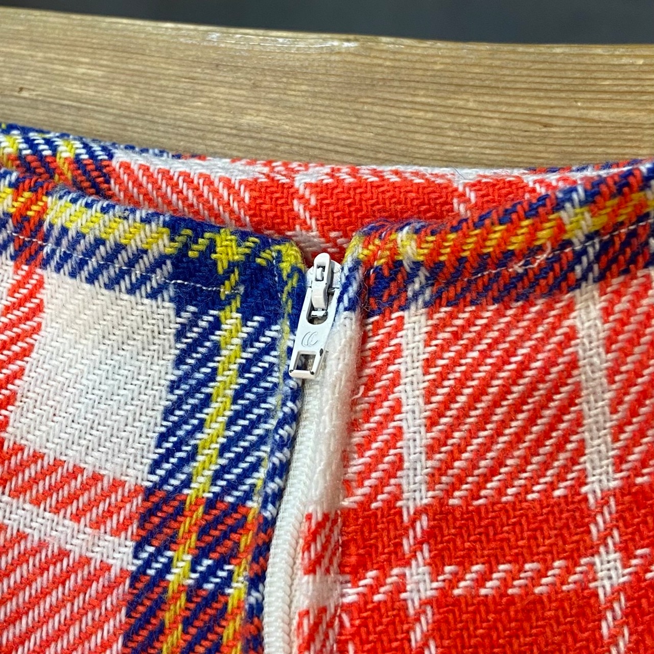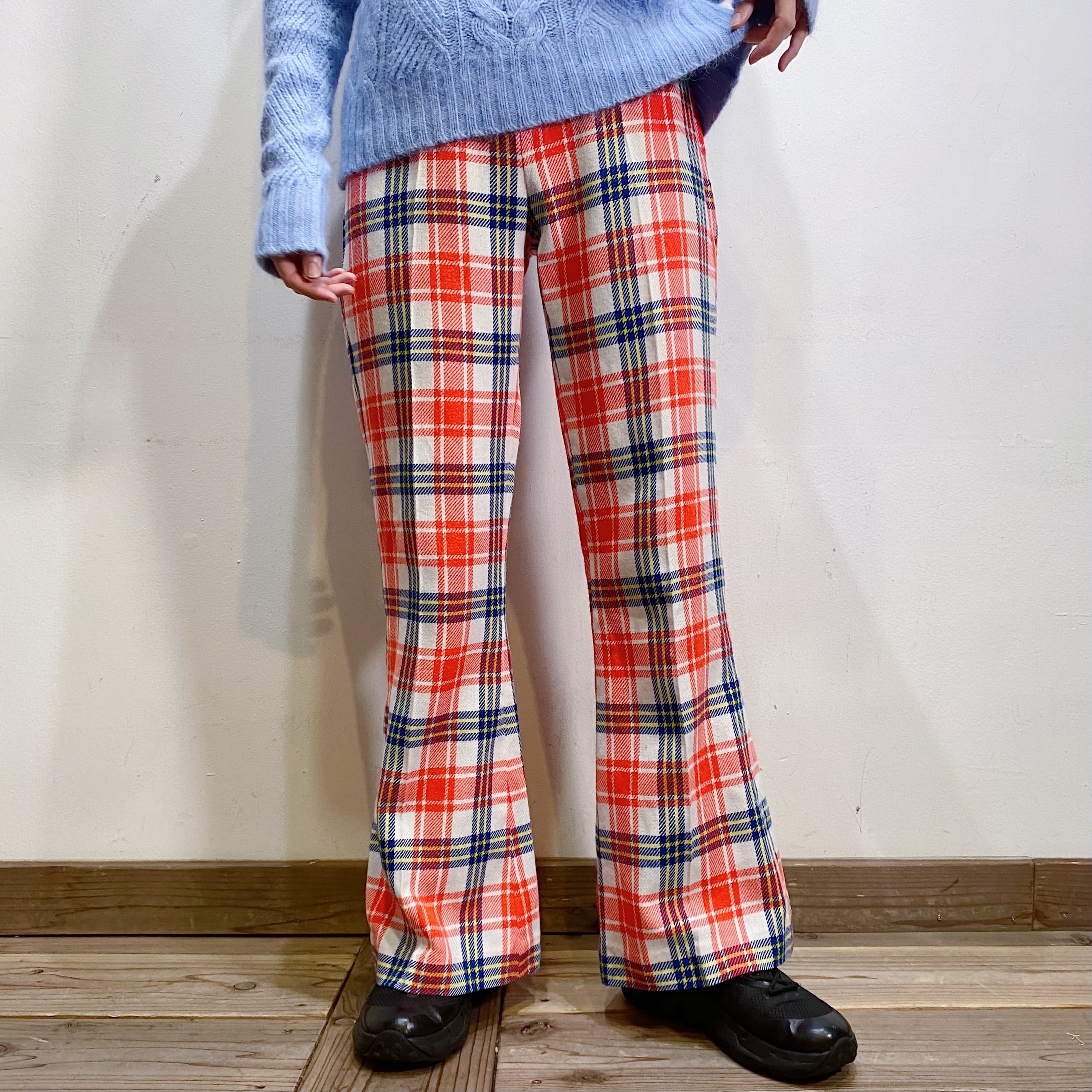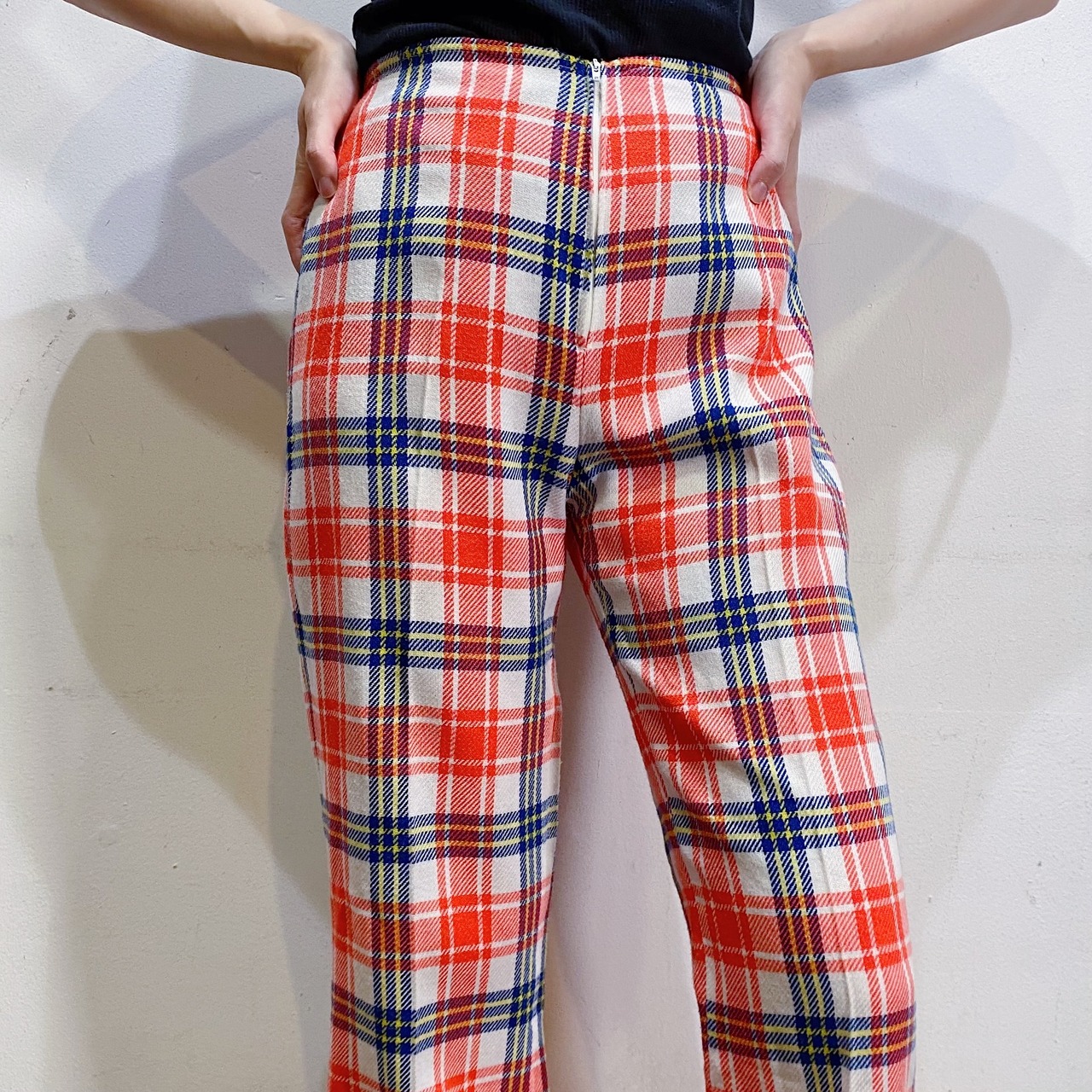 赤や白、青などの色合いが可愛い、70年代のチェックパンツです。