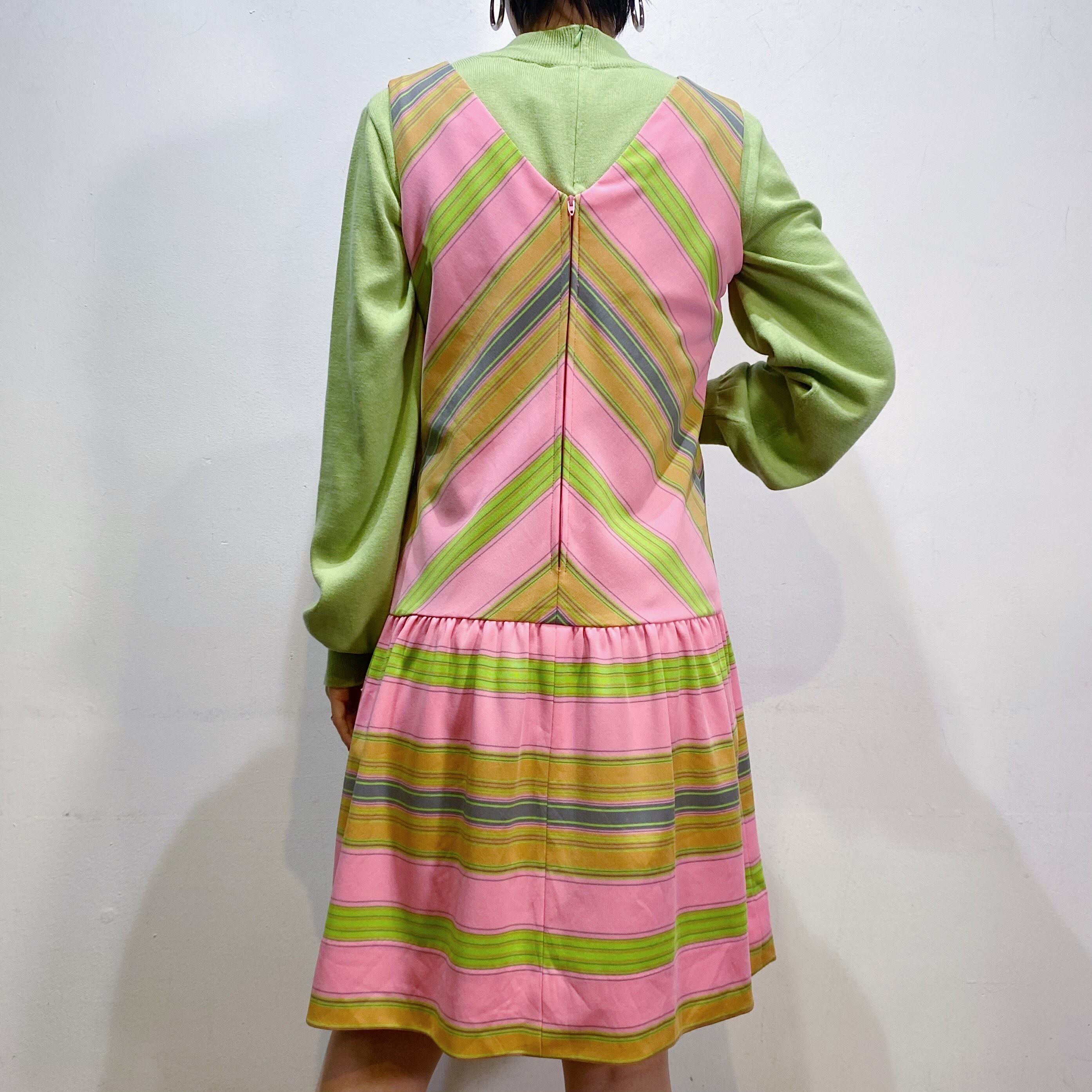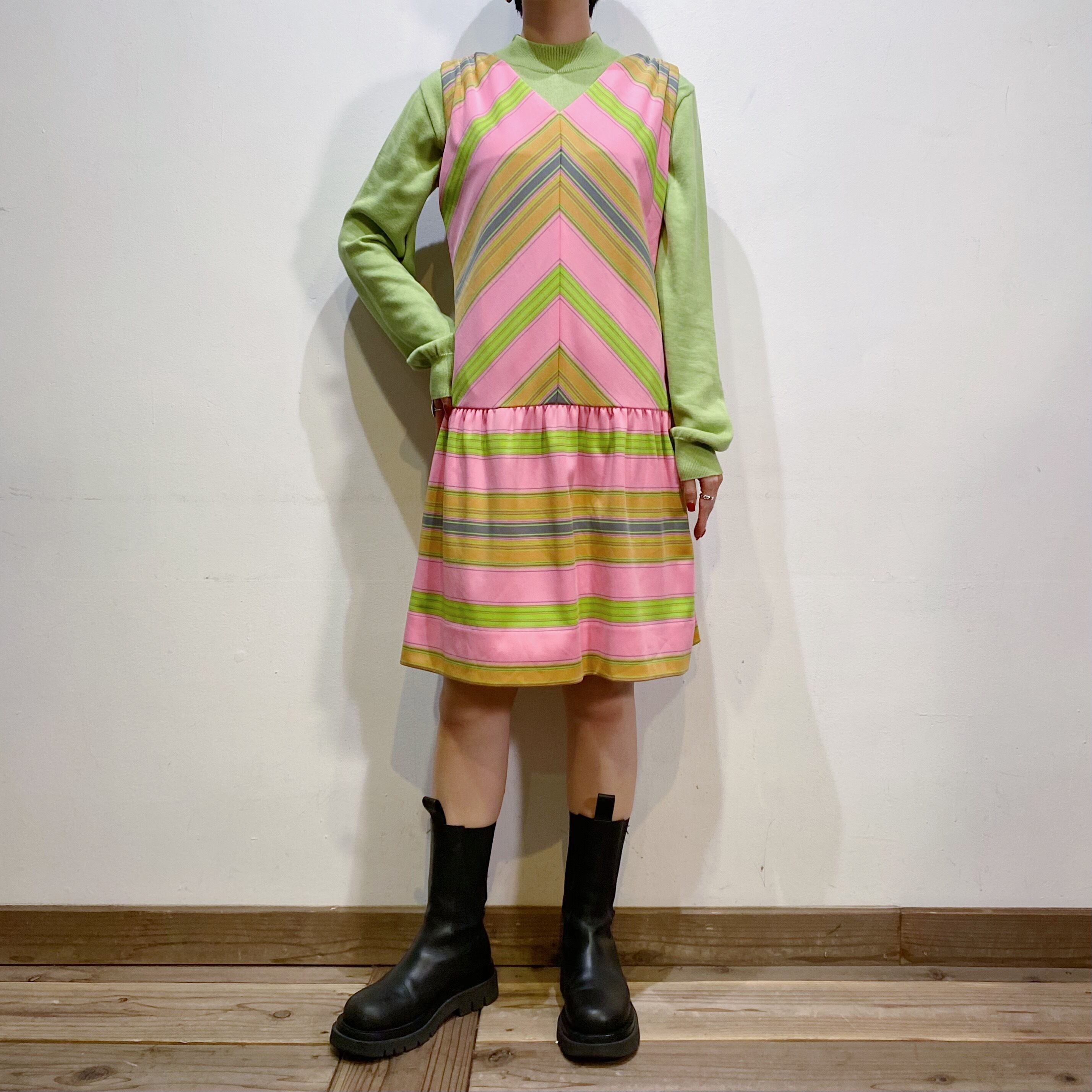 ピンクやグリーンなどのストライプの色合わせが可愛い、70年代のノースリーブワンピースです。