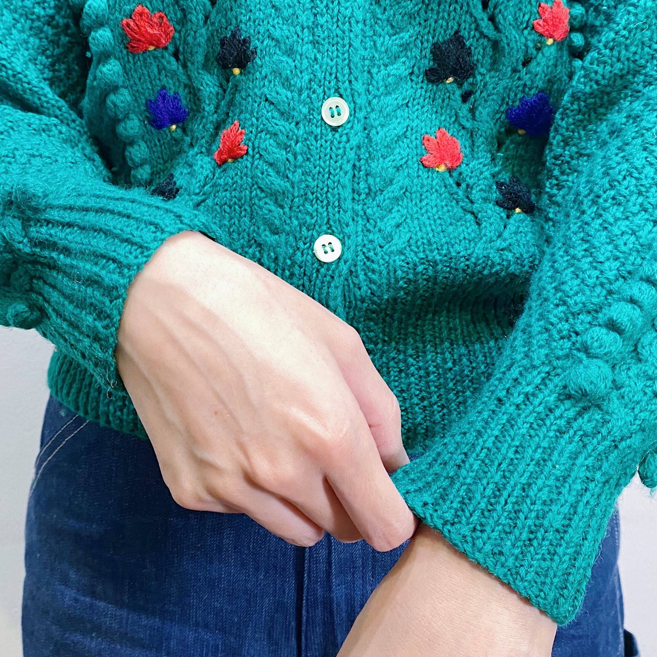 お花モチーフのアクセントがとっても可愛い、チロルニットカーディガンです。
