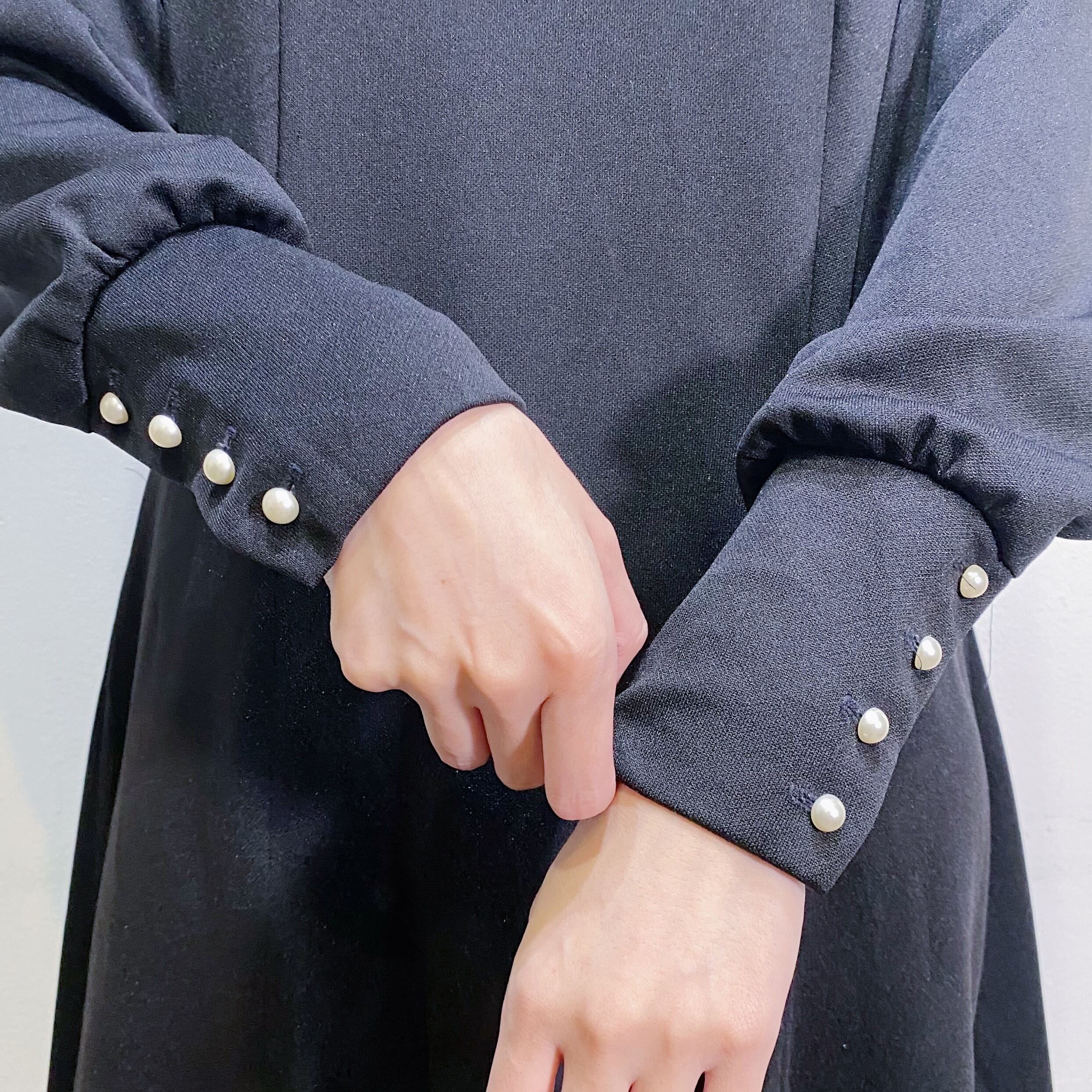 無地でシンプルながら、カフスにはパールボタンが並んでいたり、裾のフレア具合がステキな一枚。