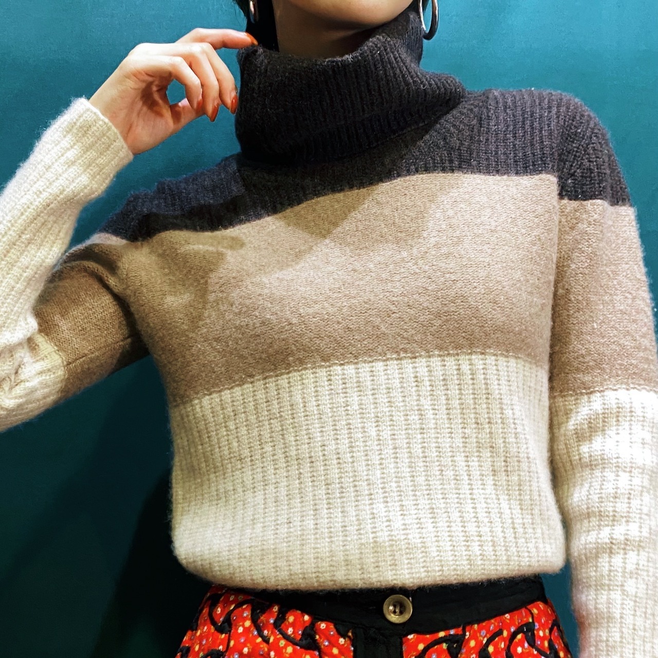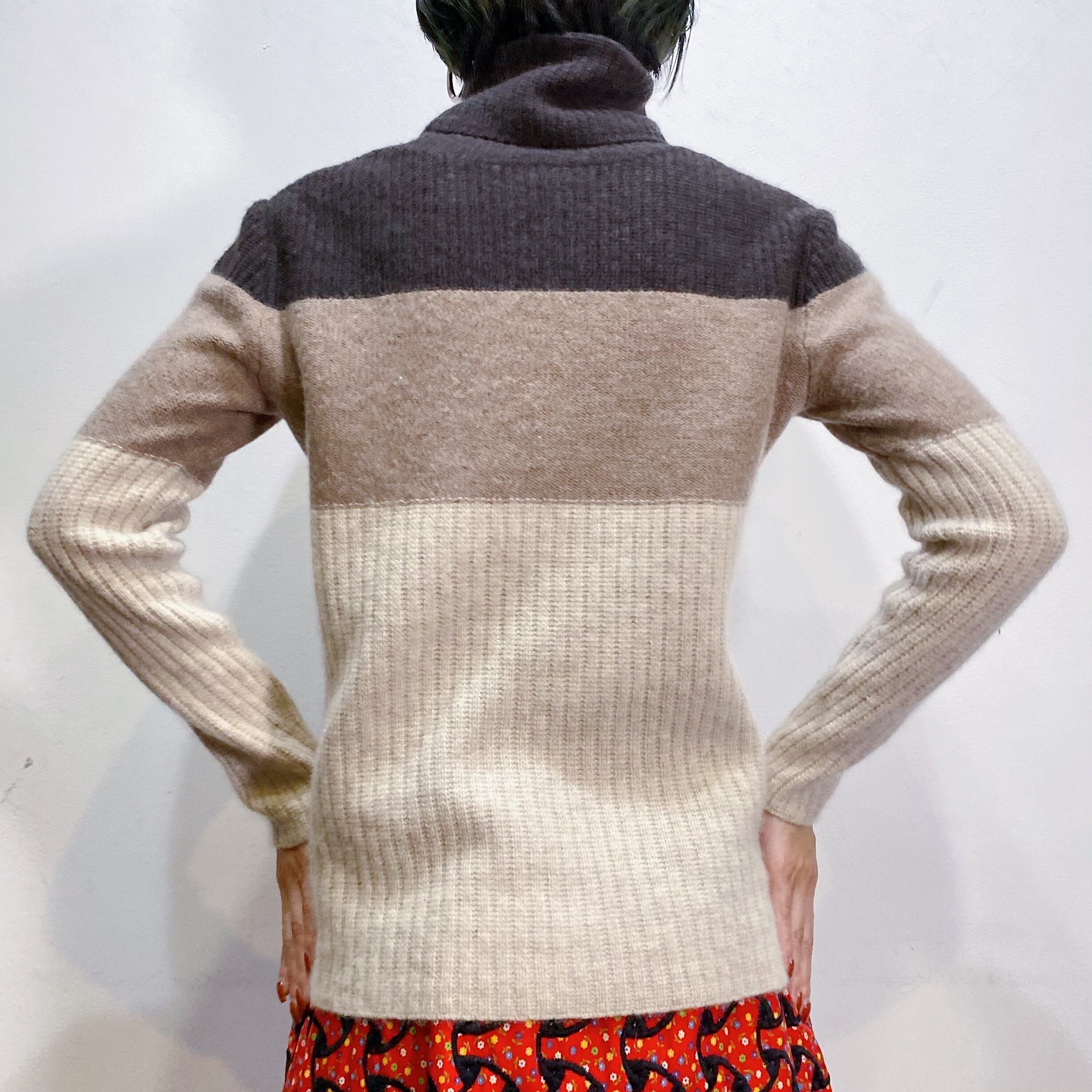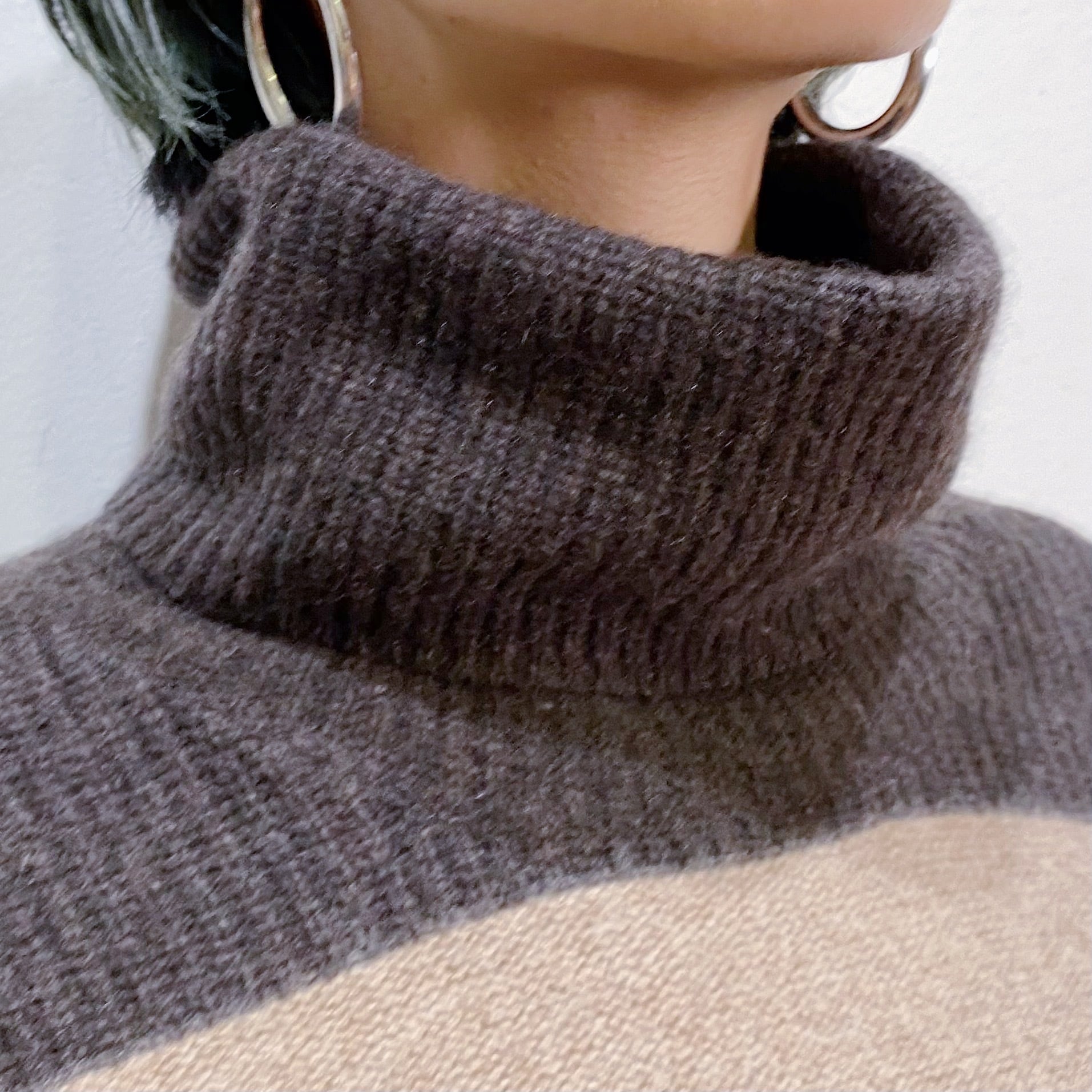 少し肉厚の生地に大きなタートルネックデザインで、首回りもしっかりと暖かです。