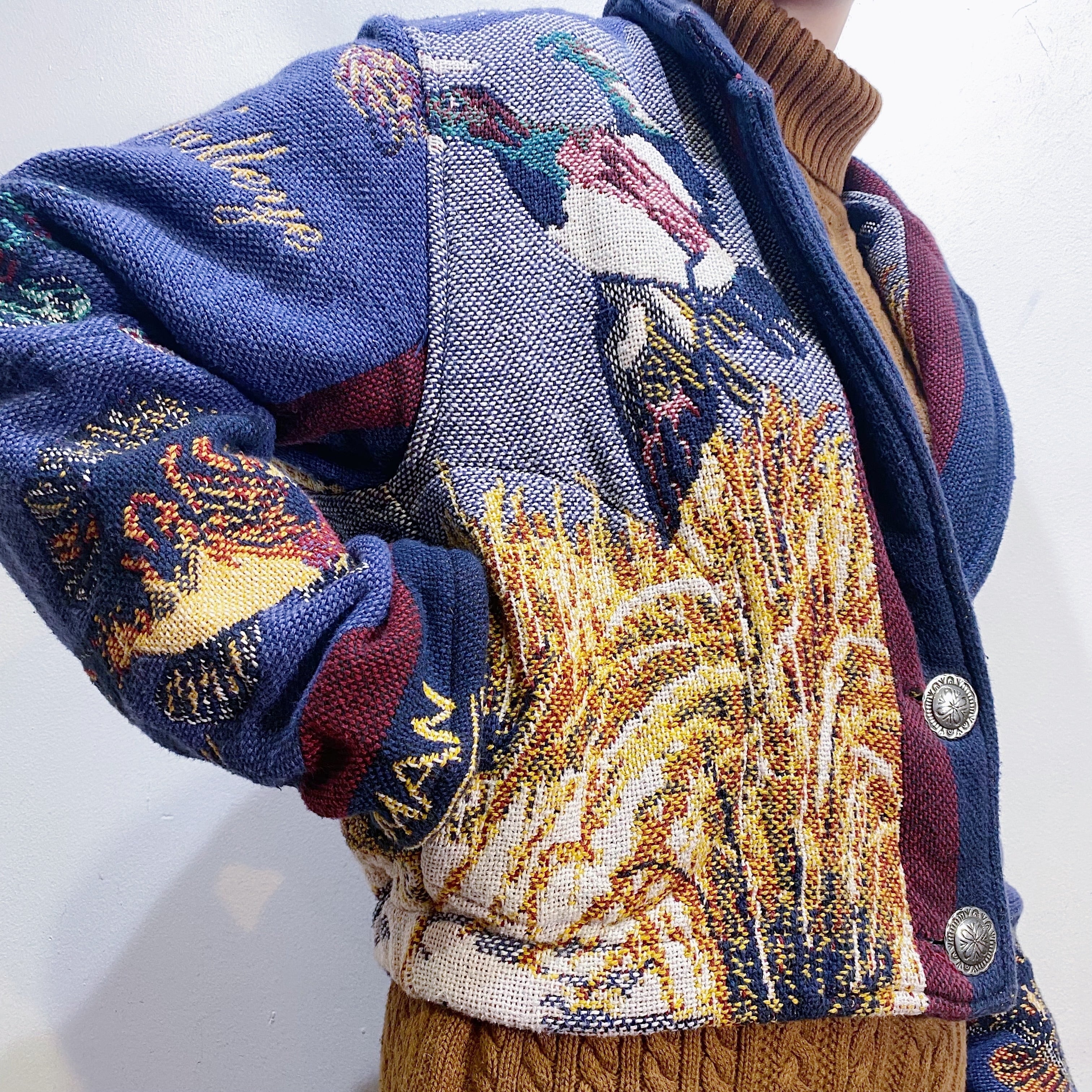 鳥や魚モチーフが織られたデザインがとても可愛いラグジャケットです。
