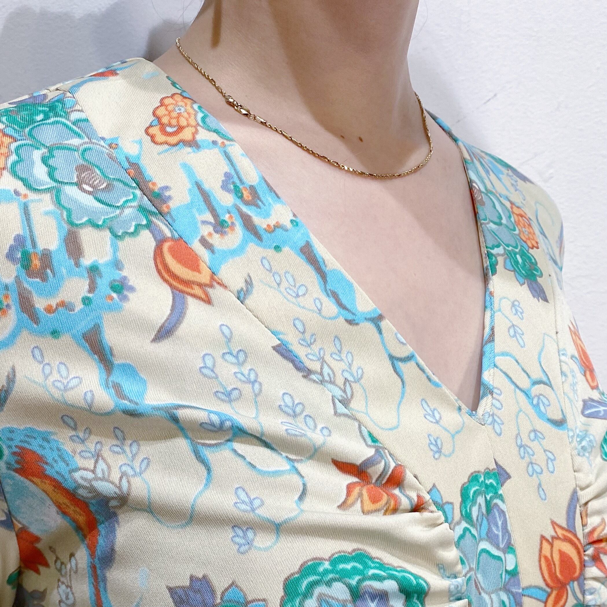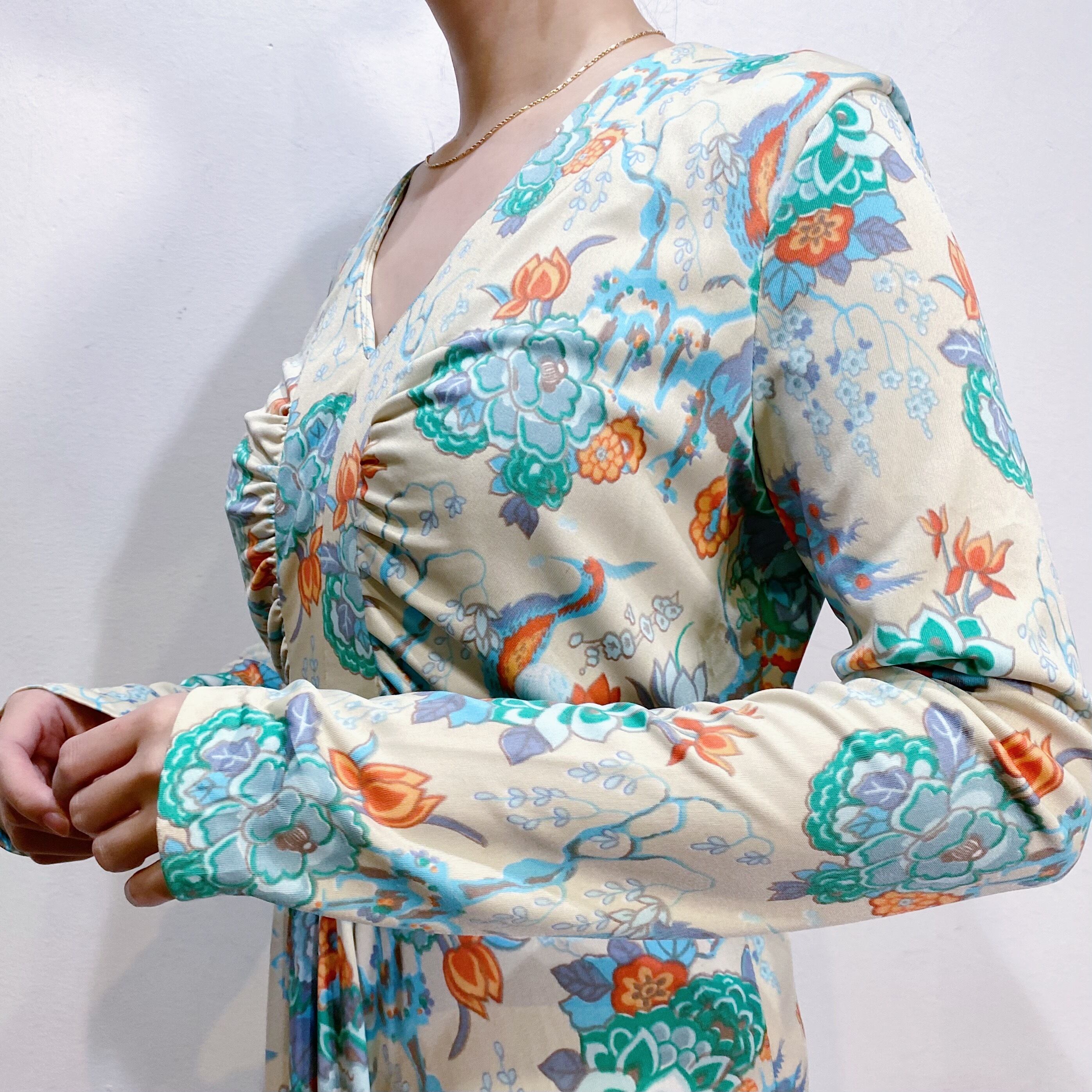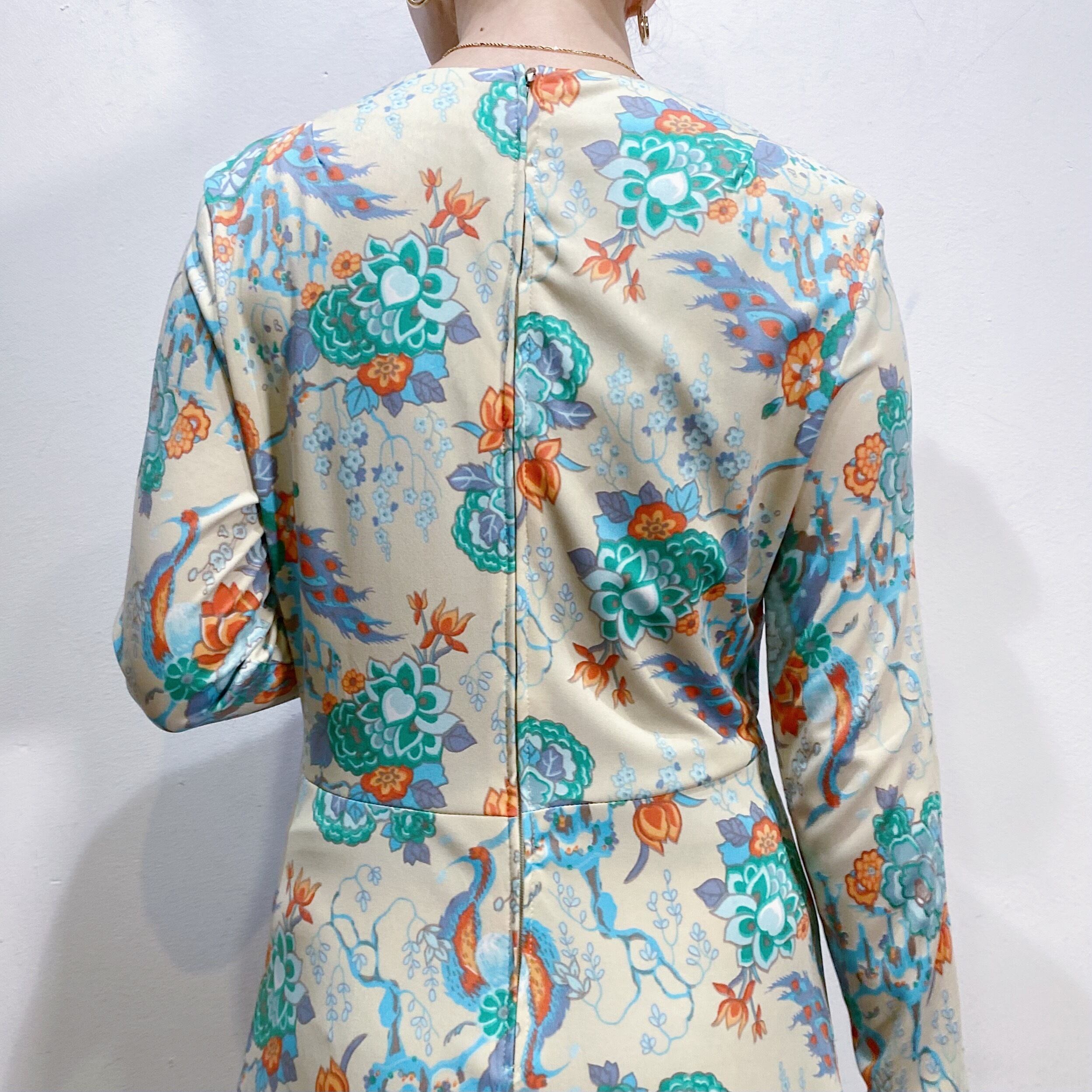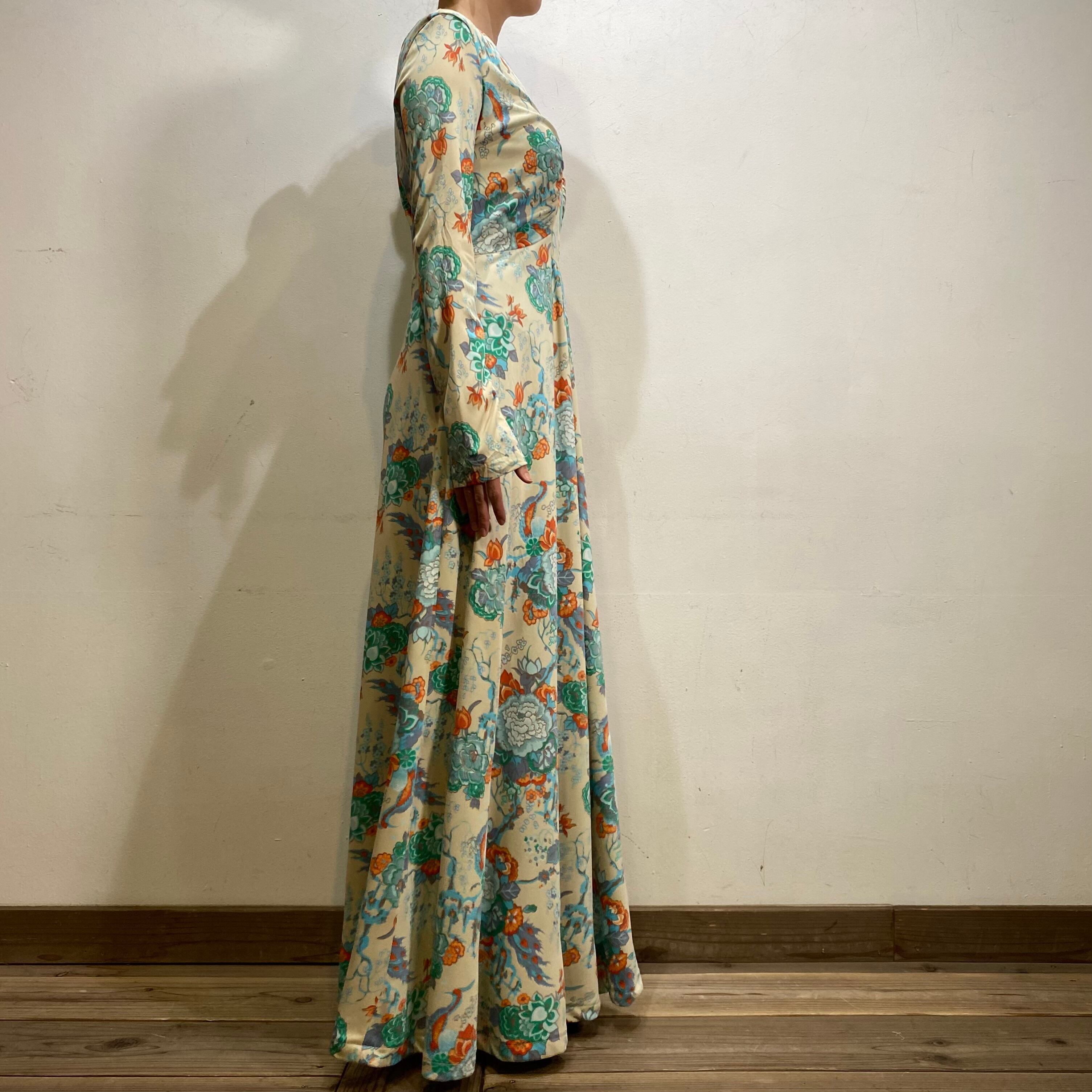 オリエンタルなムードの花柄がとても可愛い、70年代のロングワンピースです。