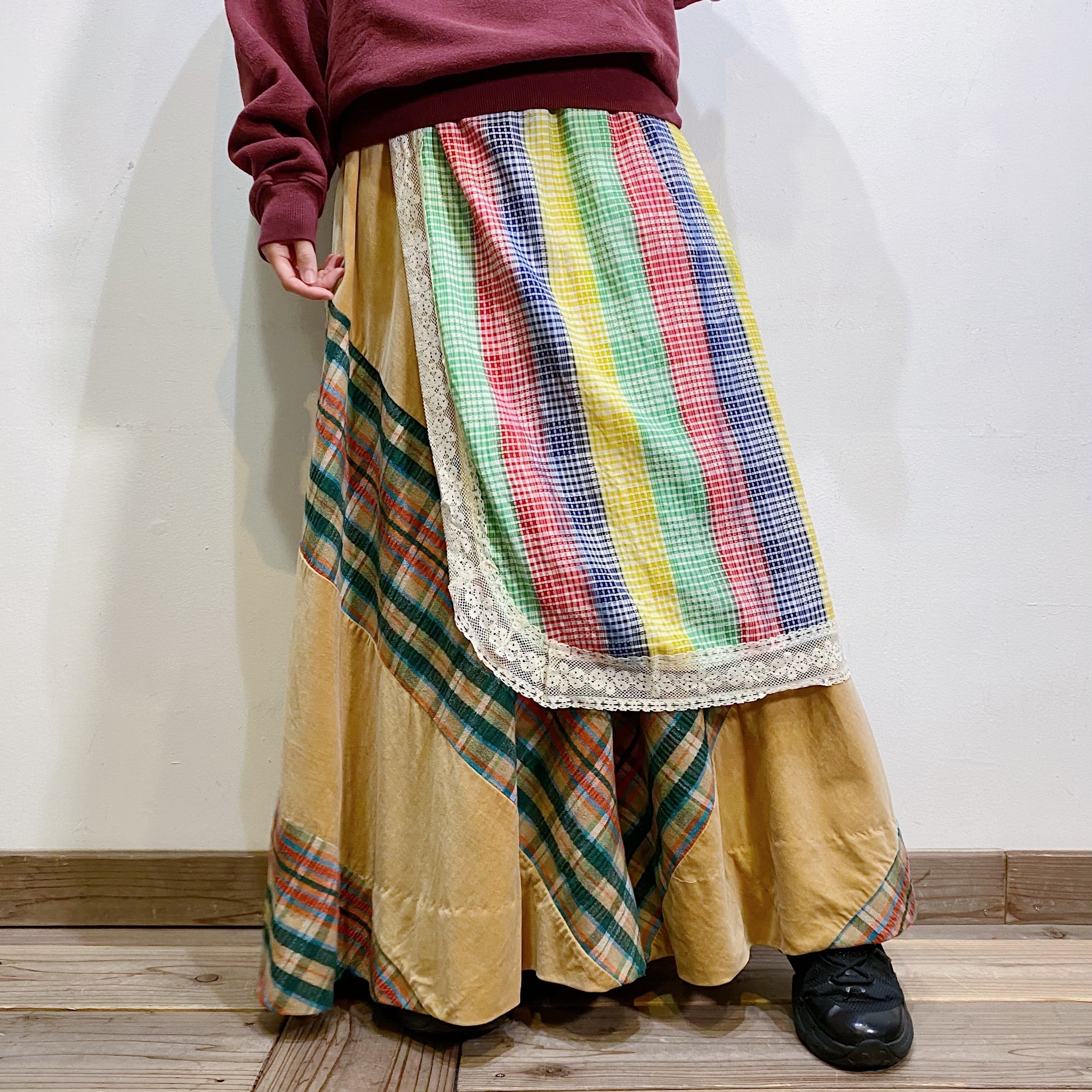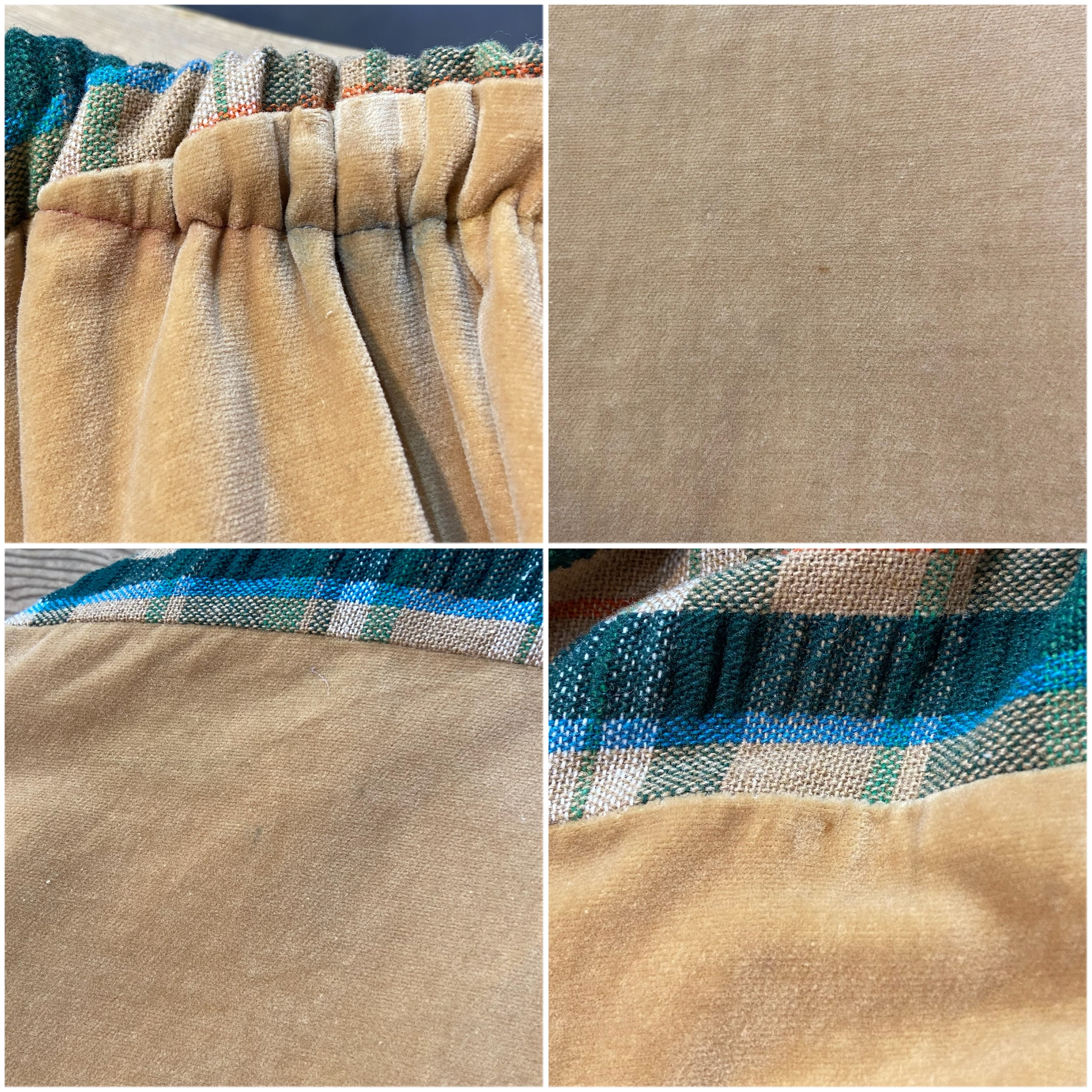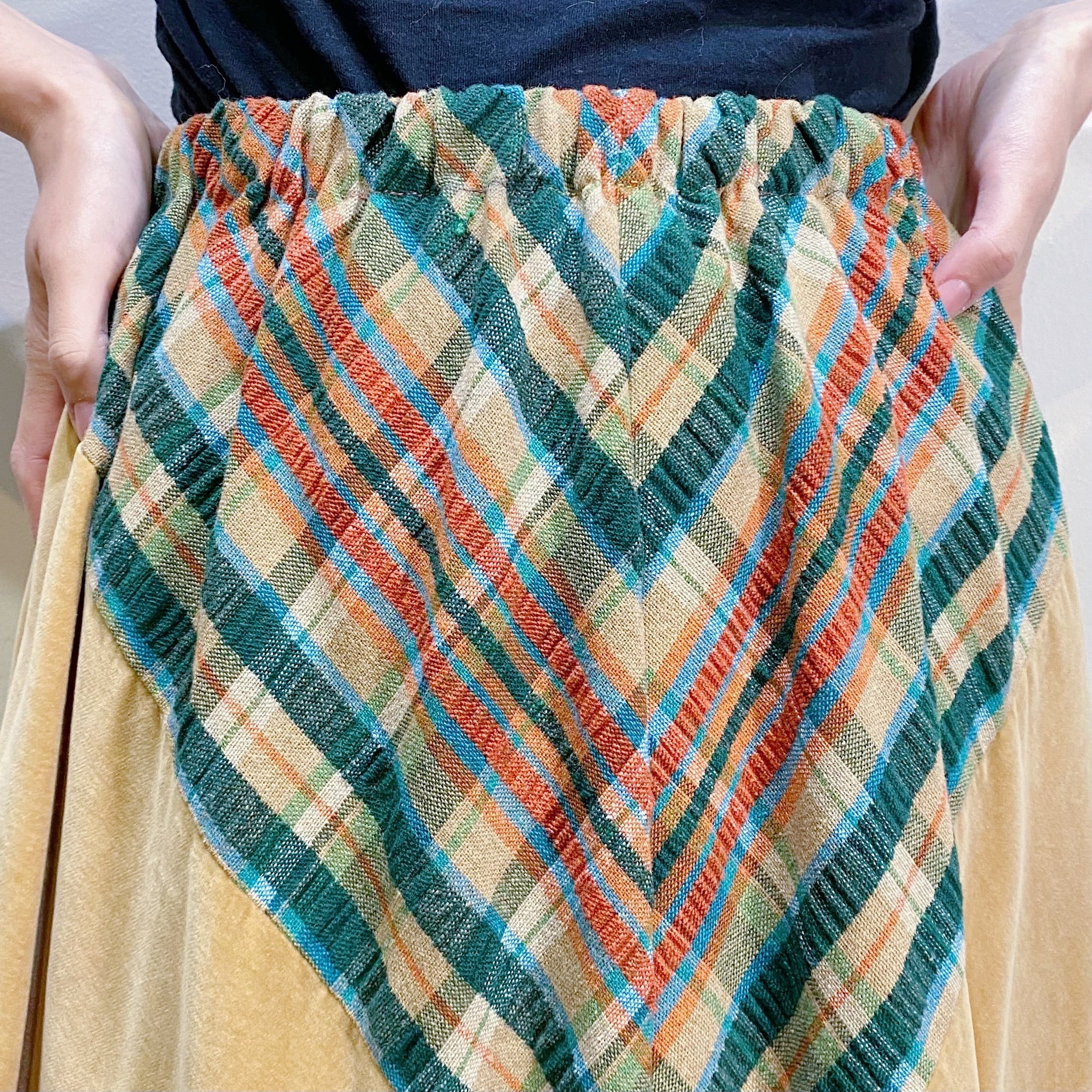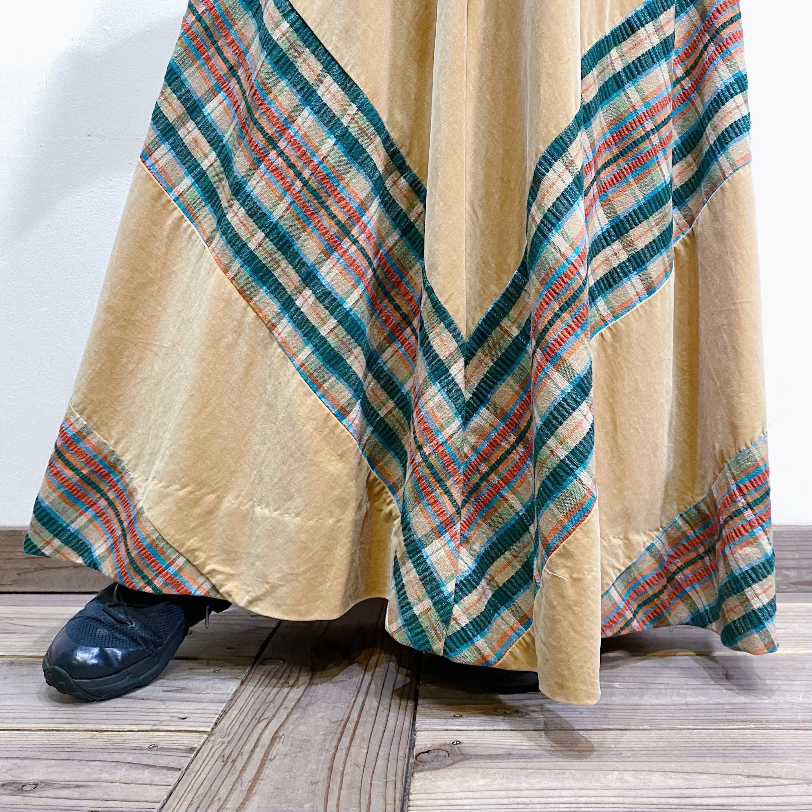 ベロア素材とチェックの切り替えデザインがとても可愛い、70年代のロングスカートです。
