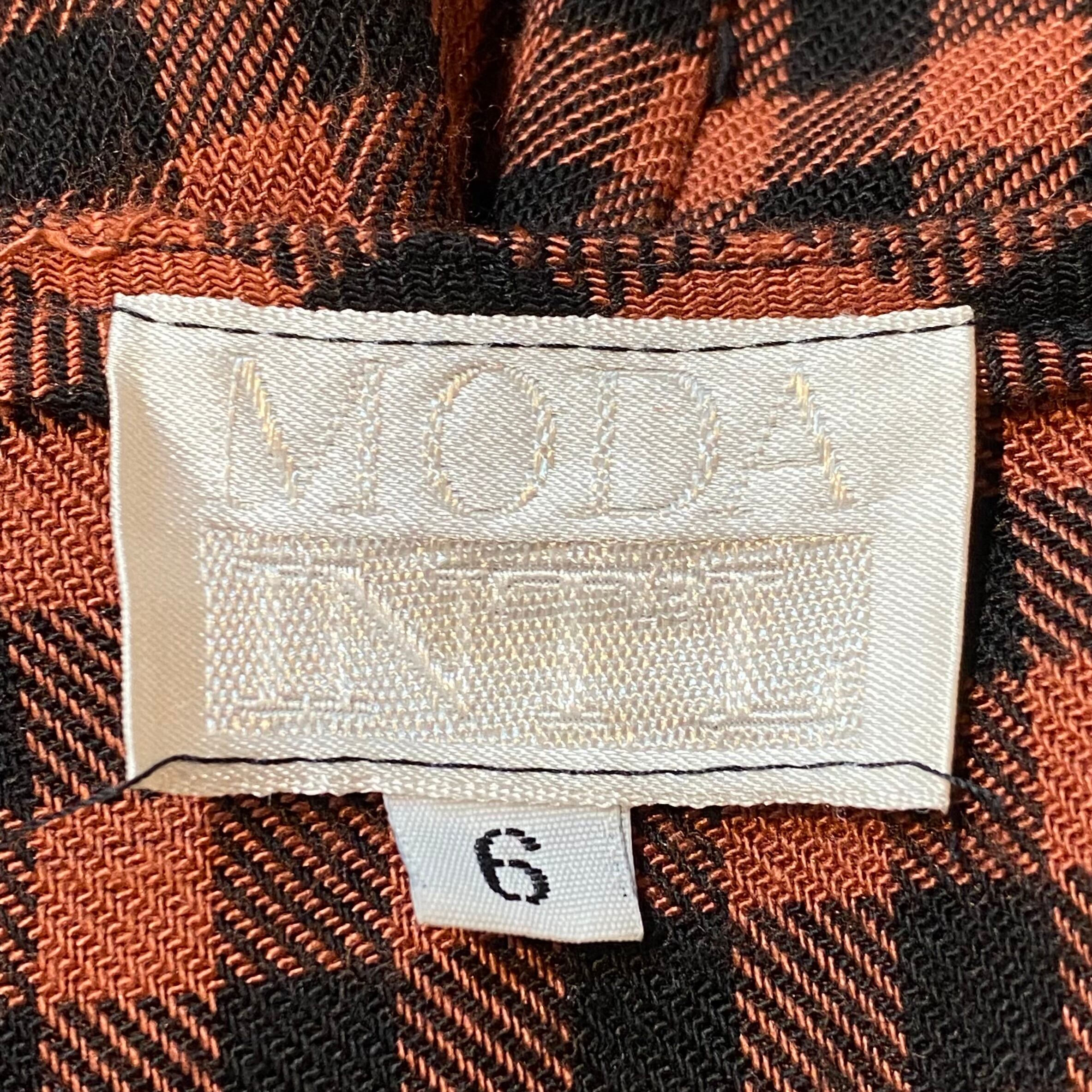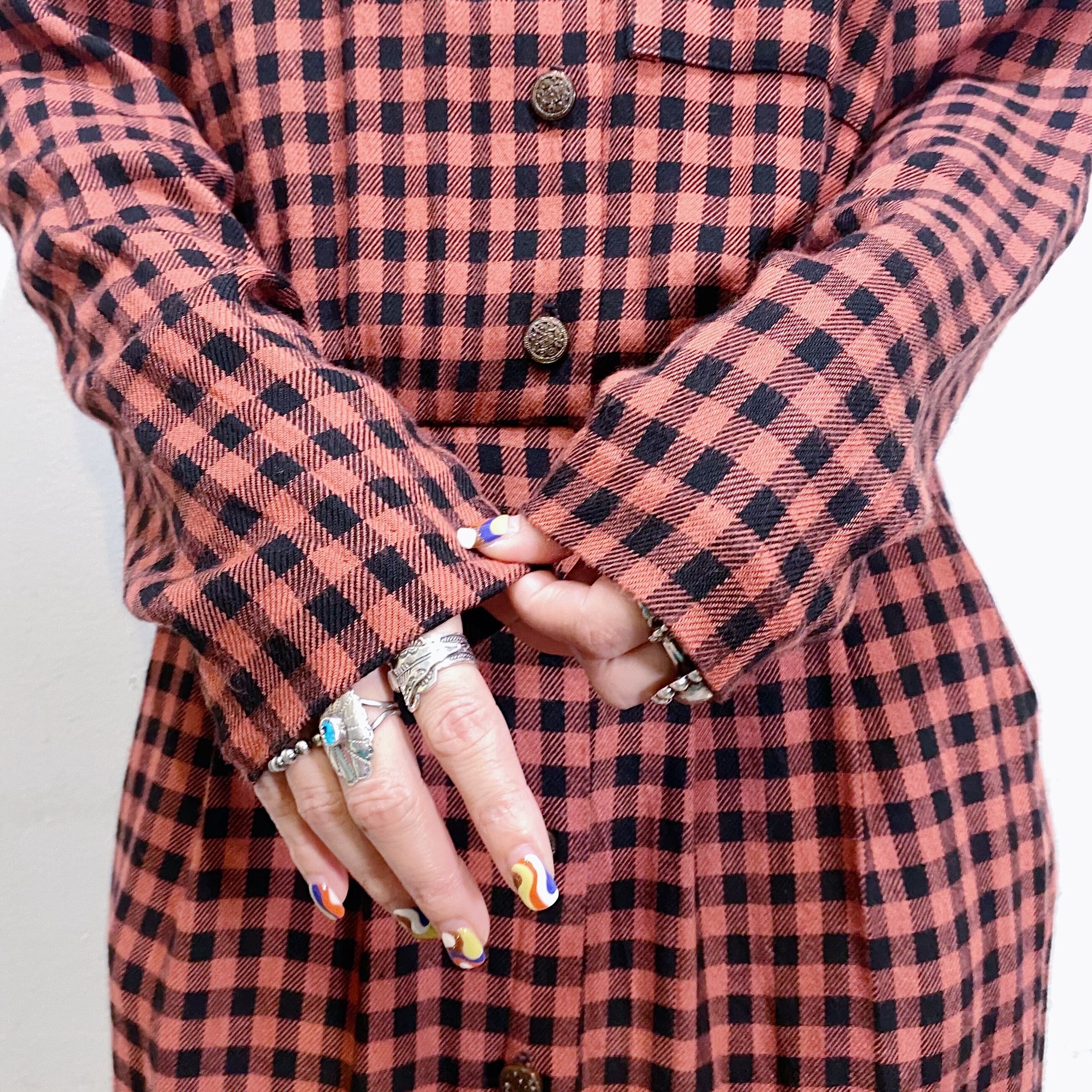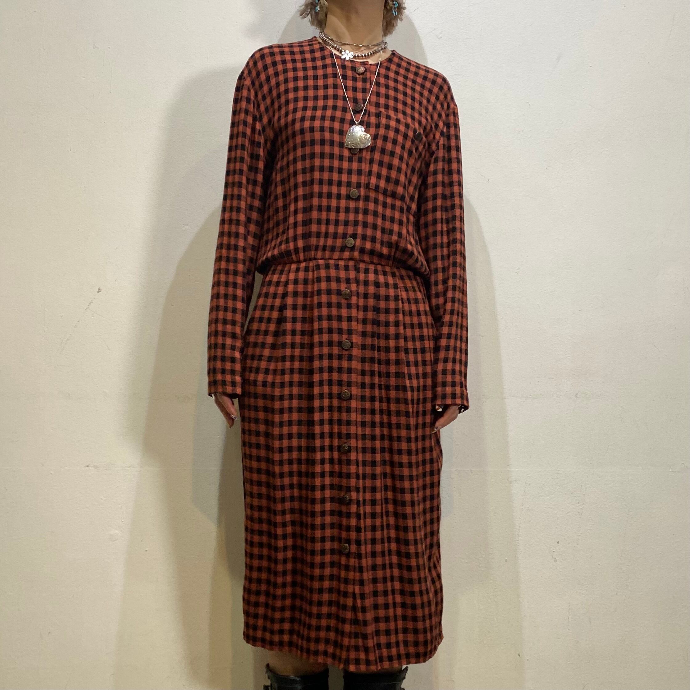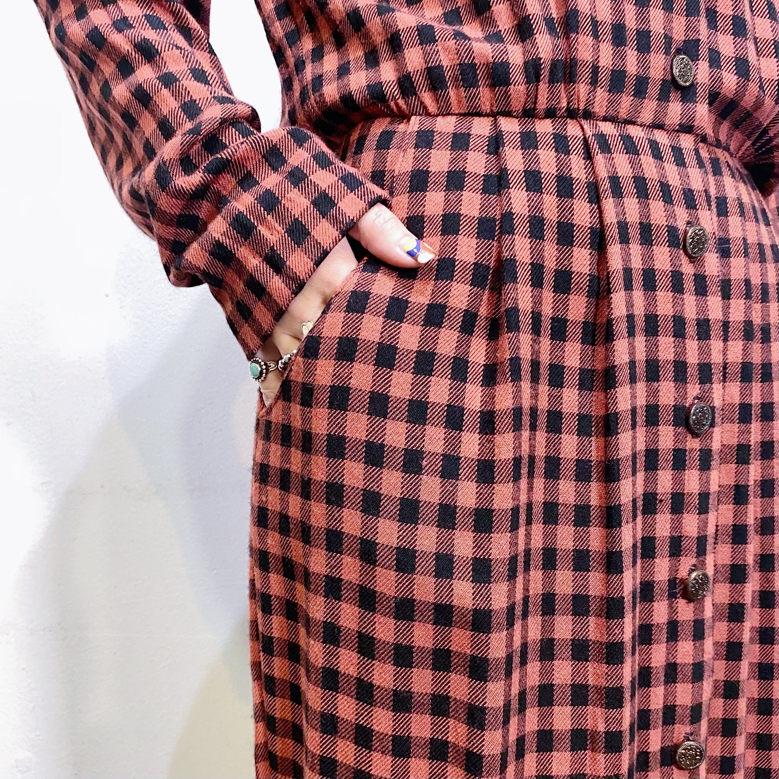 ブラウンとオレンジの中間のような色合いが可愛い、80年代のチェック柄ワンピースです。