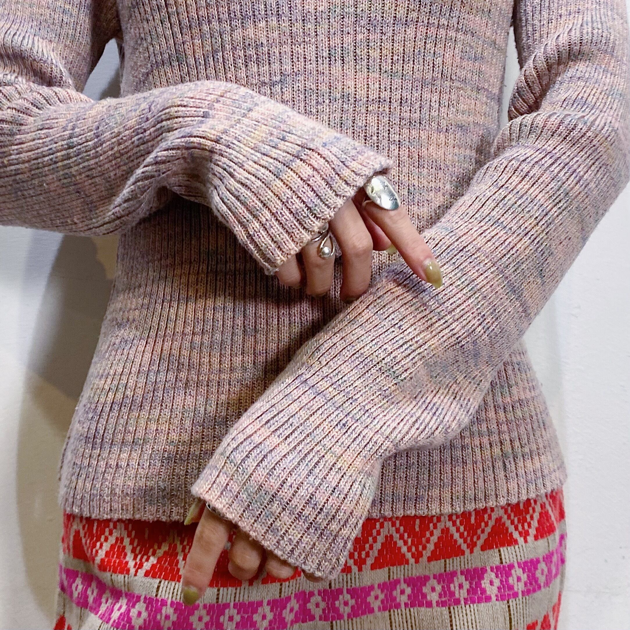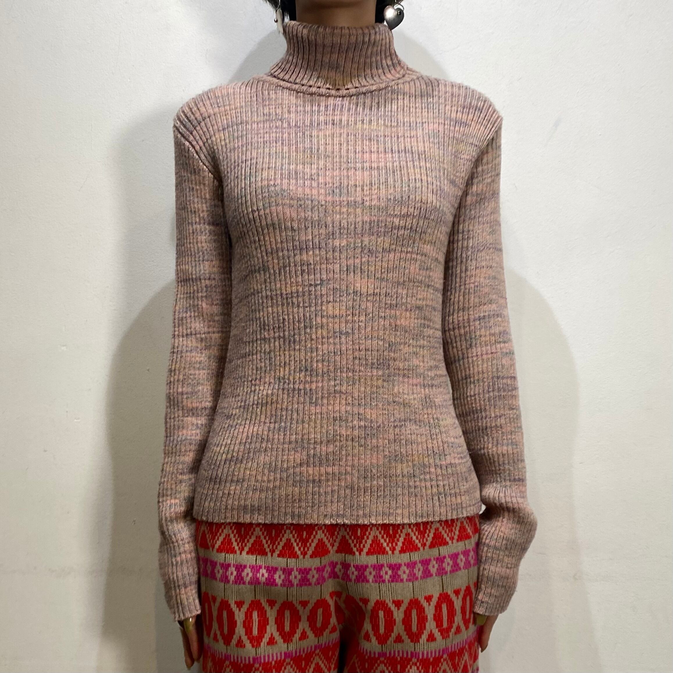 淡いピンクのミックスカラーが可愛い、ハイネックセーターです。